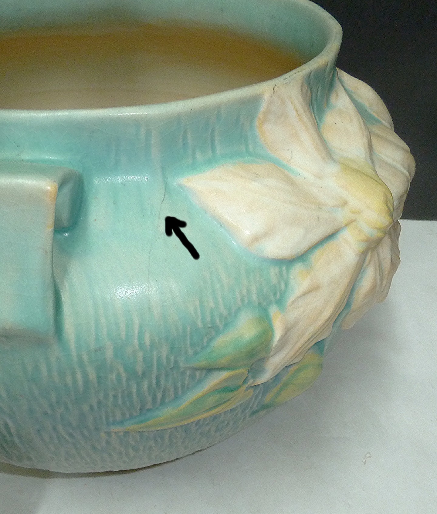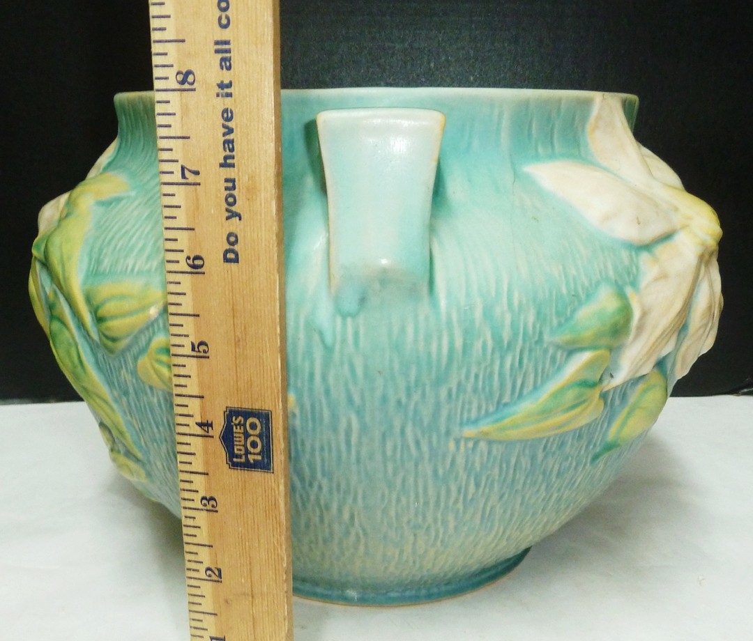 Notes: Good looking, see chip on lower rim, small old hairline that has not traveled, ready to use attractive jardiniere