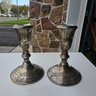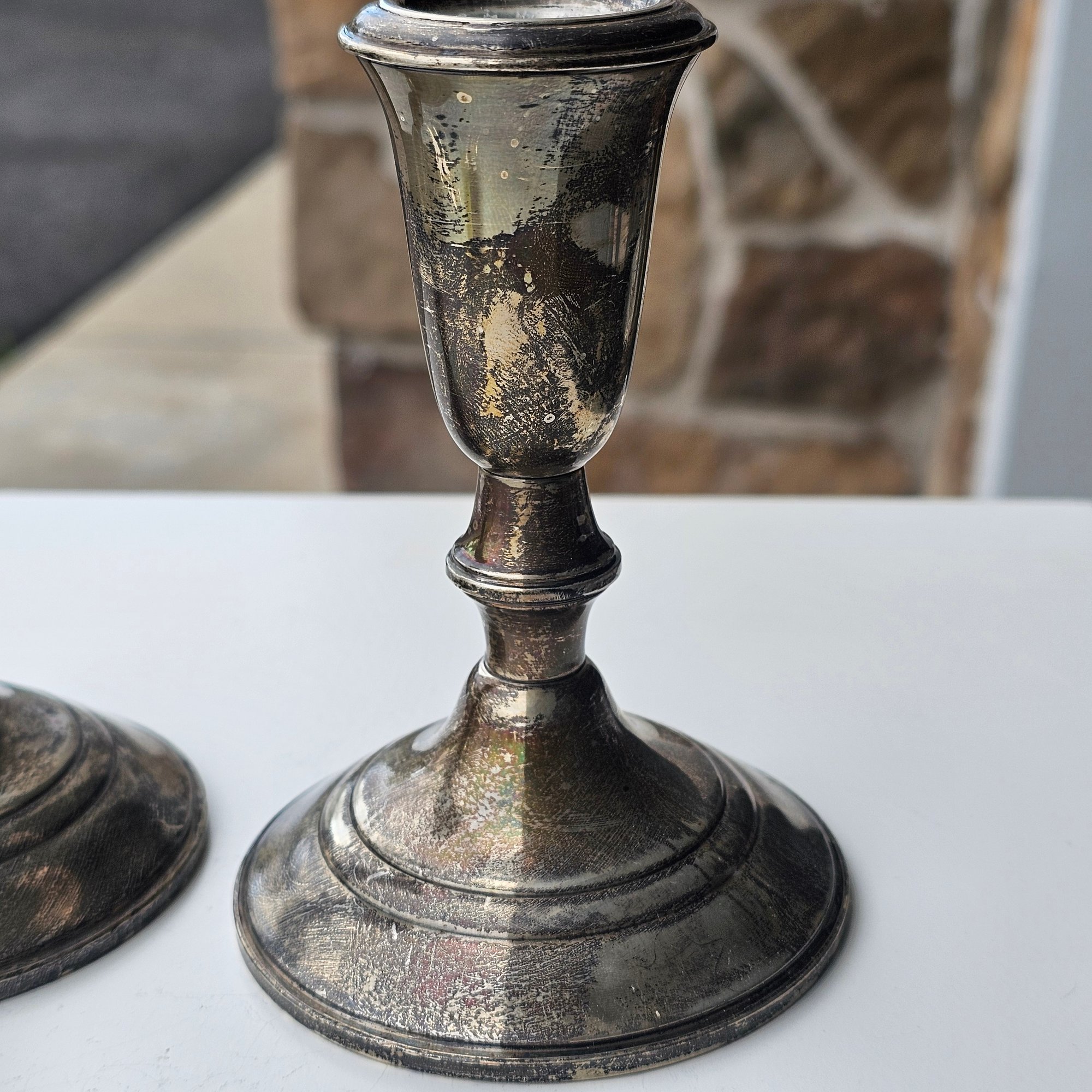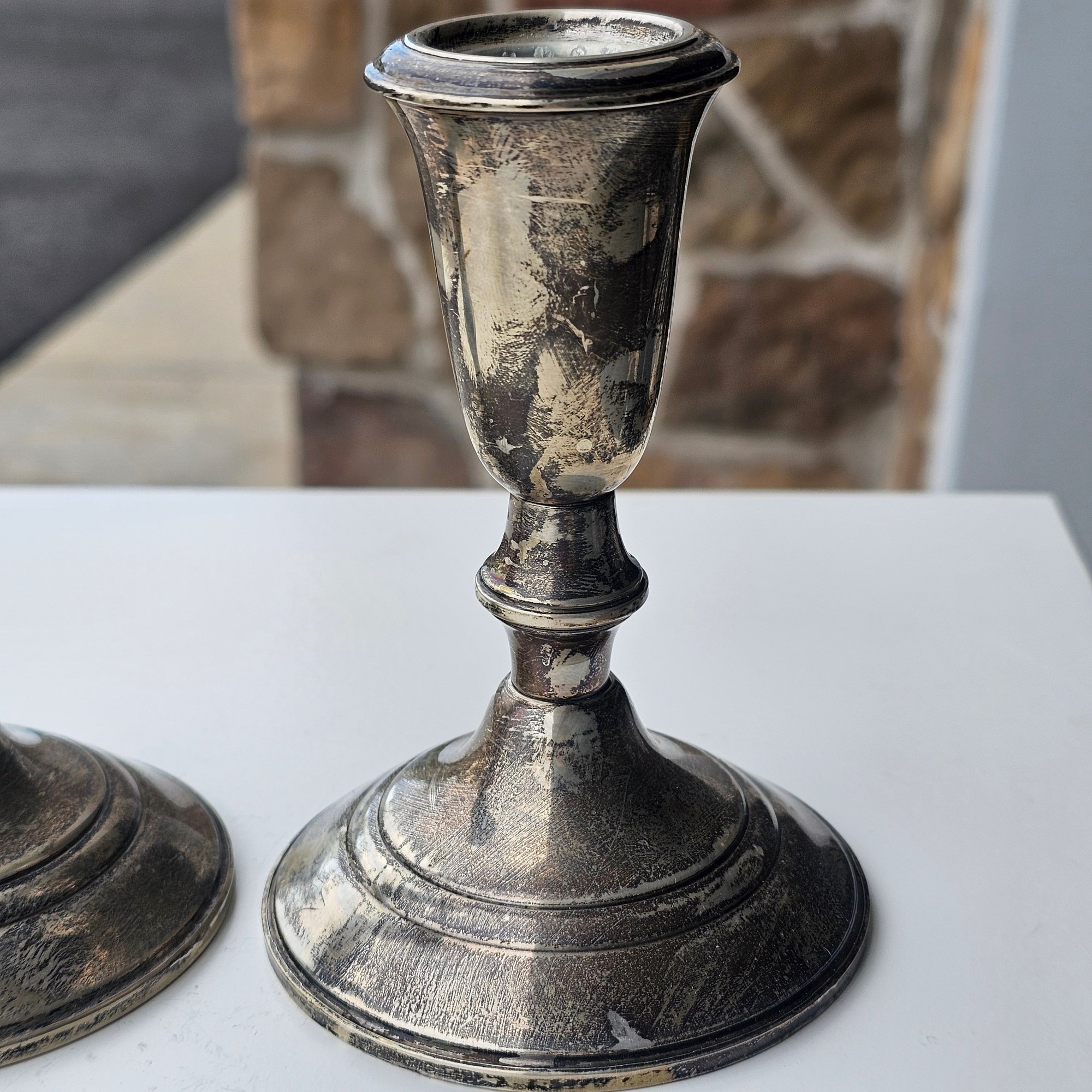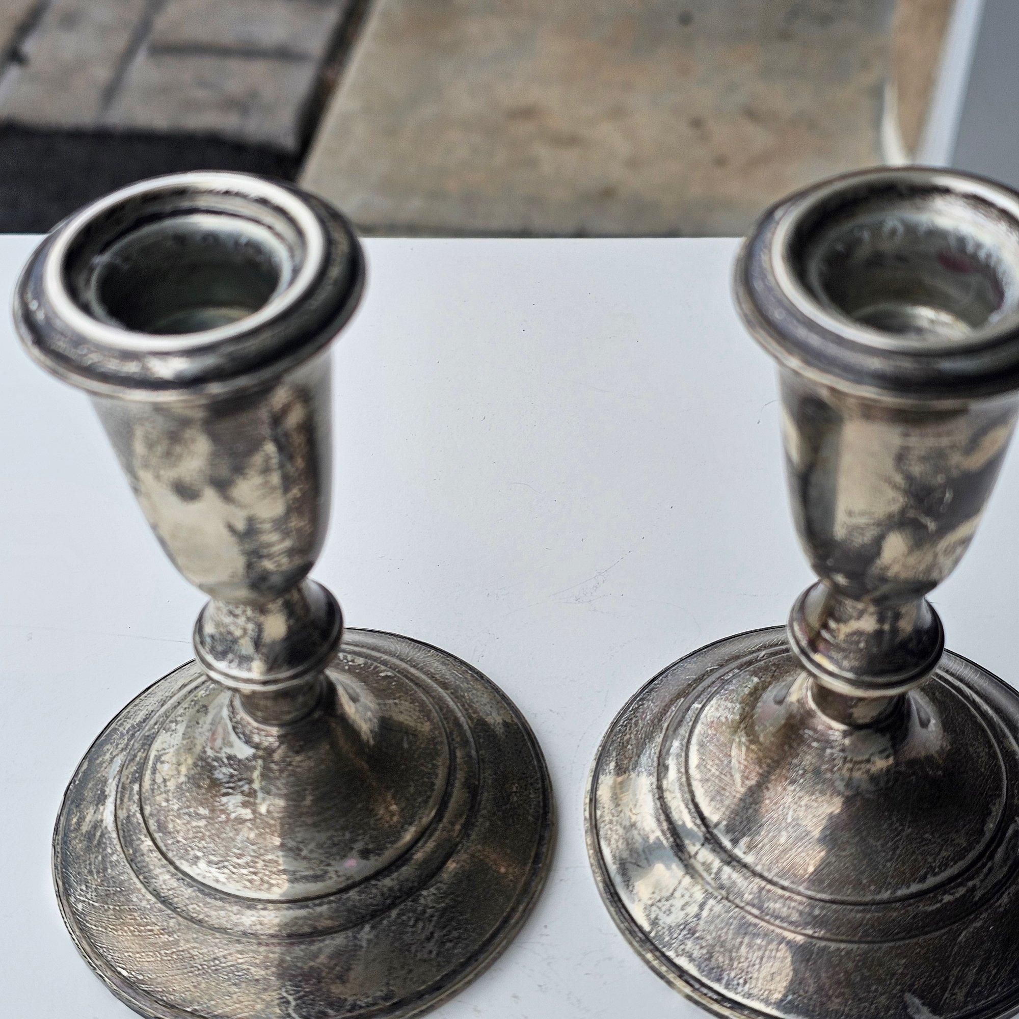 Elegant pair of Crown brand weighted sterling silver candlesticks featuring a classic, timeless design with stepped round bases. Marked “Crown Sterling Weighted” on the underside. Perfect for formal dining, décor accents, or collectors of fine silver.