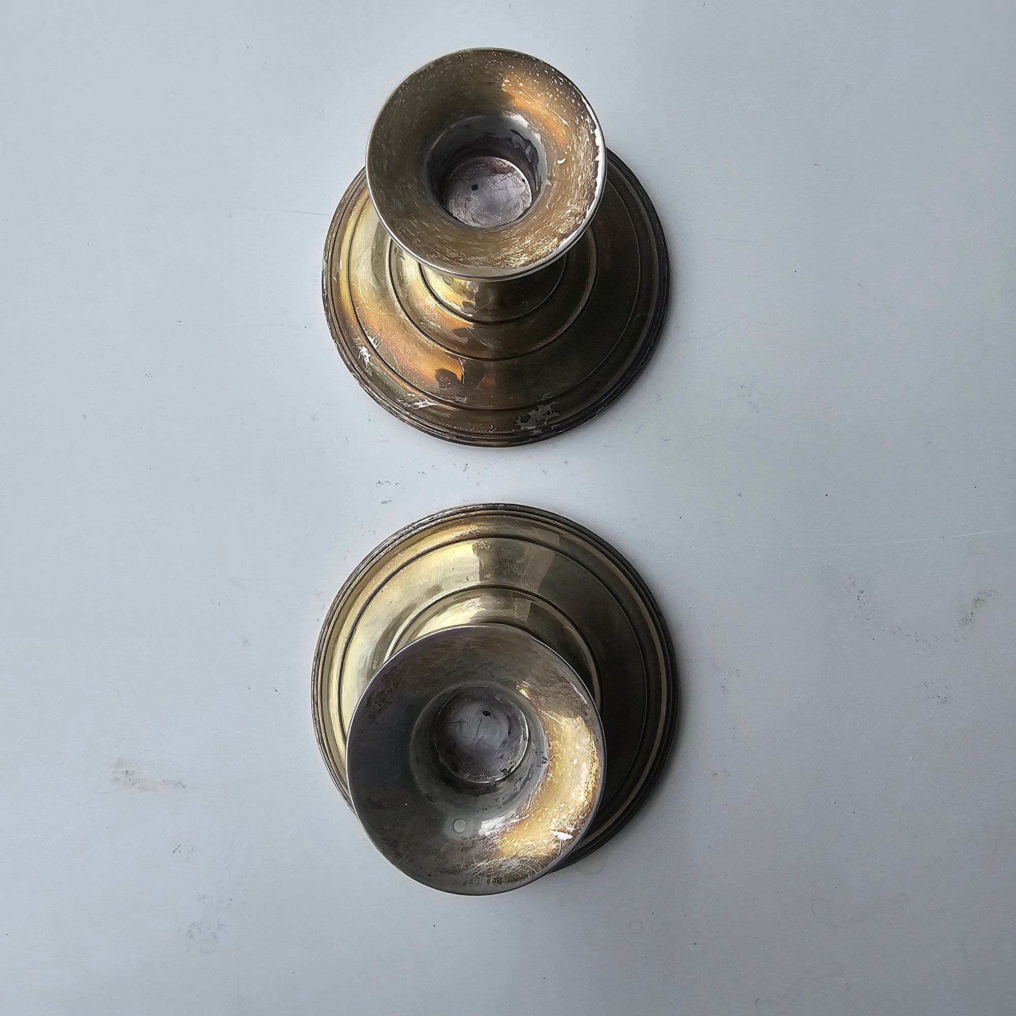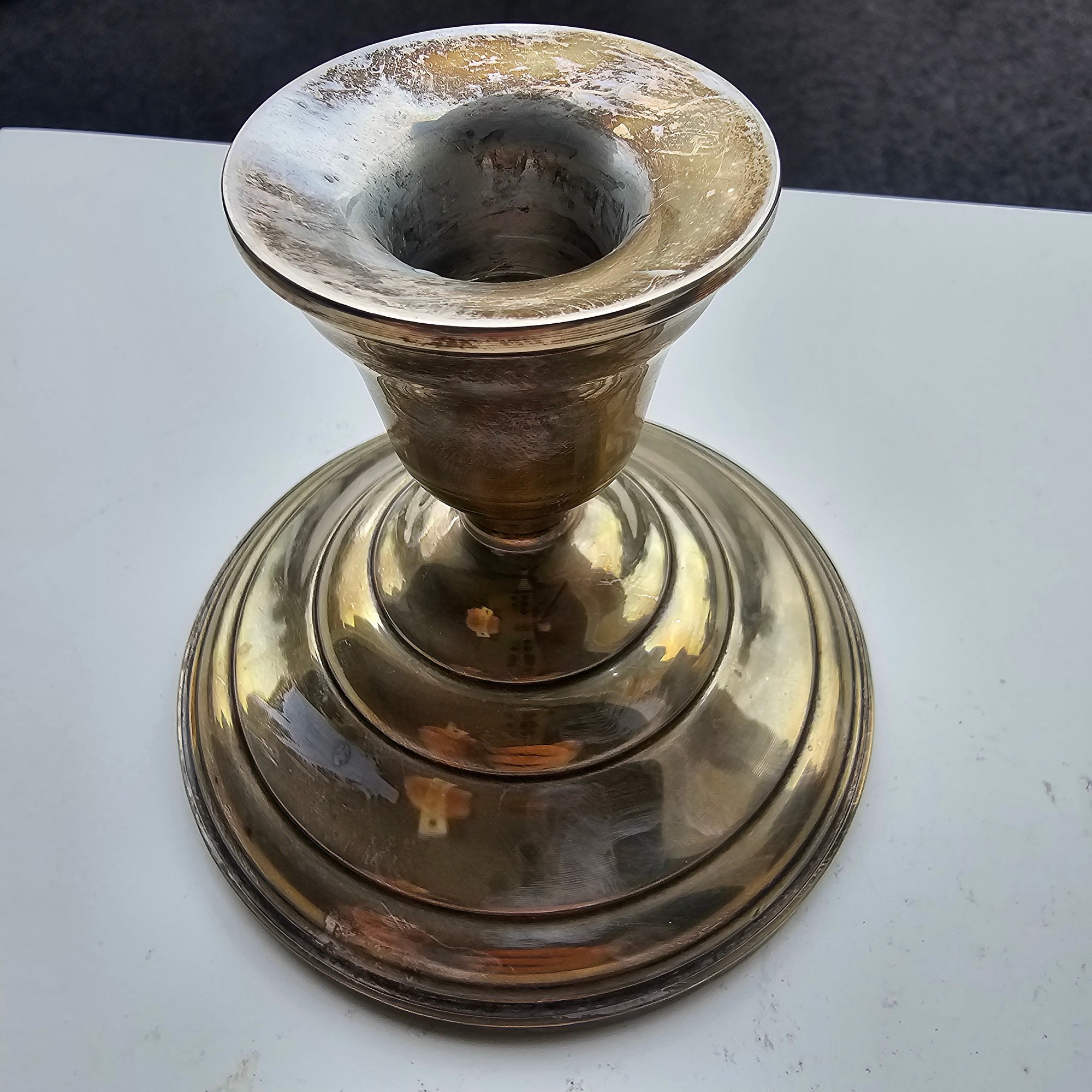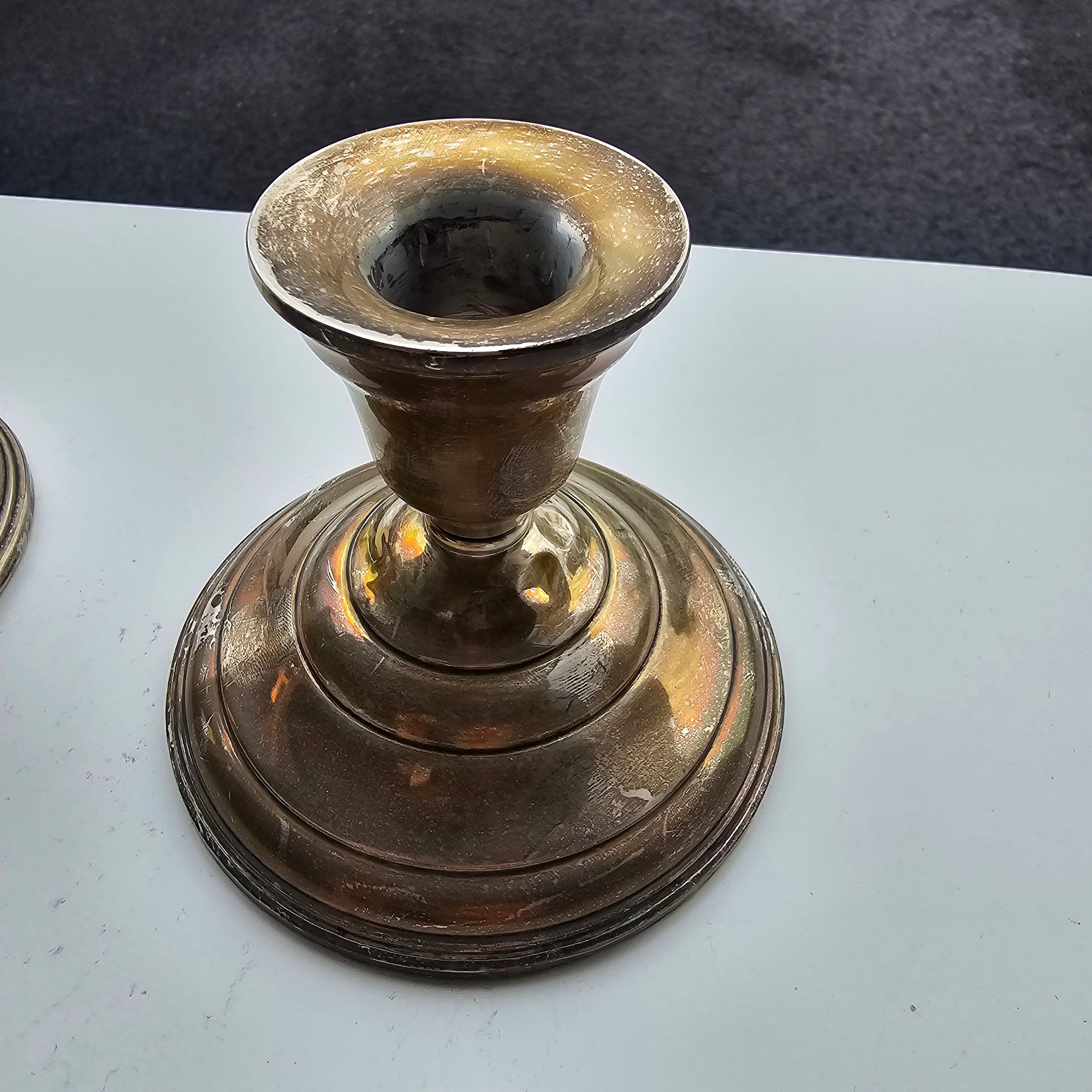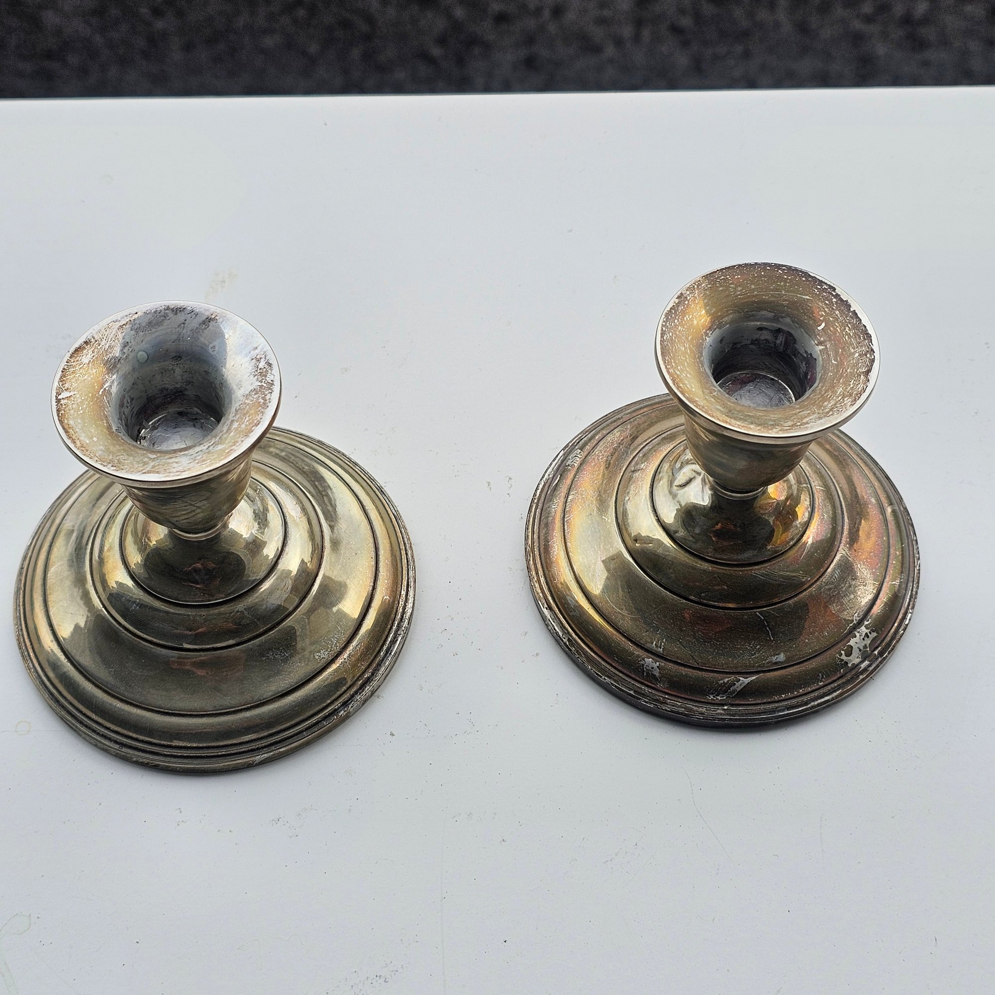 Vintage pair of sterling weighted candlesticks featuring a classic tiered base and simple elegant form. Marked “STERLING WEIGHTED 80” on underside—great for display or formal table settings.
