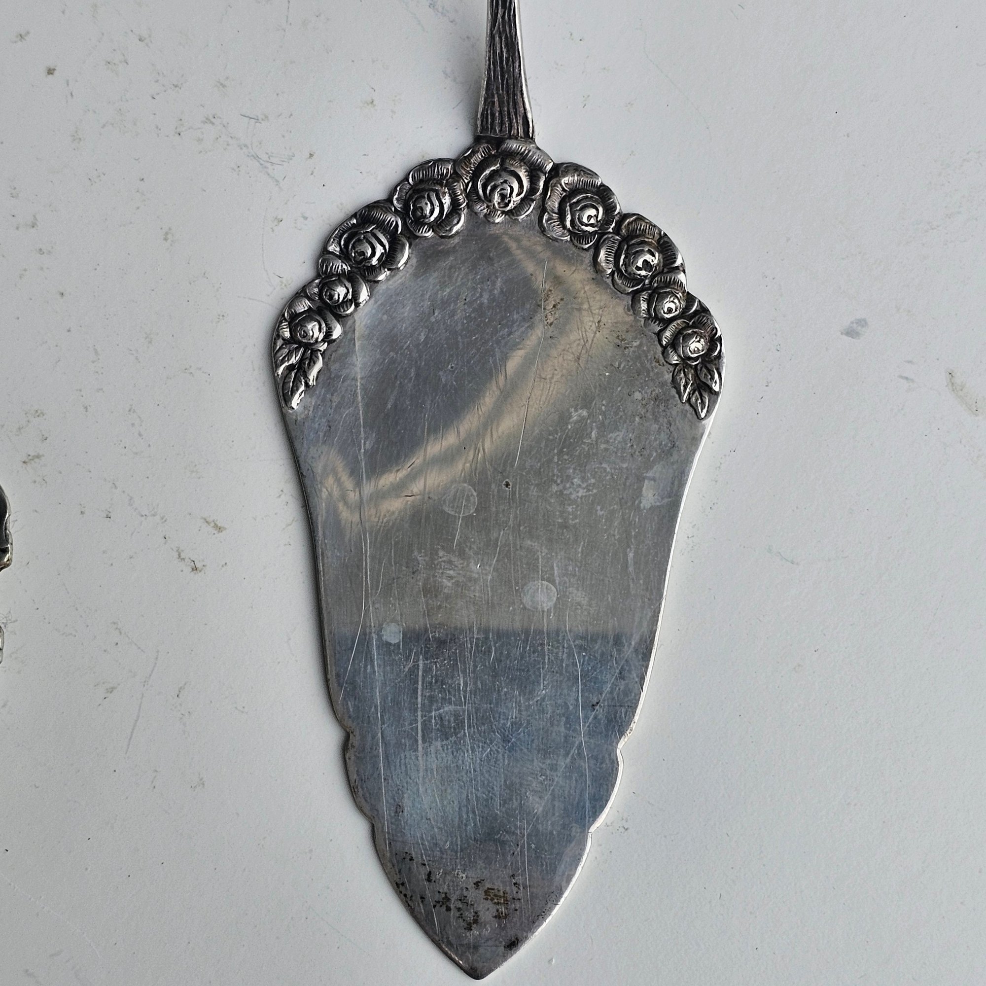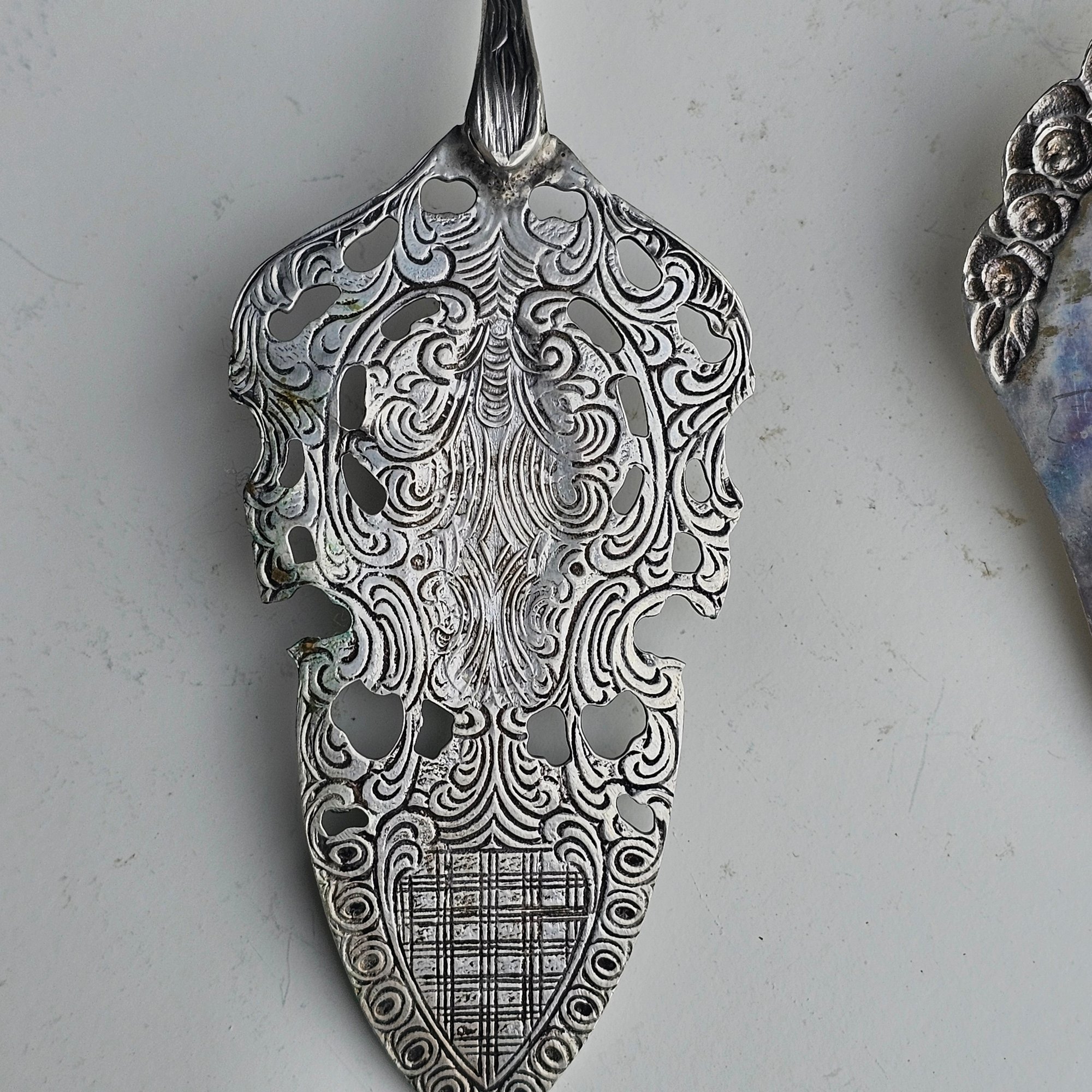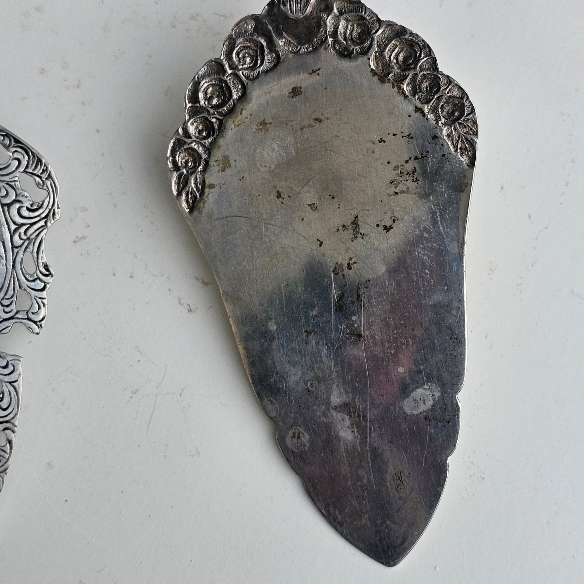 Elegant antique 2-piece serving set featuring a cake server and pie server crafted in 800 silver. Both pieces showcase ornate floral and scrollwork detailing with pierced design on the pie server and rose motif handles. Marked “Antiko 800,” indicating European silver content. A সুন্দর decorative set perfect for serving or display.