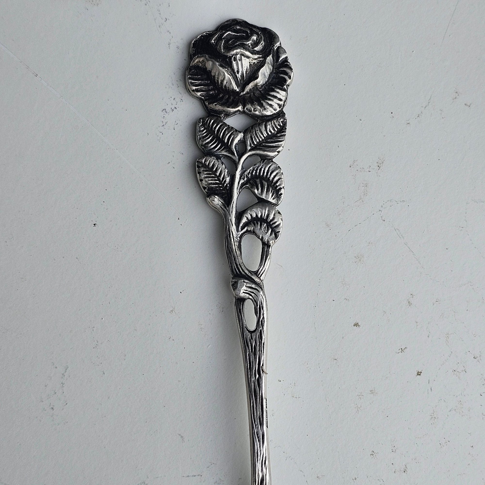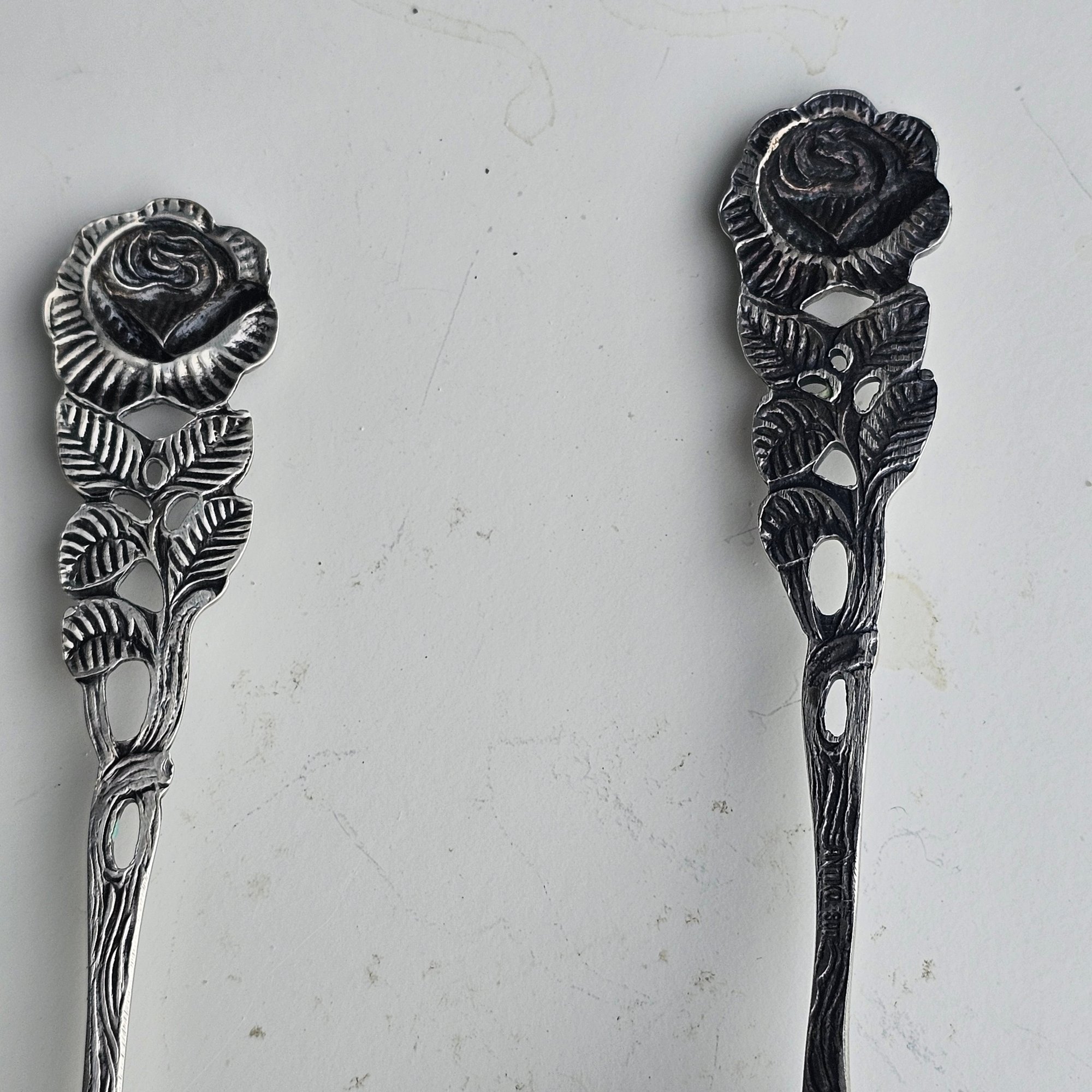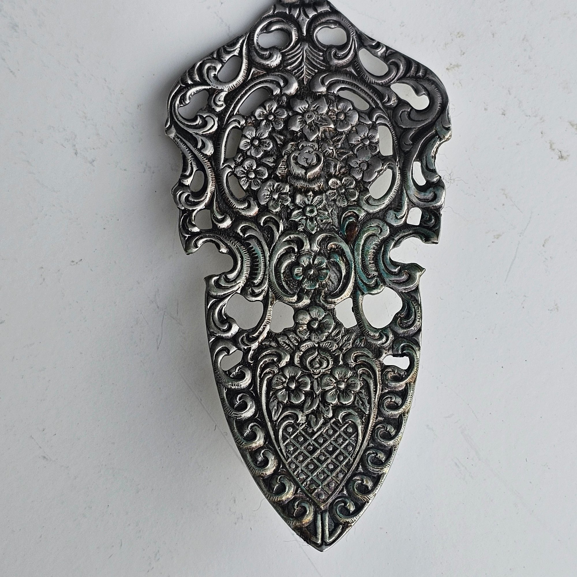 Elegant antique 2-piece serving set featuring a cake server and pie server crafted in 800 silver. Both pieces showcase ornate floral and scrollwork detailing with pierced design on the pie server and rose motif handles. Marked “Antiko 800,” indicating European silver content. A সুন্দর decorative set perfect for serving or display.