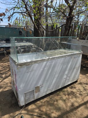 Large commercial ice cream display freezer with curved glass top for easy product viewing. Branded exterior (Perry’s, Breyers, Turkey Hill) makes it ideal for retail or concession use. Spacious interior designed to hold multiple tubs of ice cream or frozen treats. Great for stores, events, or food service setups.