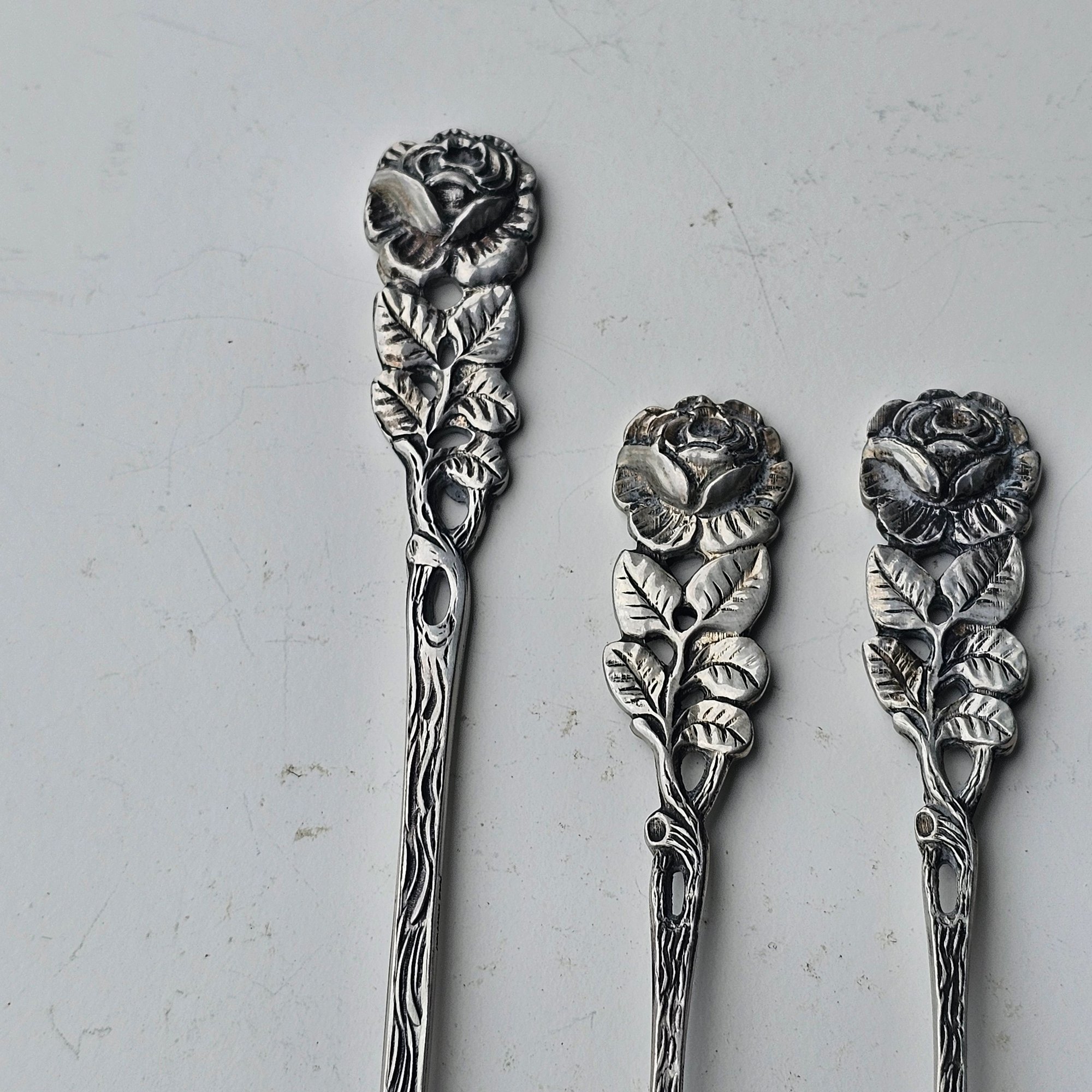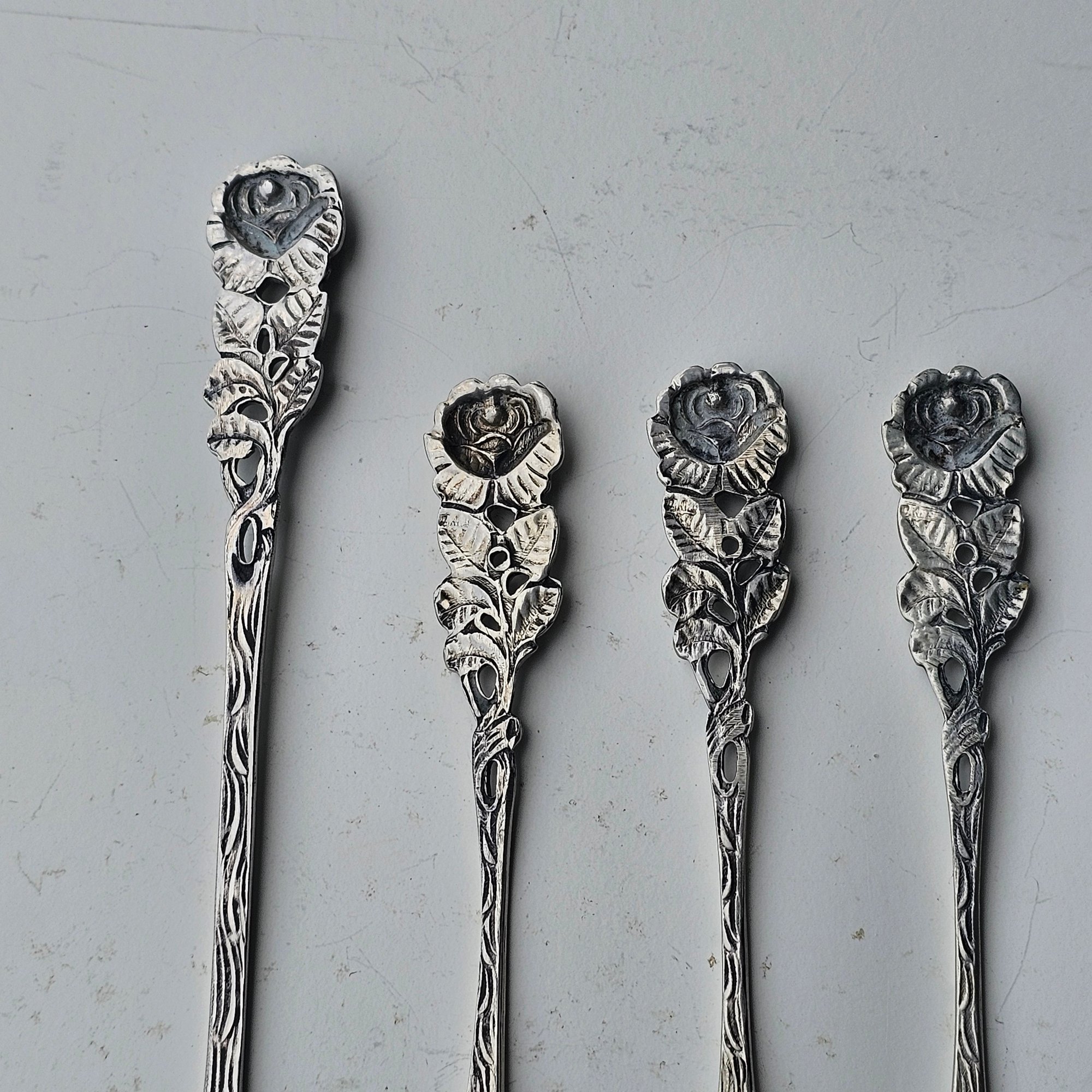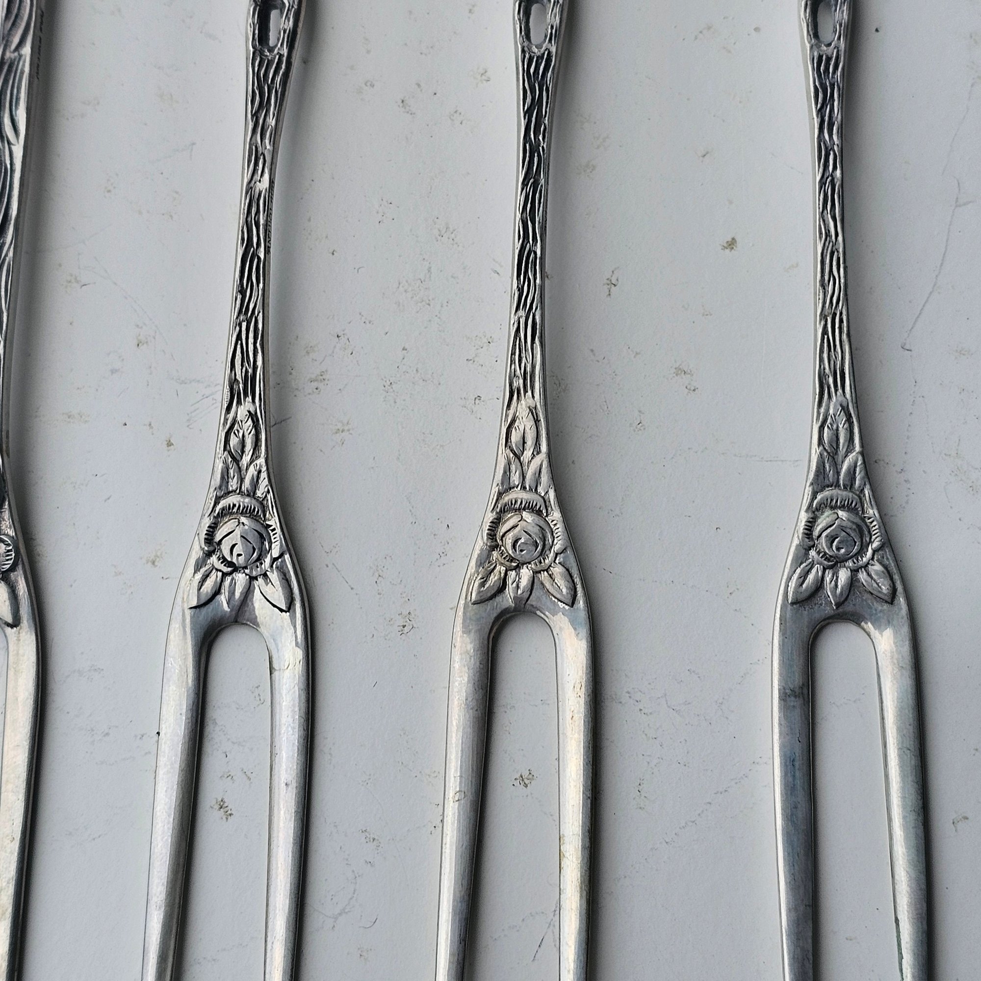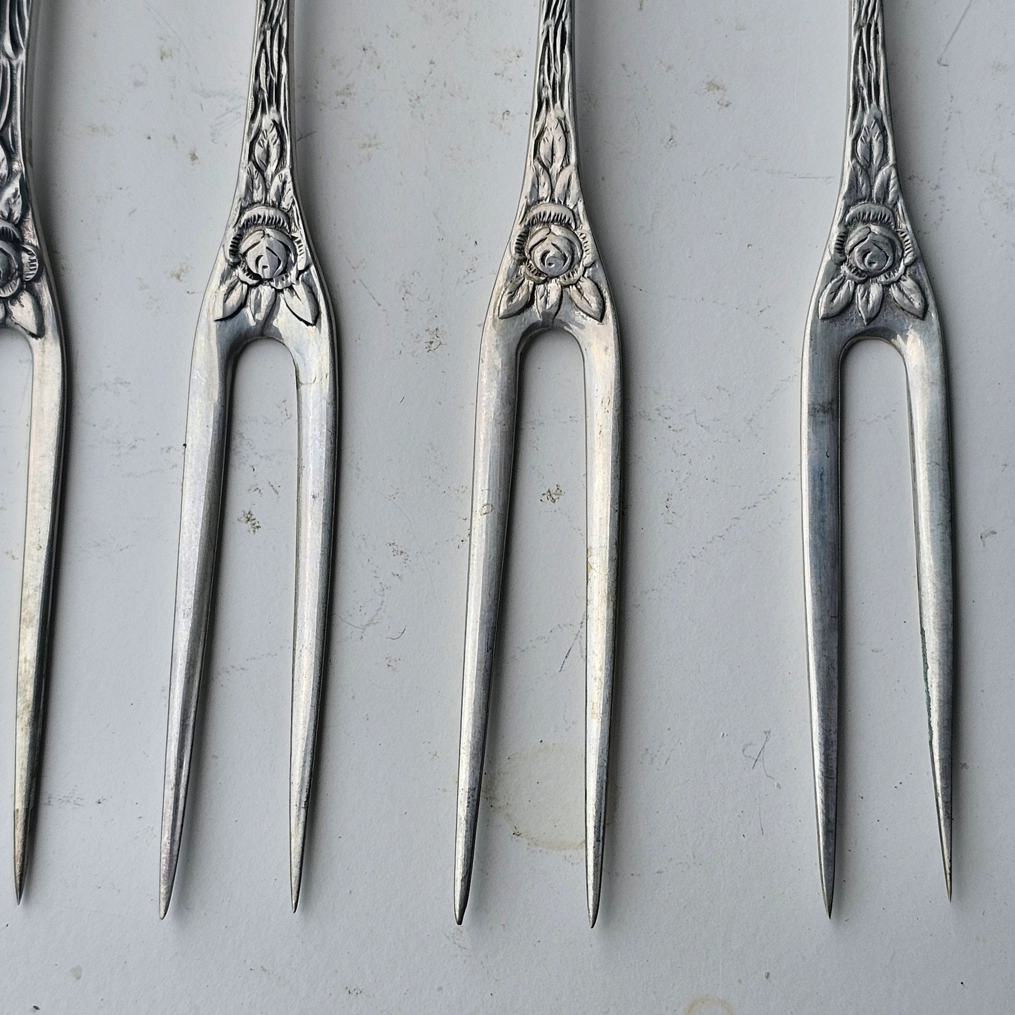 Charming set of four antique cocktail/seafood forks crafted in 800 silver and marked “Antiko 800.” Each fork features an elegant rose motif handle with detailed leaves and a long, slender stem. Includes two slightly different lengths (approx. 5.5" and 6"), adding character to this vintage set. A beautiful addition for collectors or refined table settings.