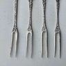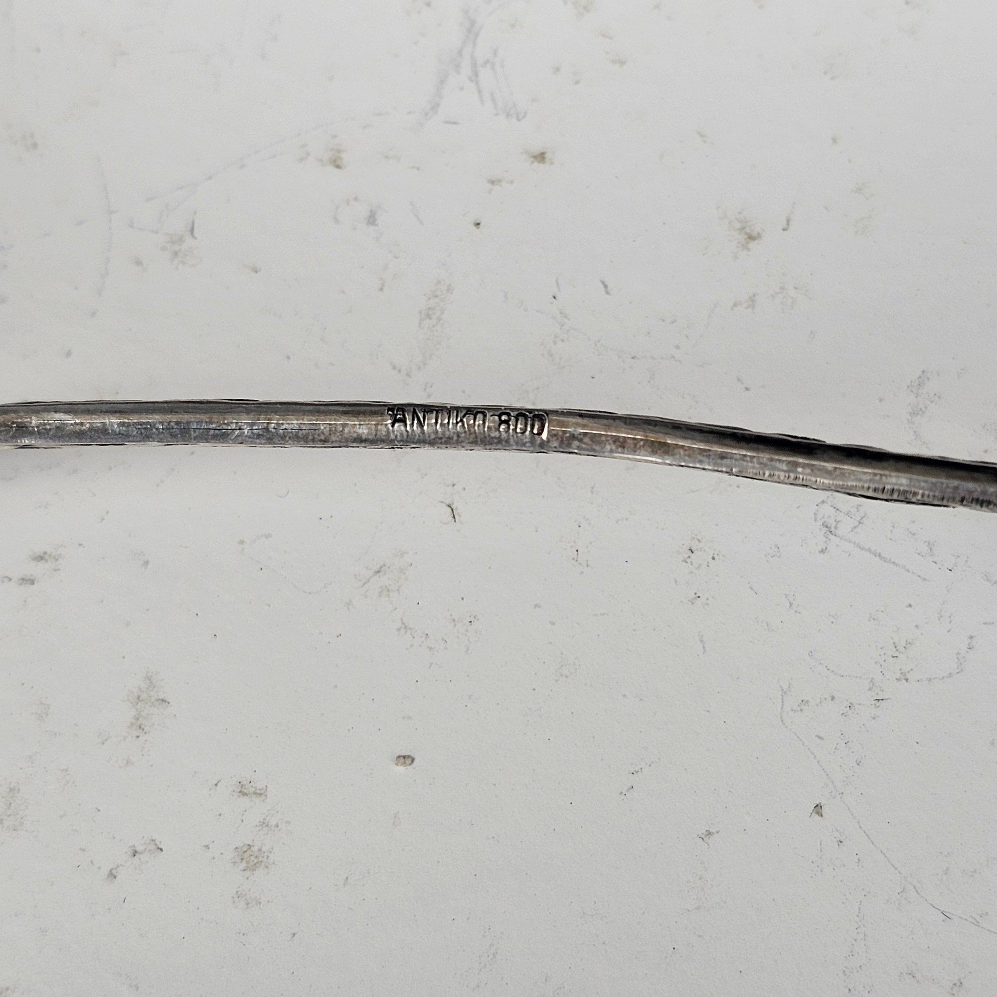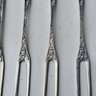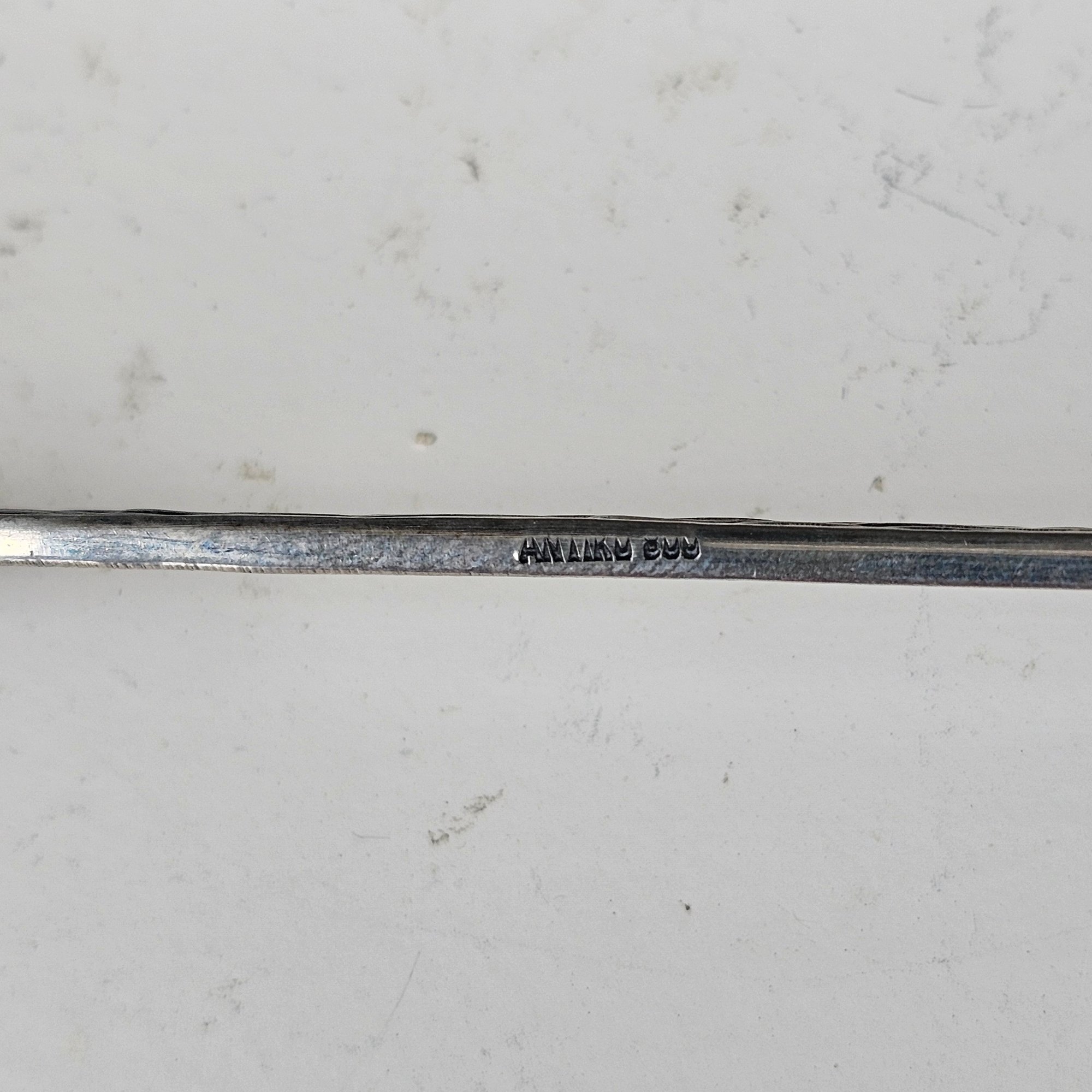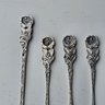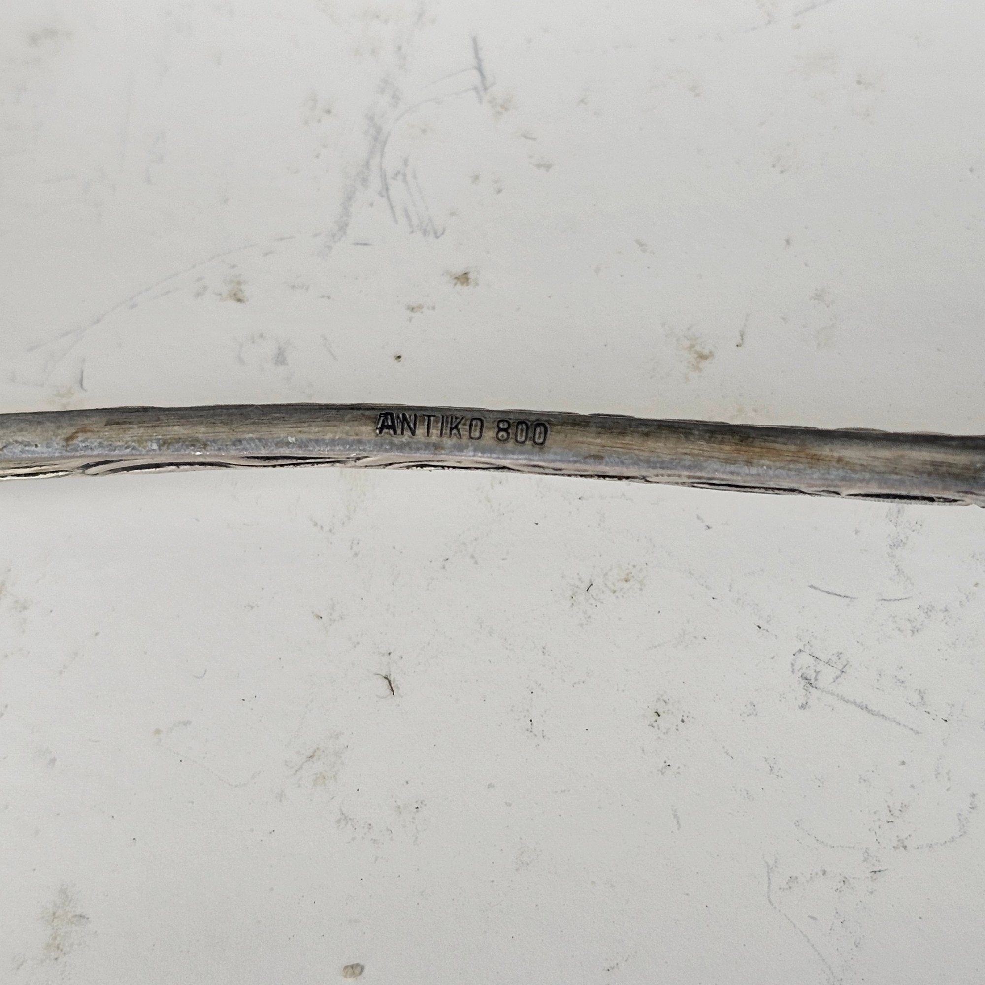 Charming set of four antique cocktail/seafood forks crafted in 800 silver and marked “Antiko 800.” Each fork features an elegant rose motif handle with detailed leaves and a long, slender stem. Includes two slightly different lengths (approx. 5.5" and 6"), adding character to this vintage set. A beautiful addition for collectors or refined table settings.