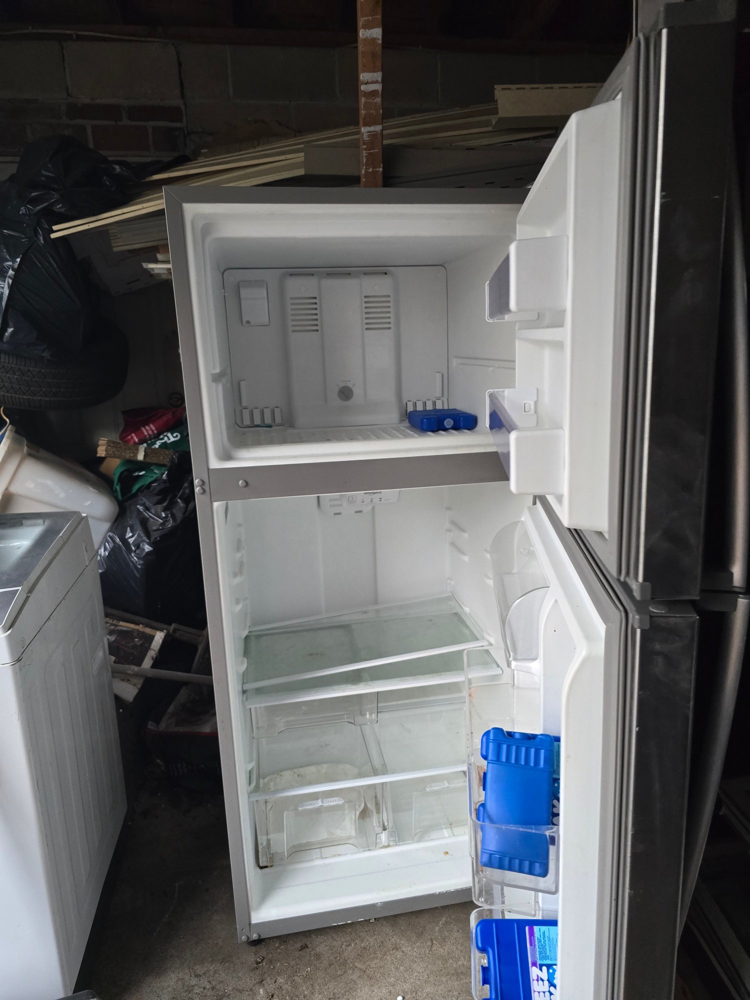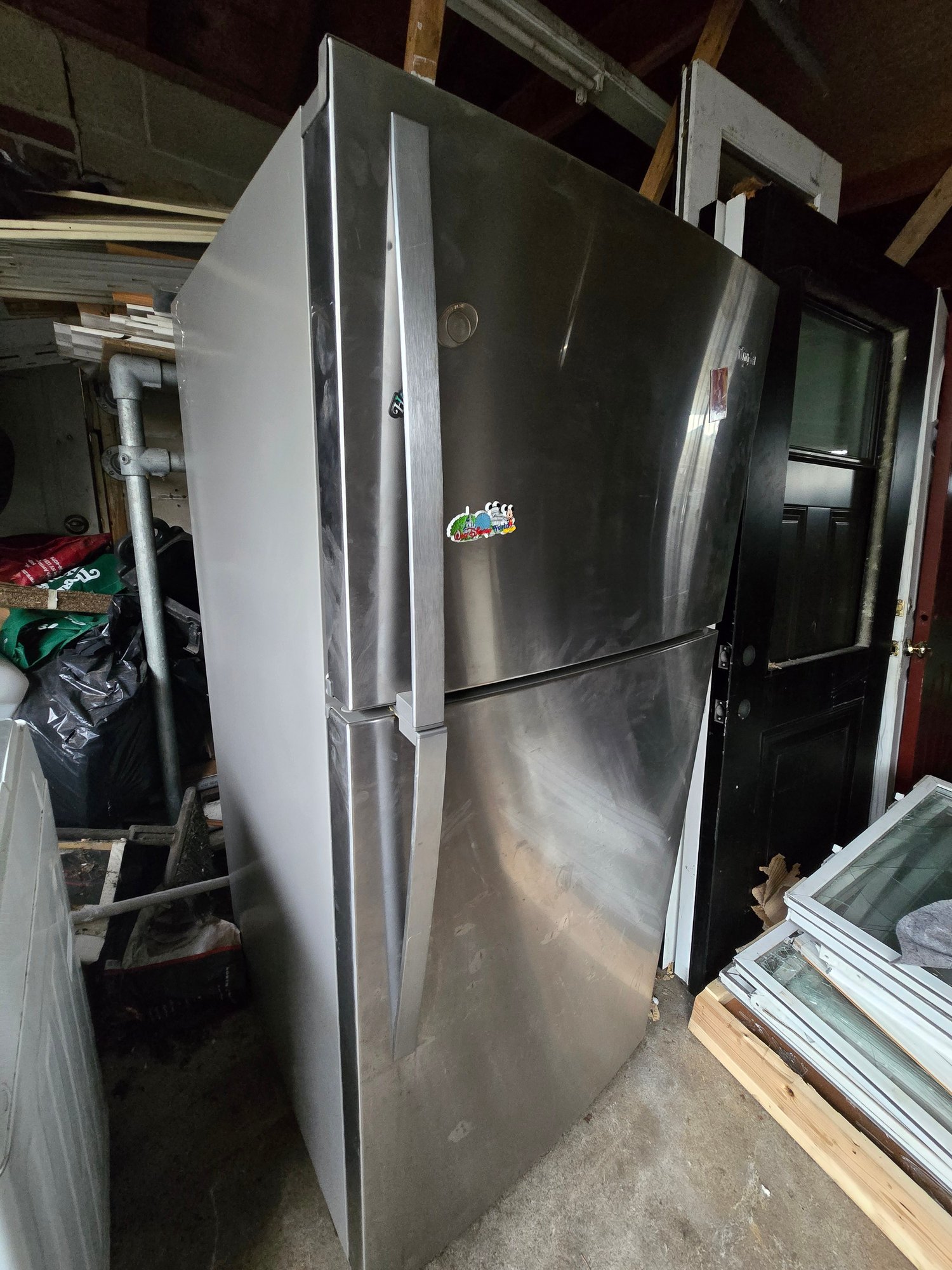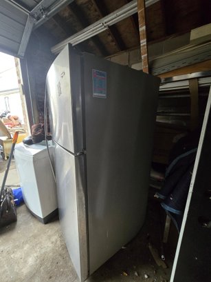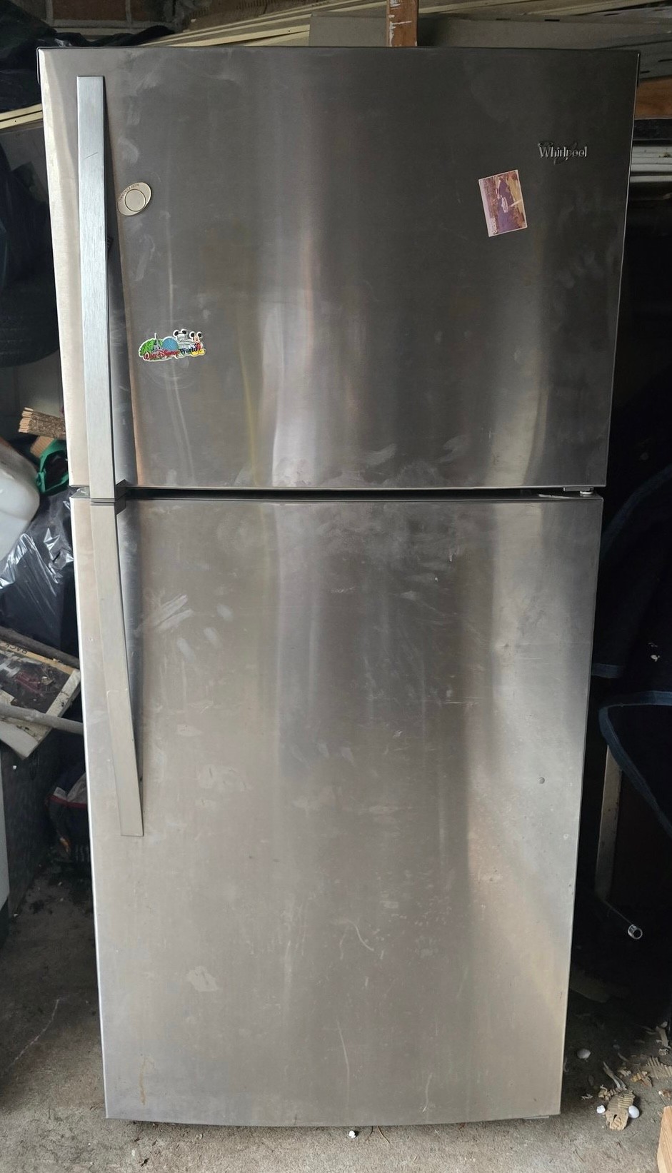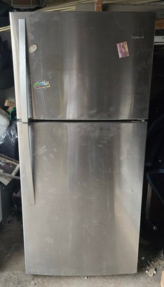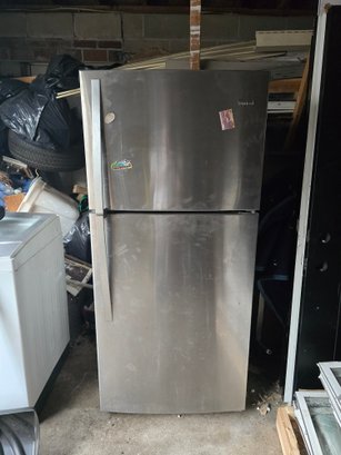 Whirlpool refrigerator with a stainless steel finish and top-freezer design. Spacious interior layout ideal for kitchen, garage, or extra food storage. Classic and reliable style.