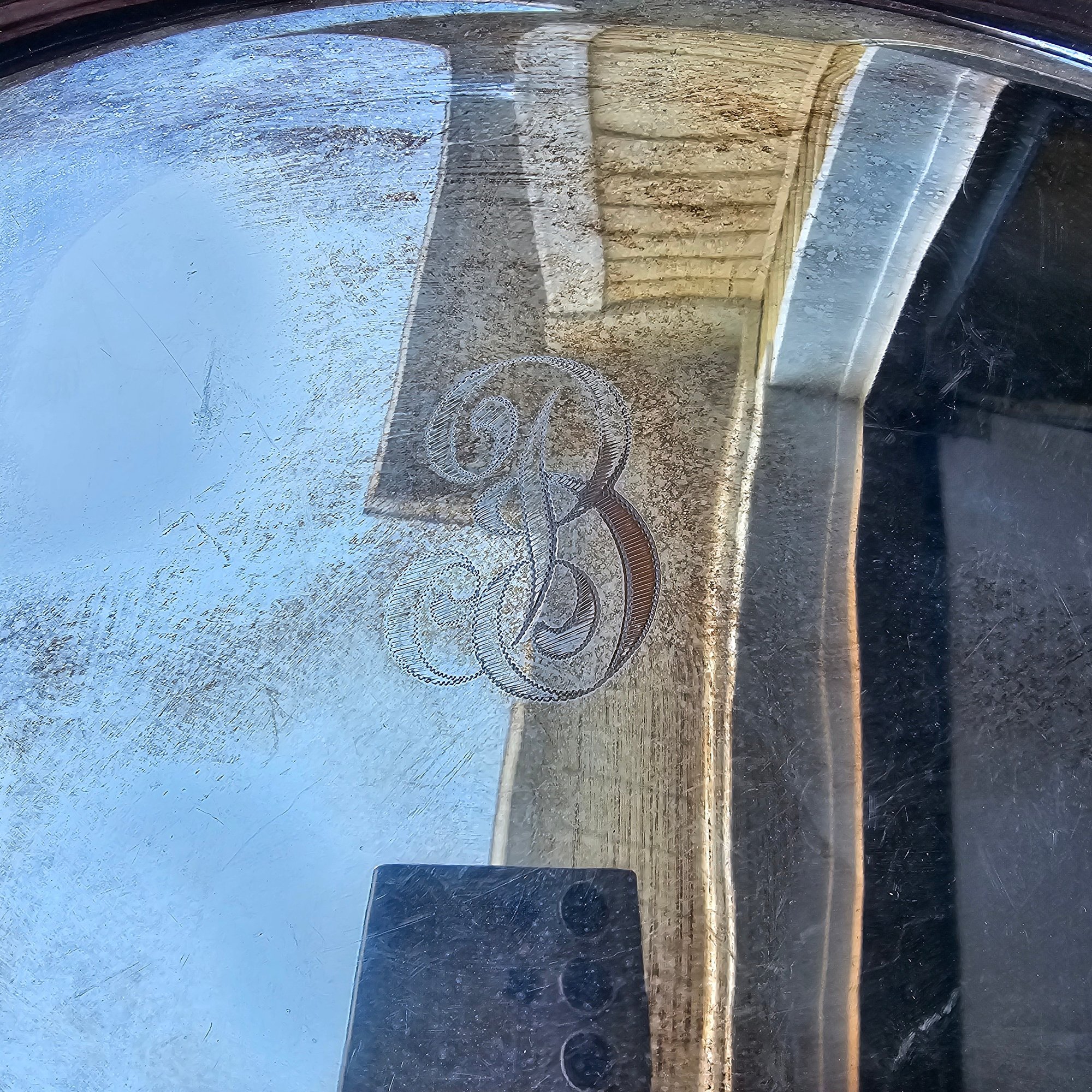 Heavy tarnish, spotting, and surface wear throughout from age and use. Visible patina and discoloration on all pieces; tray shows scratching and monogram. No major dents noted, but polishing is recommended.