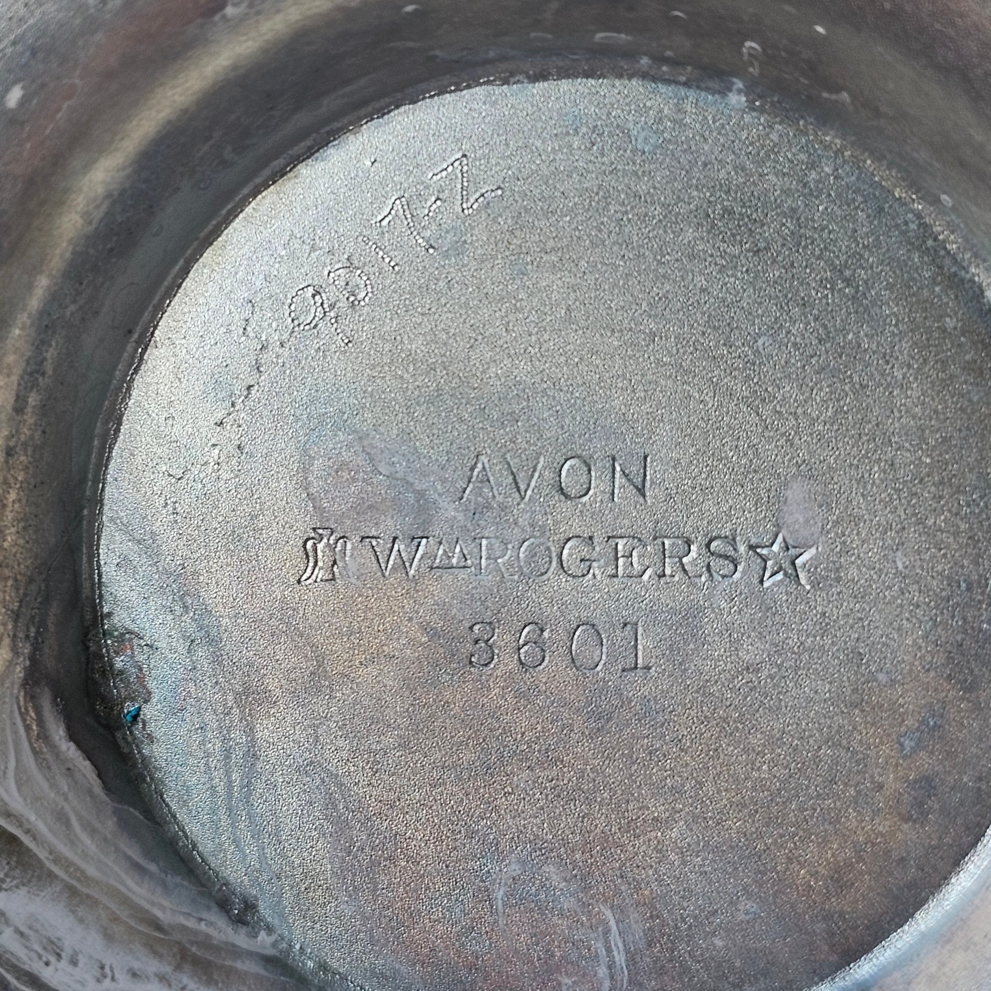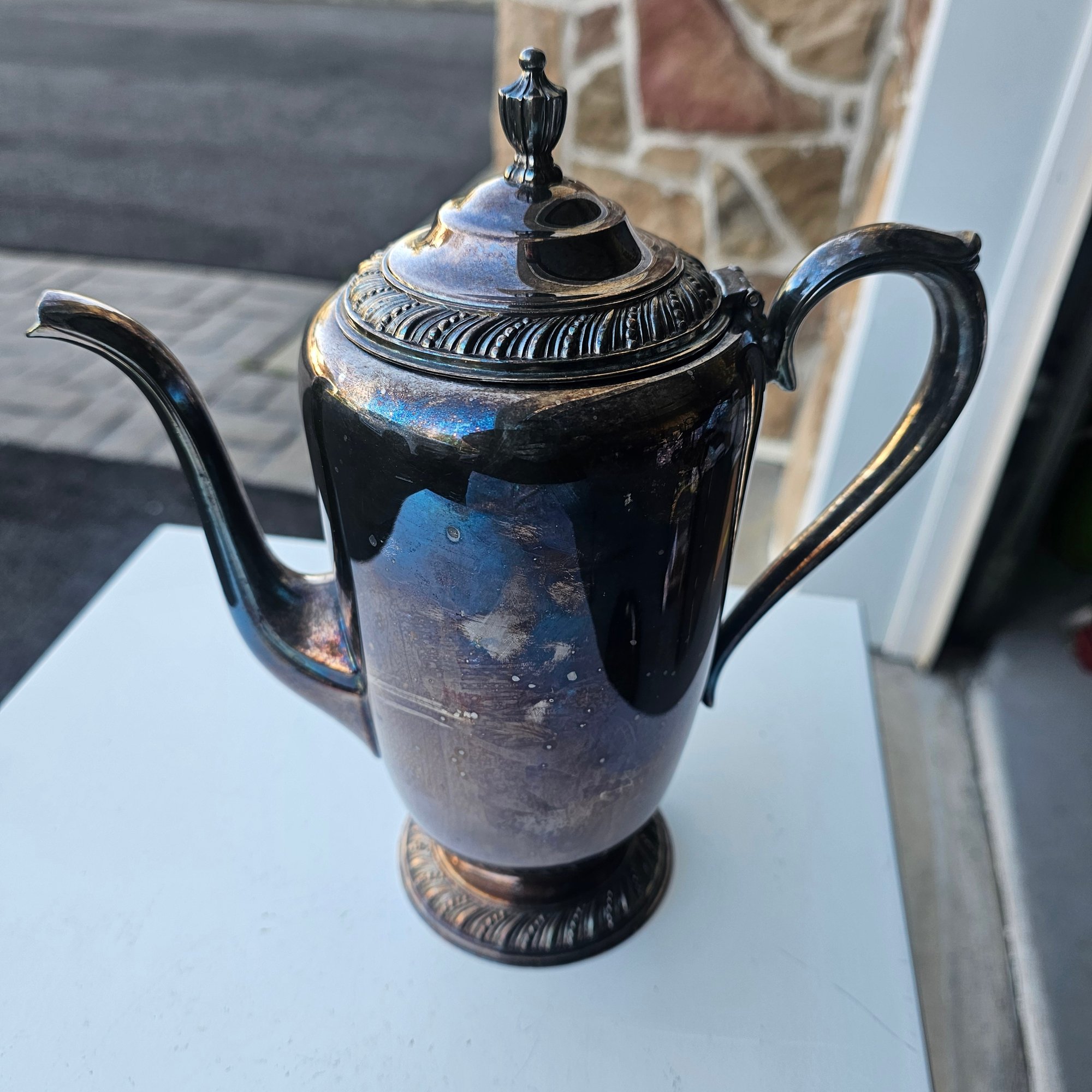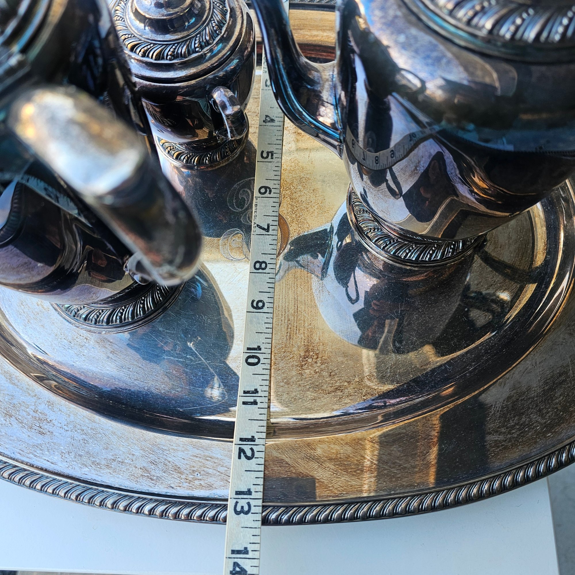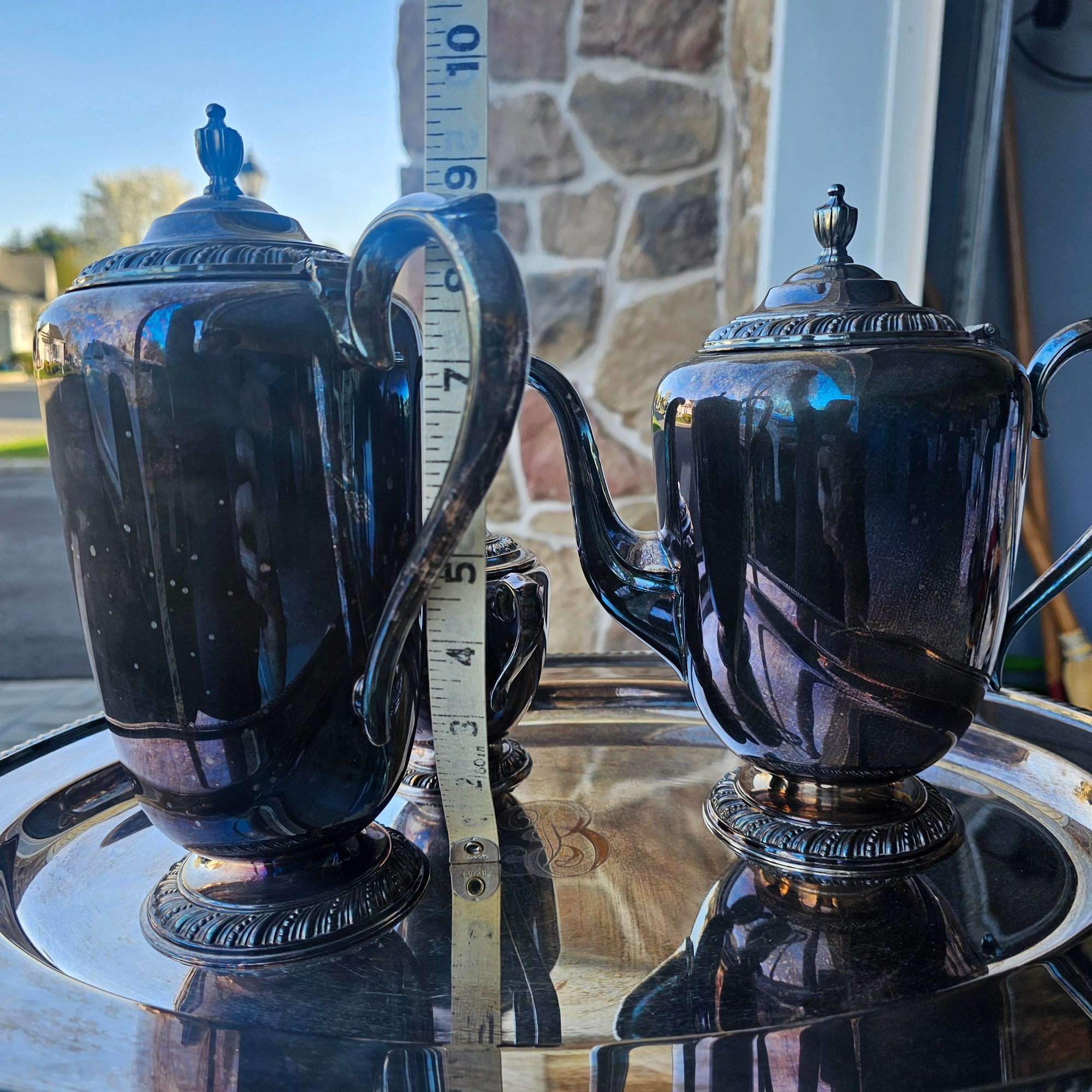 Vintage 4-piece silverplate tea/coffee service set by Wm. Rogers in the Avon pattern, including coffee pot, teapot, covered sugar bowl, and large serving tray. Tray is marked “Kenton Rogers 1709 18 IN” and features a monogrammed center. Classic ornate detailing with finial lids and decorative rims makes this a beautiful display or entertaining set.