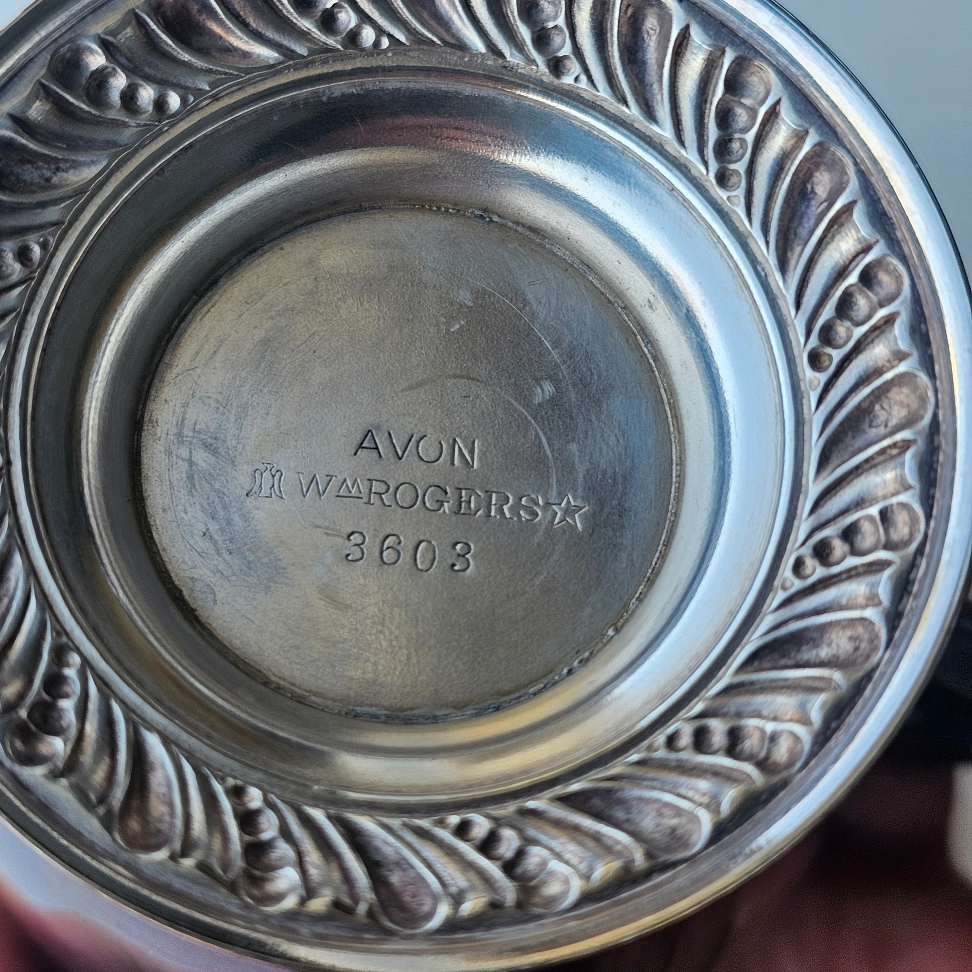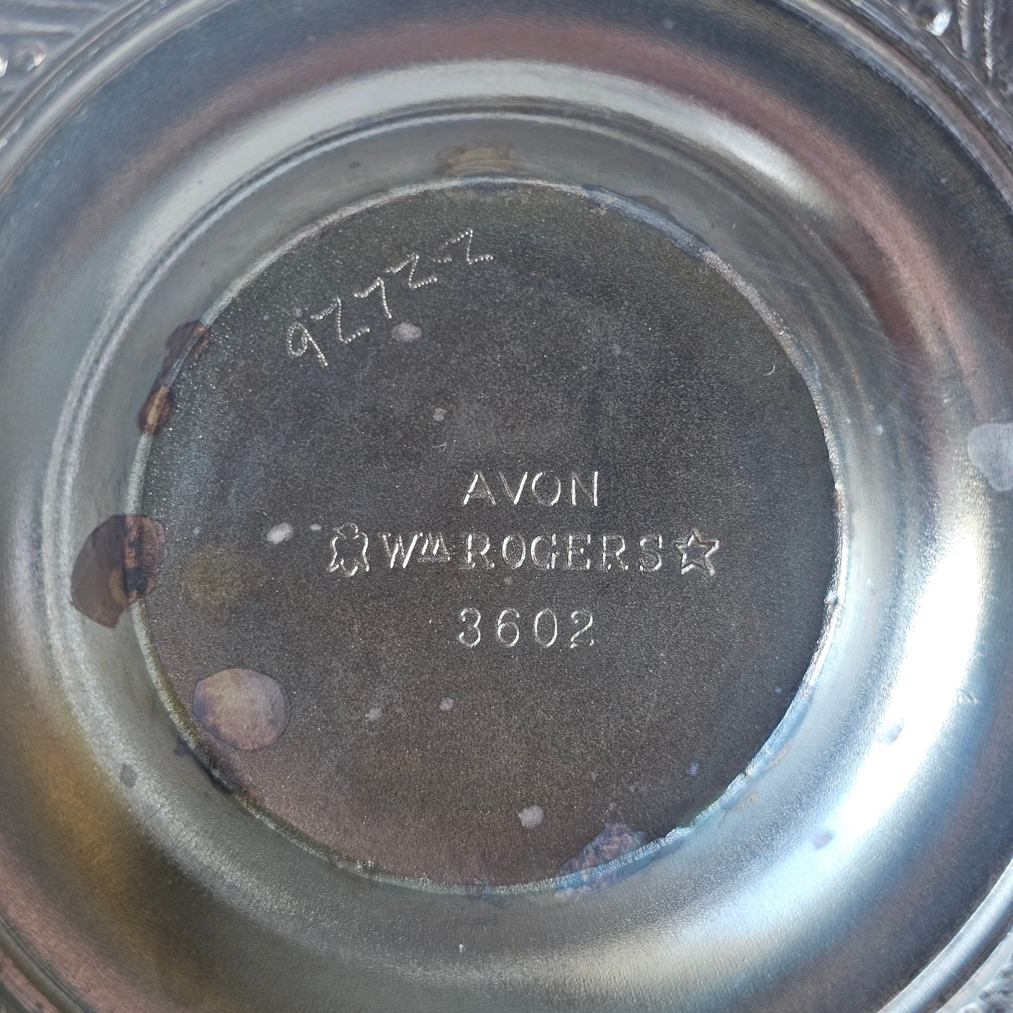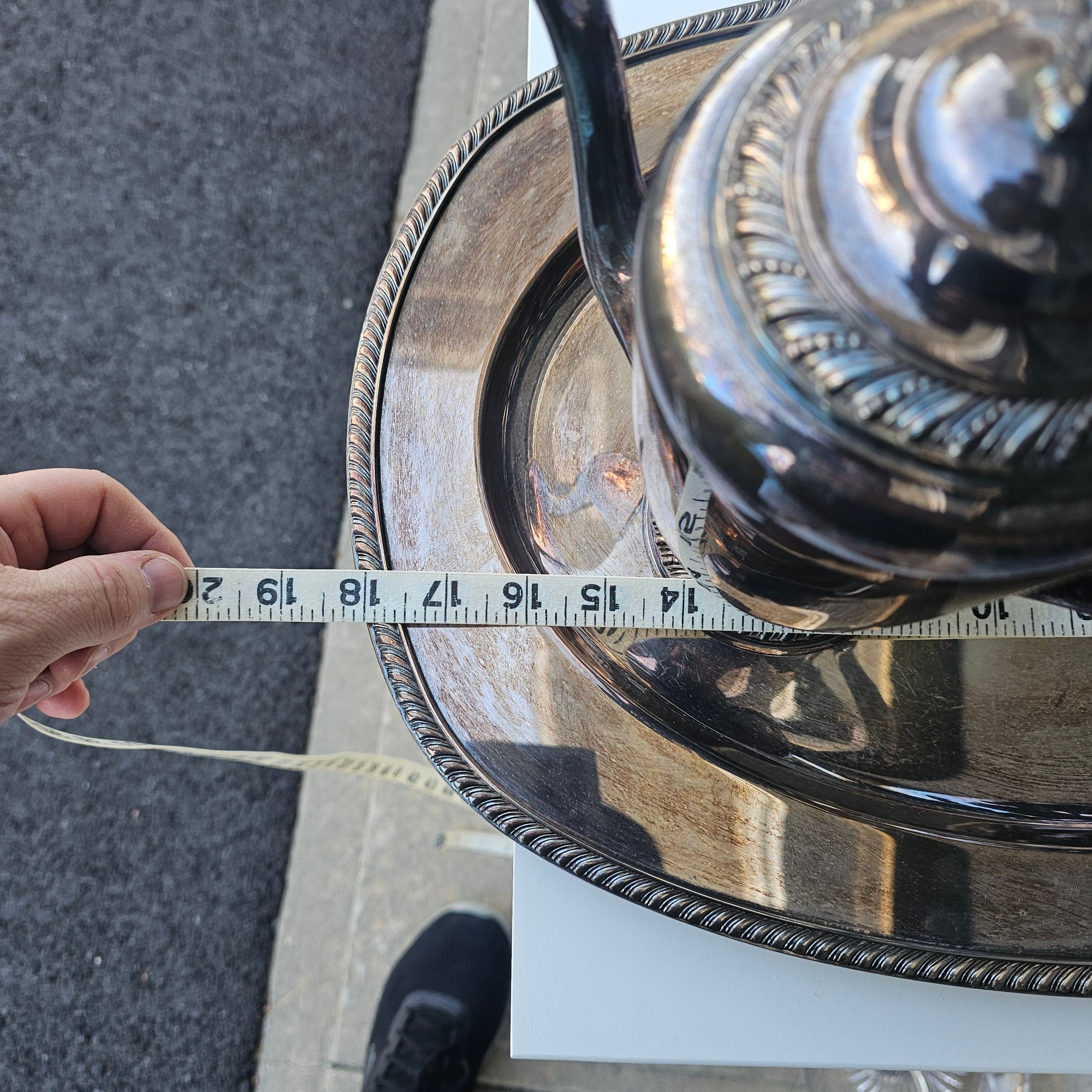 Vintage 4-piece silverplate tea/coffee service set by Wm. Rogers in the Avon pattern, including coffee pot, teapot, covered sugar bowl, and large serving tray. Tray is marked “Kenton Rogers 1709 18 IN” and features a monogrammed center. Classic ornate detailing with finial lids and decorative rims makes this a beautiful display or entertaining set.