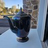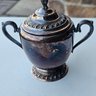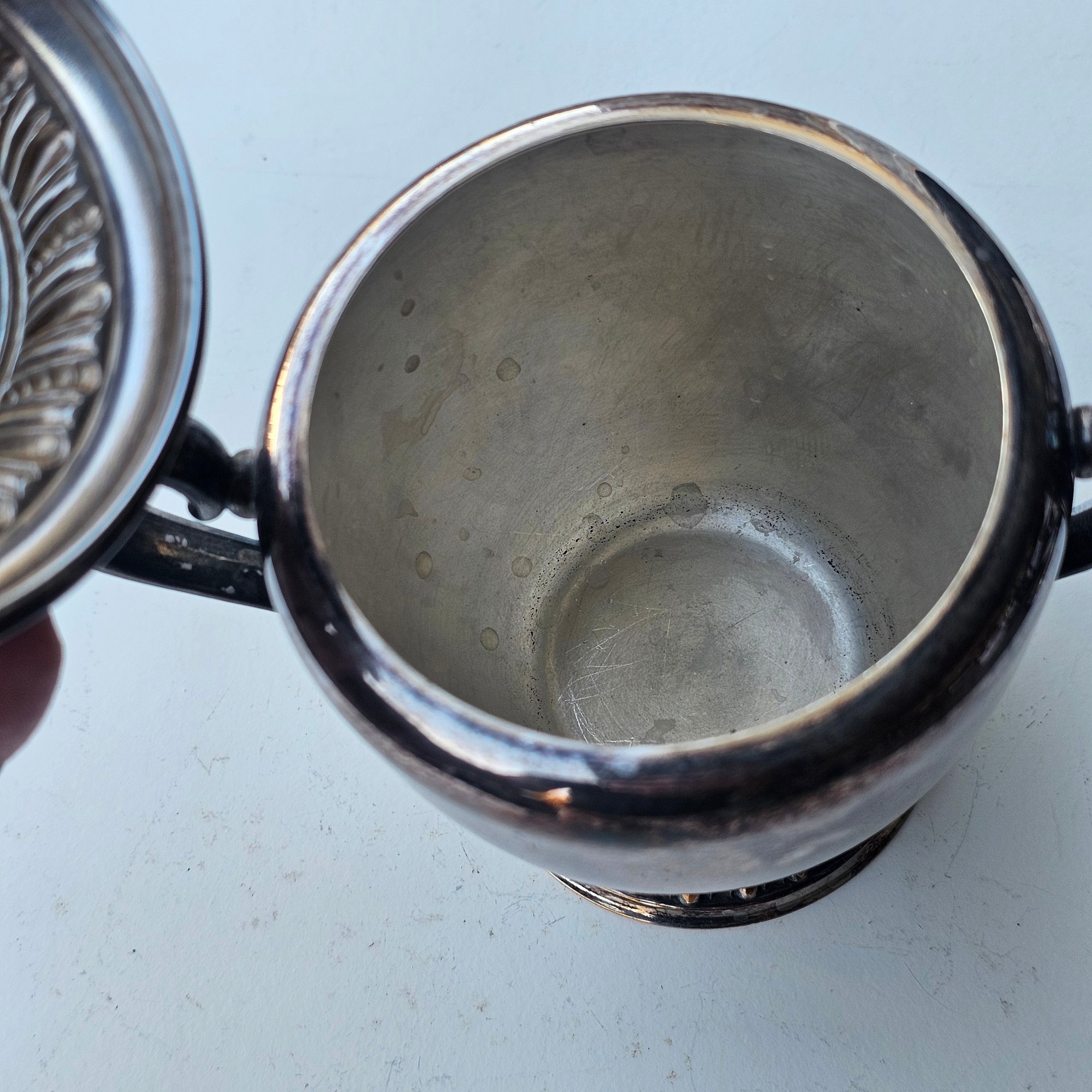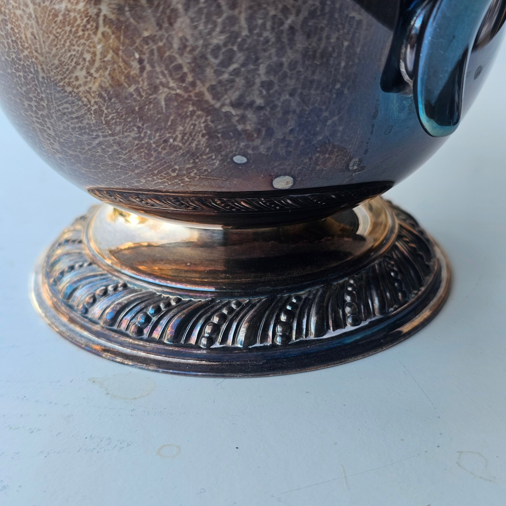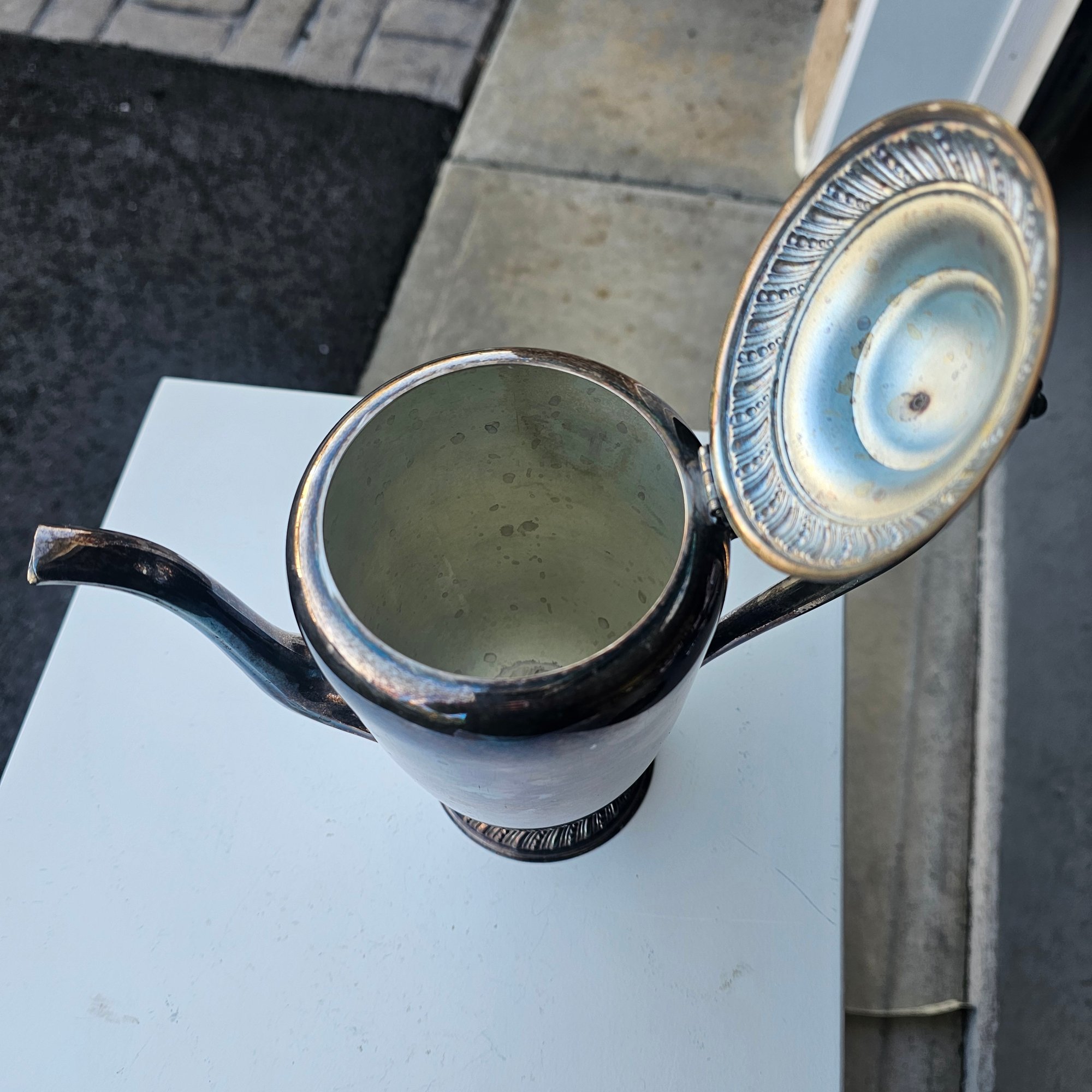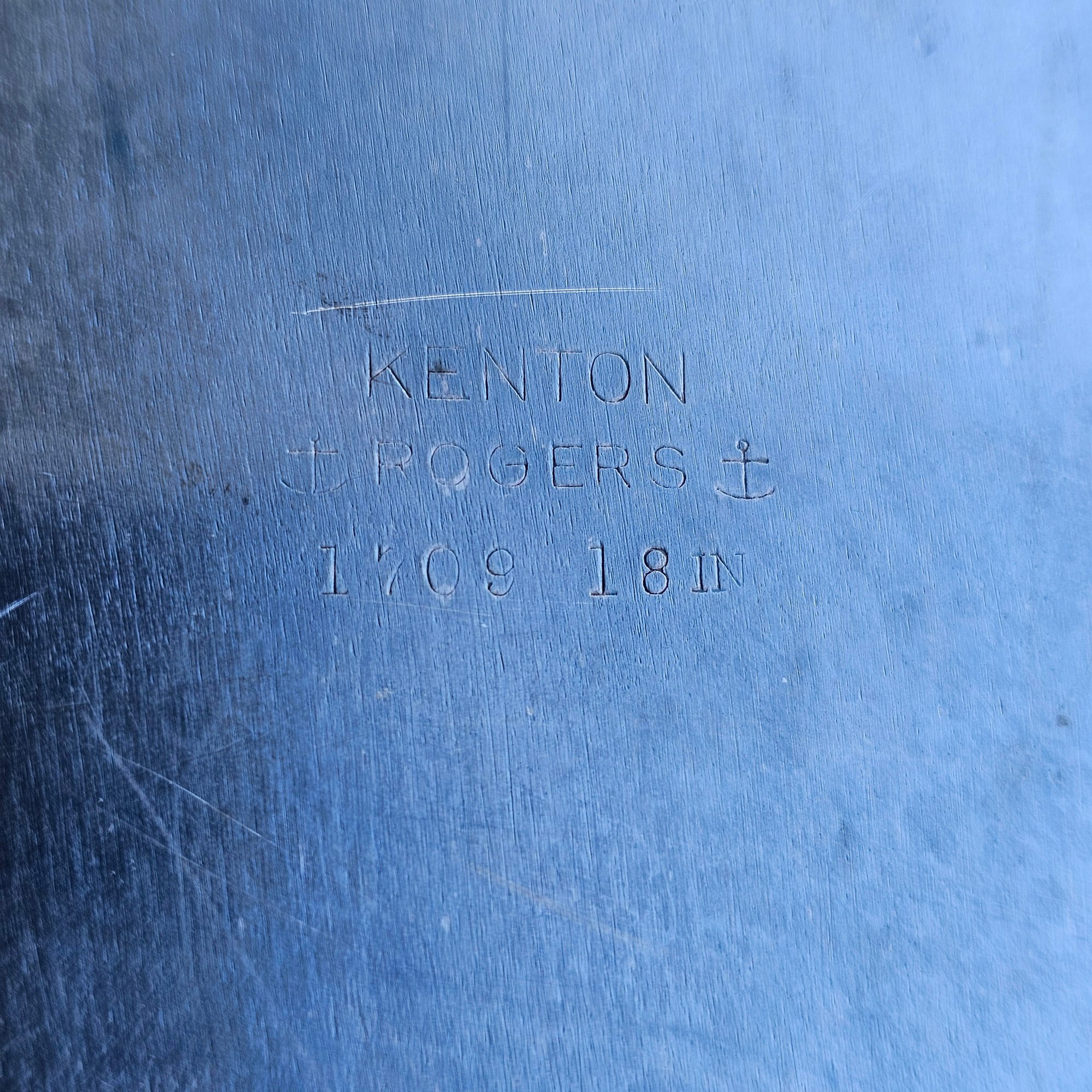 Vintage 4-piece silverplate tea/coffee service set by Wm. Rogers in the Avon pattern, including coffee pot, teapot, covered sugar bowl, and large serving tray. Tray is marked “Kenton Rogers 1709 18 IN” and features a monogrammed center. Classic ornate detailing with finial lids and decorative rims makes this a beautiful display or entertaining set.