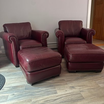 Pair Of Red Leather Arm Chairs With Two Ottomans (Entry - 62292)