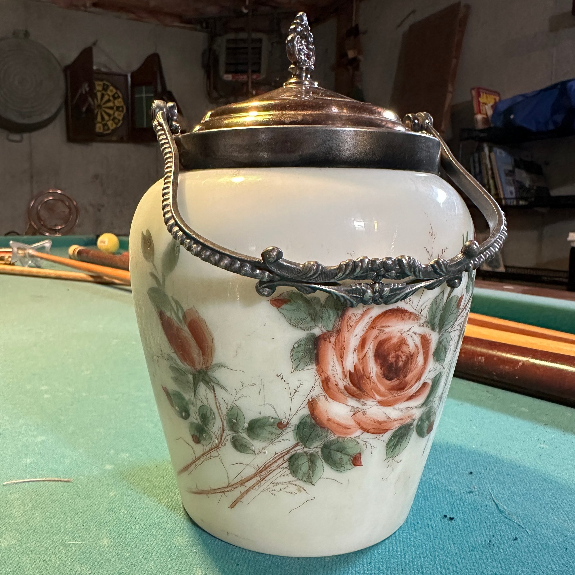 Antique Painted Milk Glass Cracker Jar With Silver Plate Frame (Basement 1)