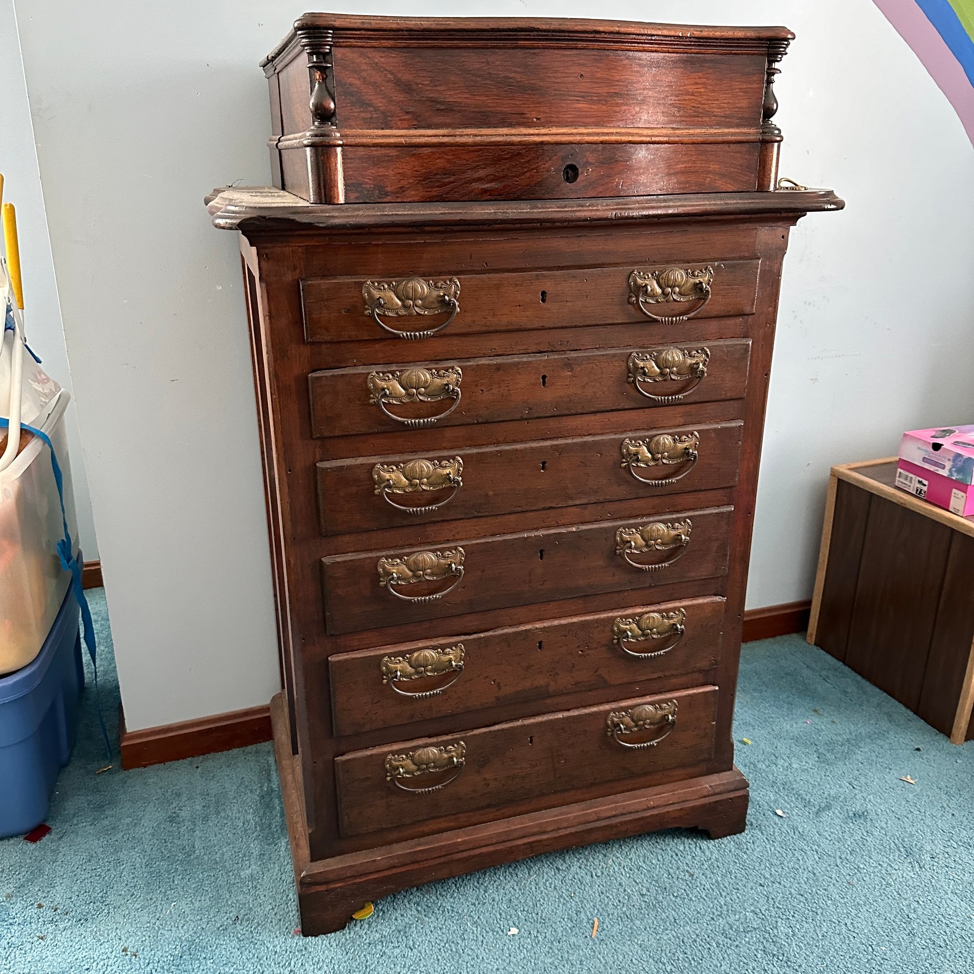 This piece does need the jewelry box top piece repaired - as shown in photos, the wood has split and the piece has come unattached. Does also have piece of wood missing in front left corner, as shown in photos.
