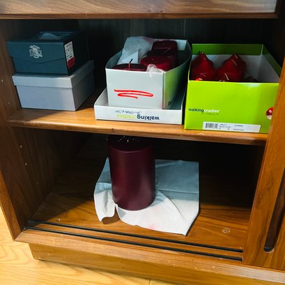 The two boxes on the upper left side are empty. There two shoeboxes with candles plus the pillar candle on the lower shelf.