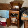 Phonograph is sold in as-is condition. It will require restoration and looks to be missing parts. The upper front panel is missing. An assortment of records are shown in the photos thought not all albums are pictured.