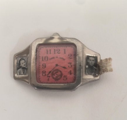 Original prize from a Cracker Jack box. Art Deco style toy watch with fabric band. Gas two small photographs at each end and is printed with "Made In Japan" on dial. Measures 2" long x 1" wide. Very good condition for a throw away toy.