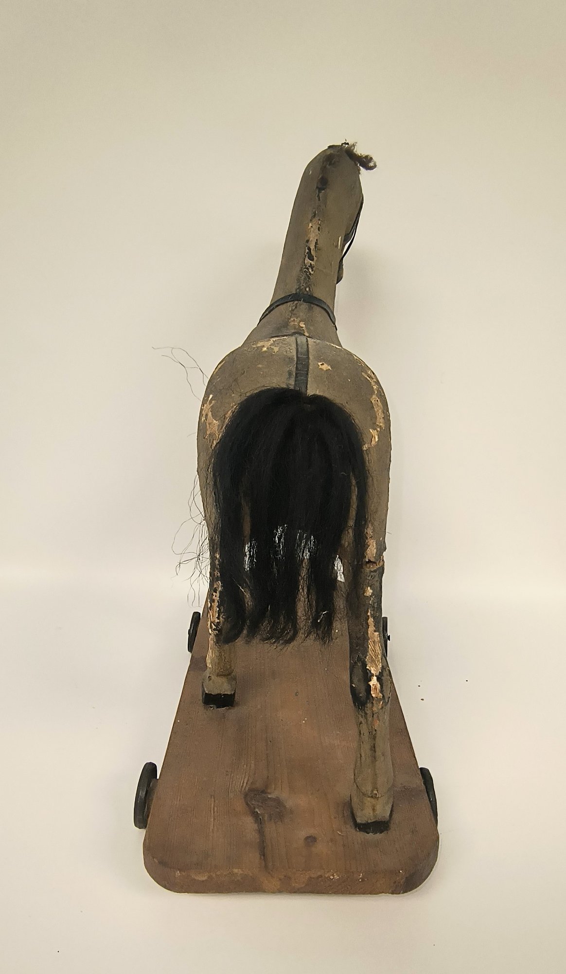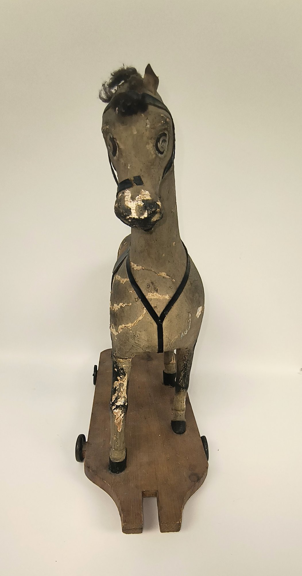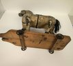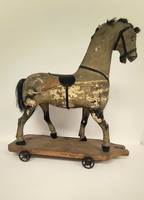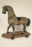 Hand painted wood with fabric covered horse. Steel wheels.