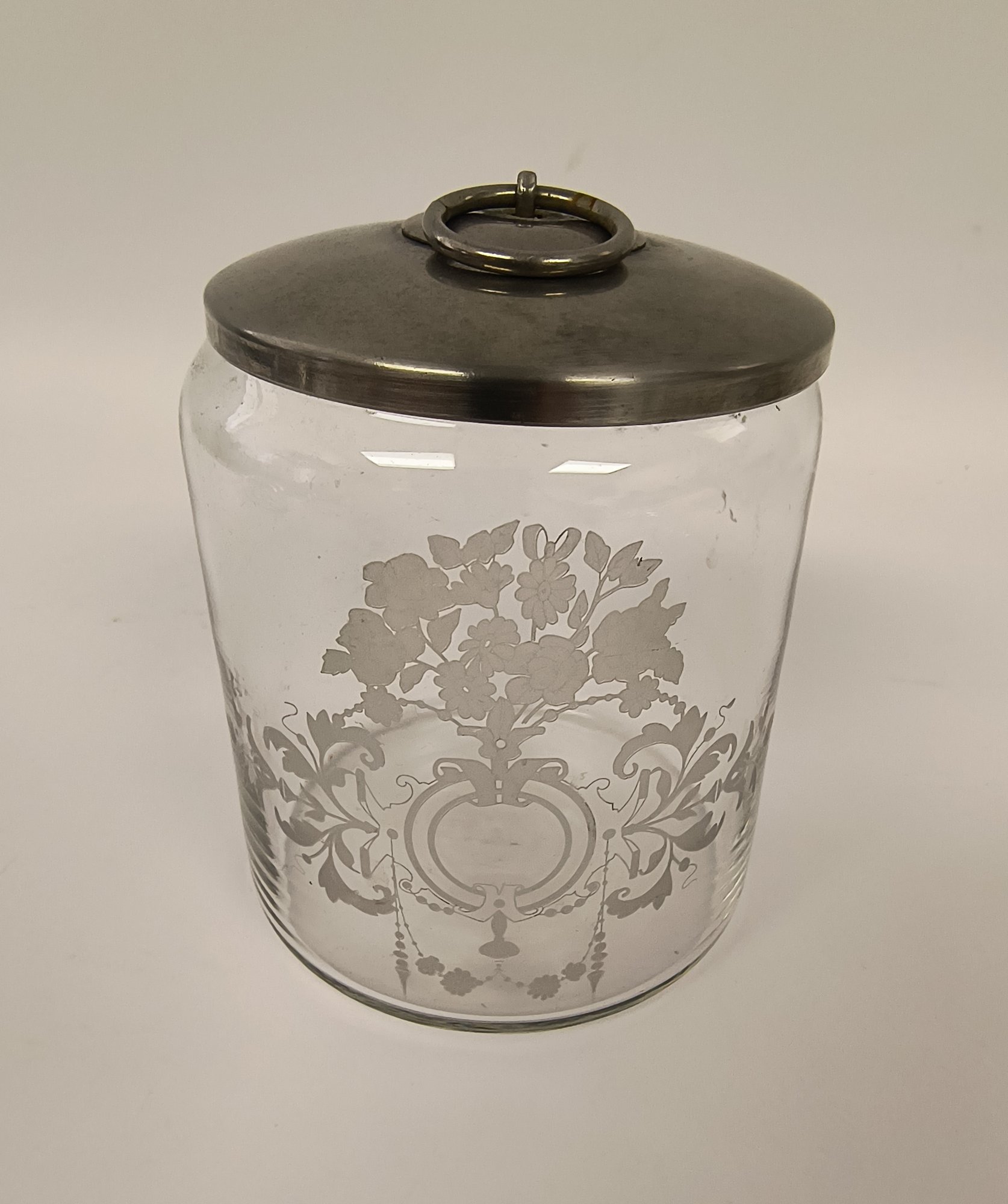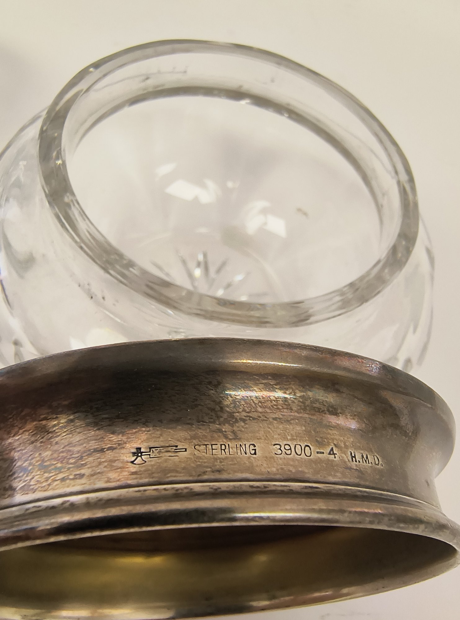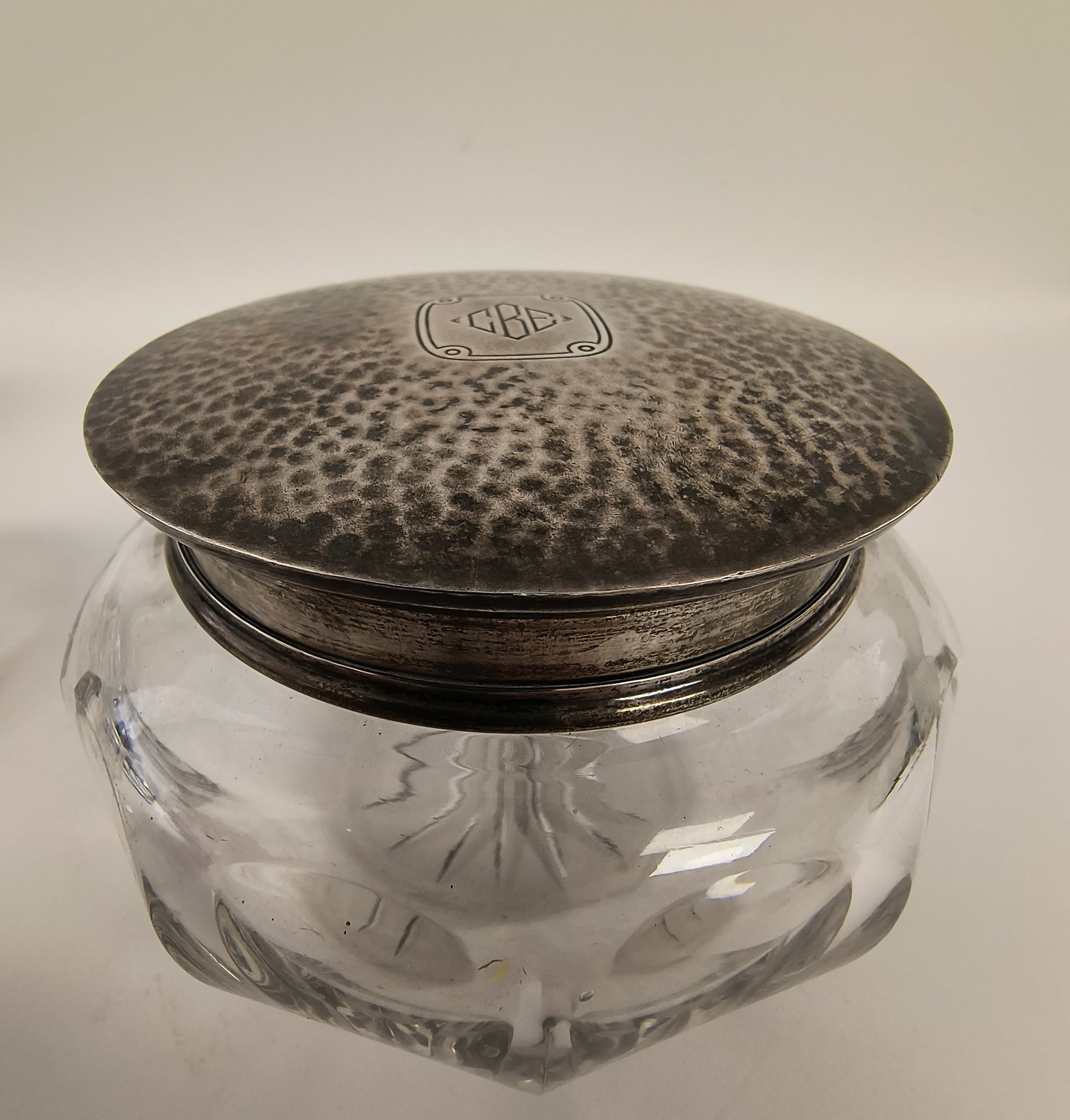 A grouping of four small covered jars. The floral overlay appears to be silver and the monogrammed and hammered top of one jar is marked Sterling HMD. Largest one with silver monogram cover measures 4 and 3/4 diameter. Smallest with glass cover is 3 in in diameter. One of the covers on the taller canister appears to be aluminum.