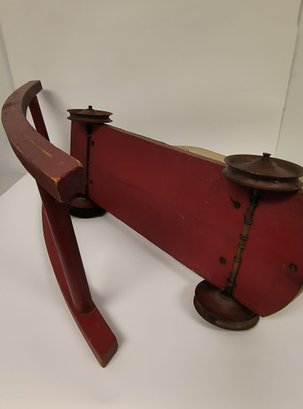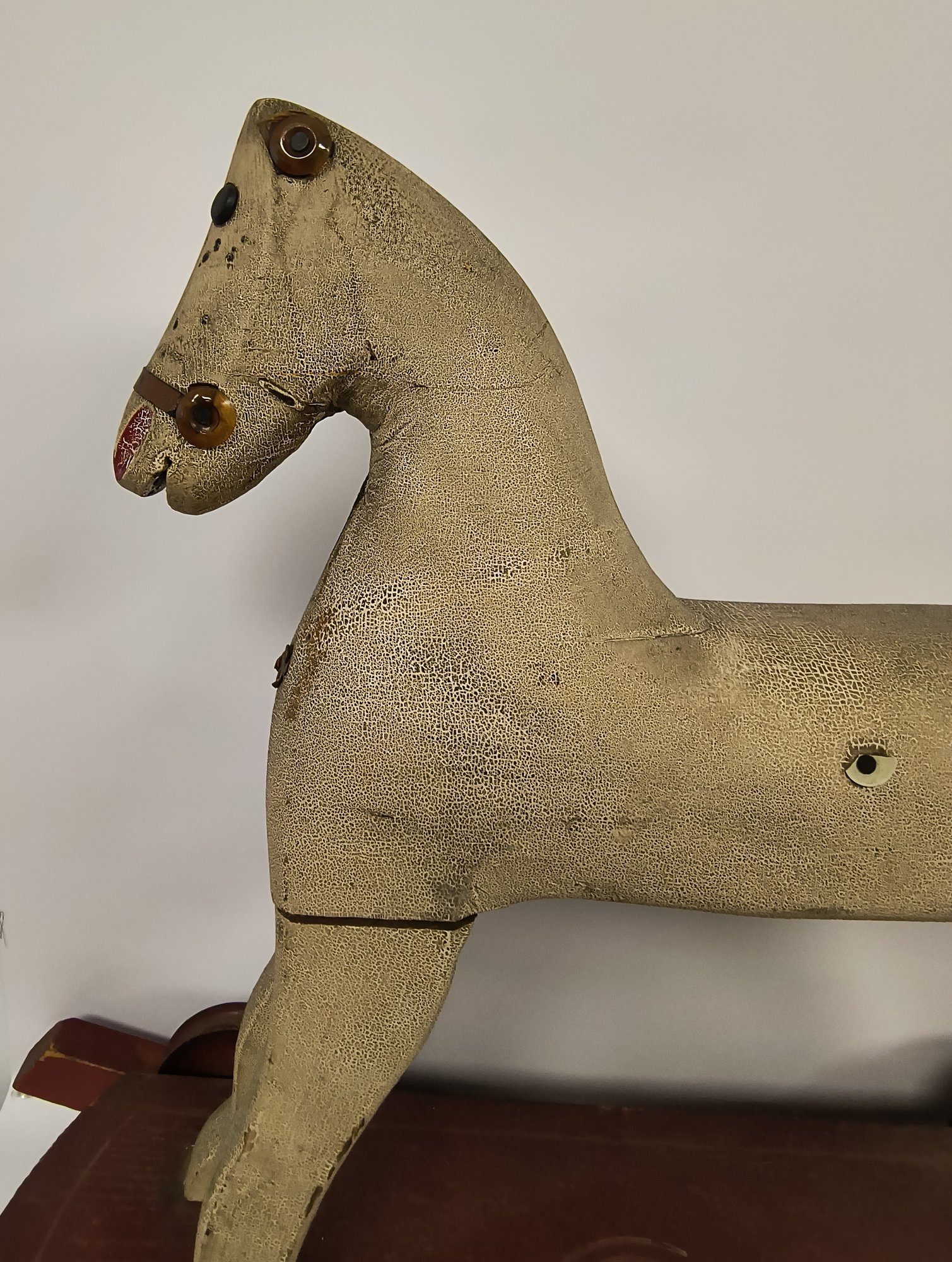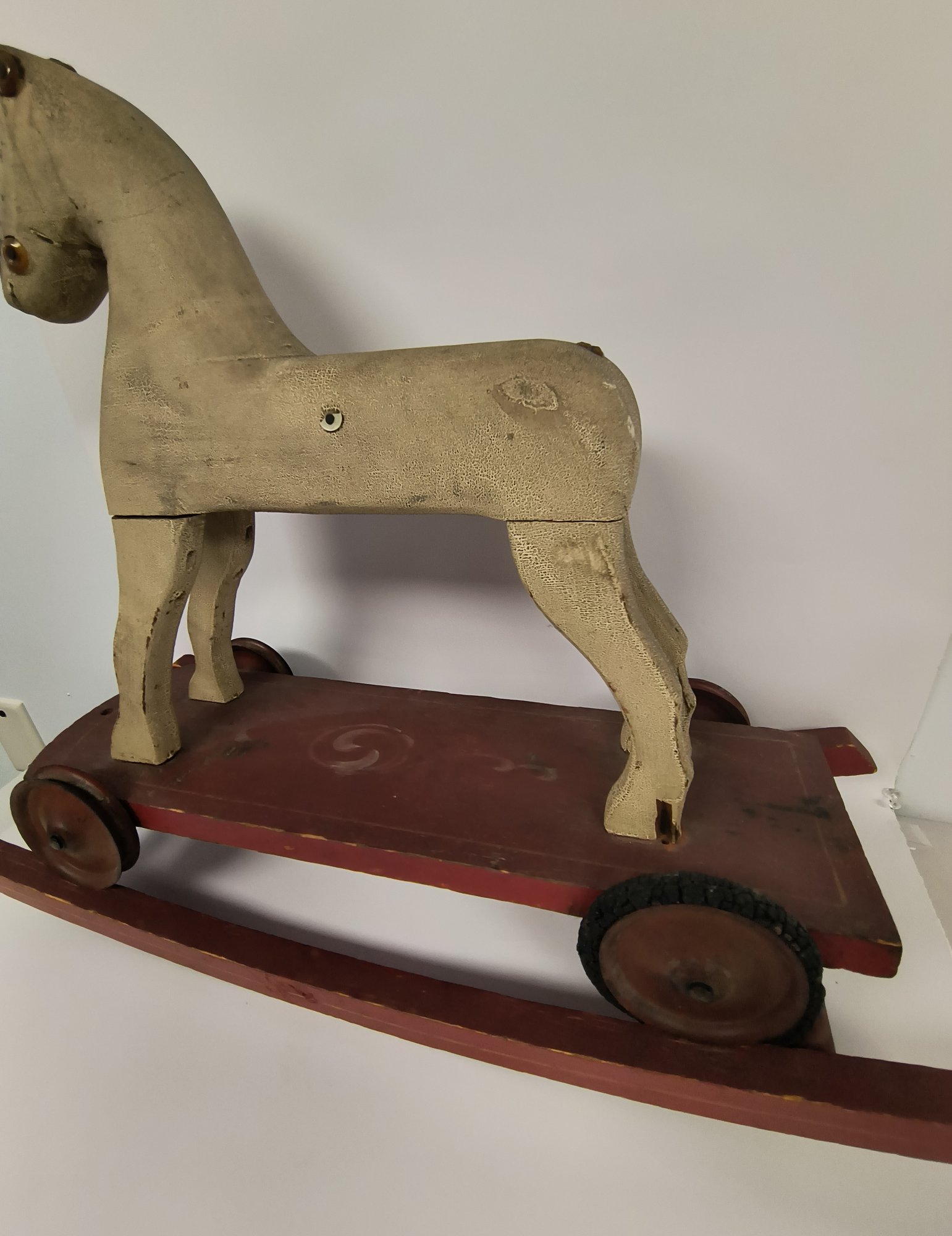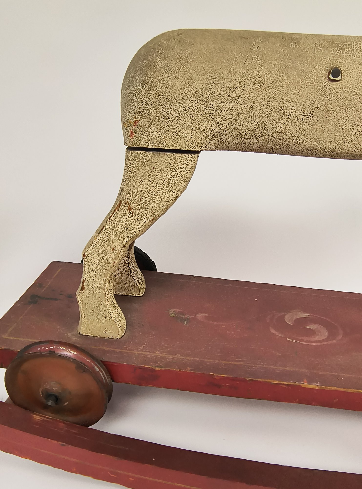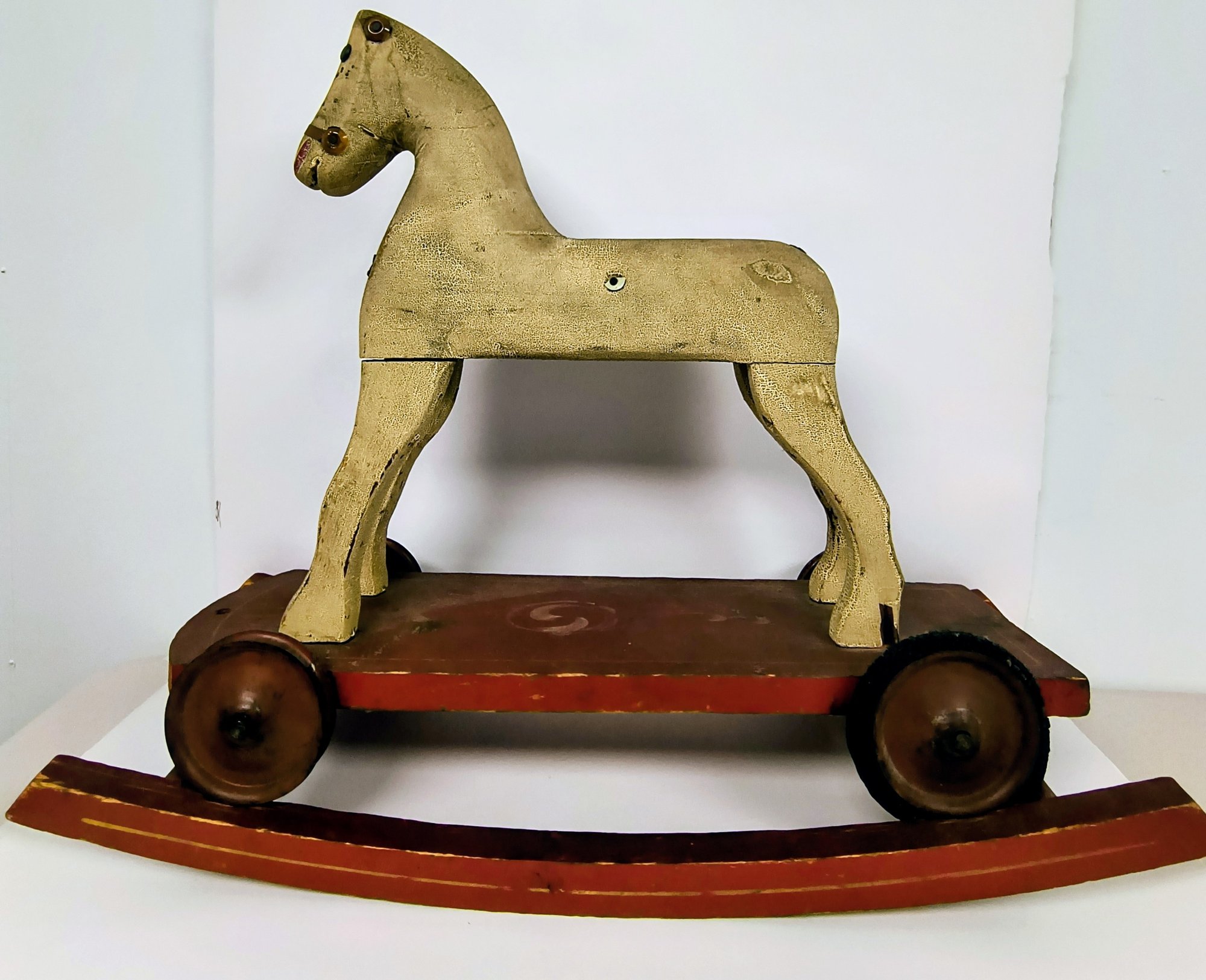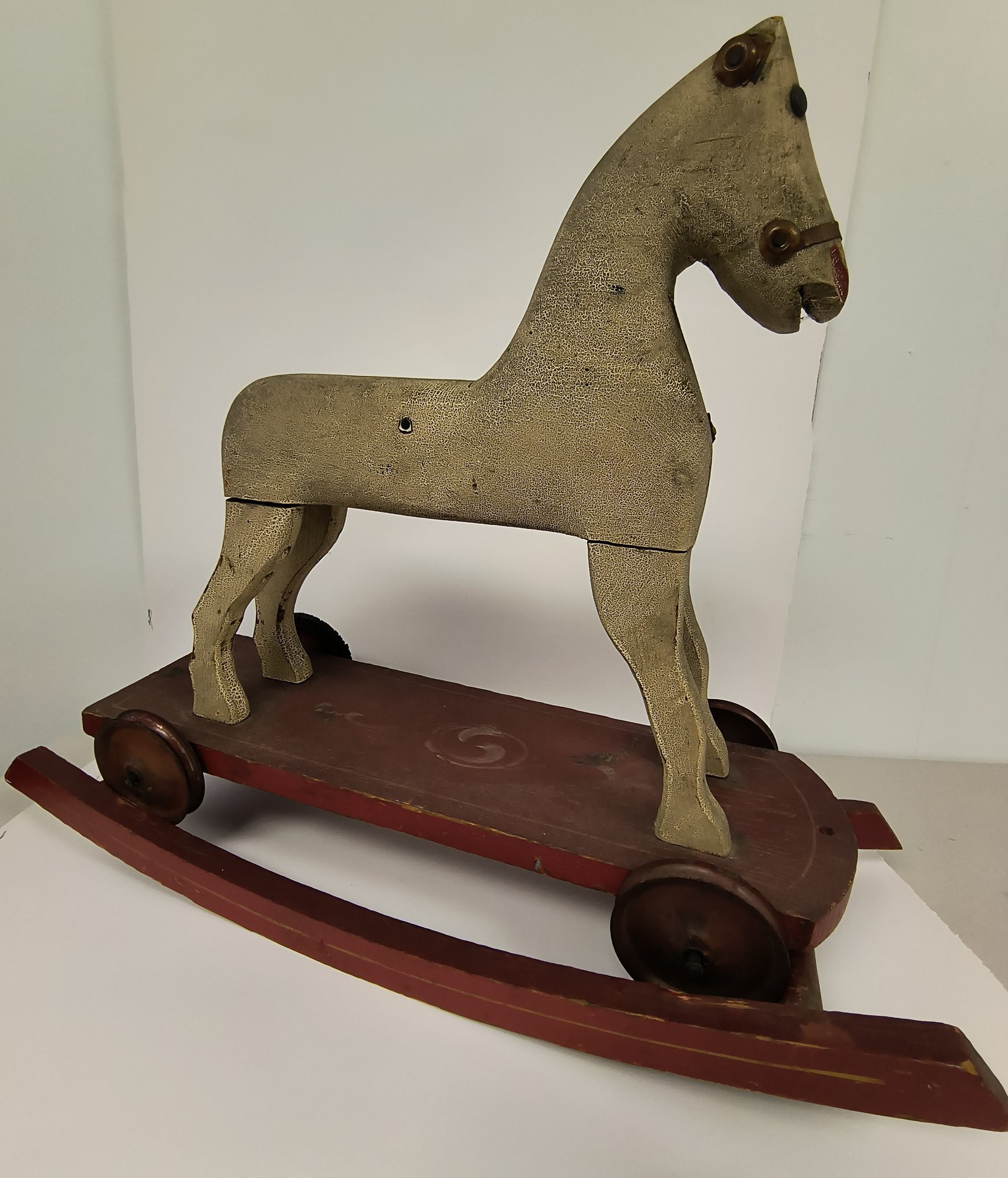 Notes: Has wood cracks with paint and hair loss. Only 1 rubber wheel present. Missing ears.