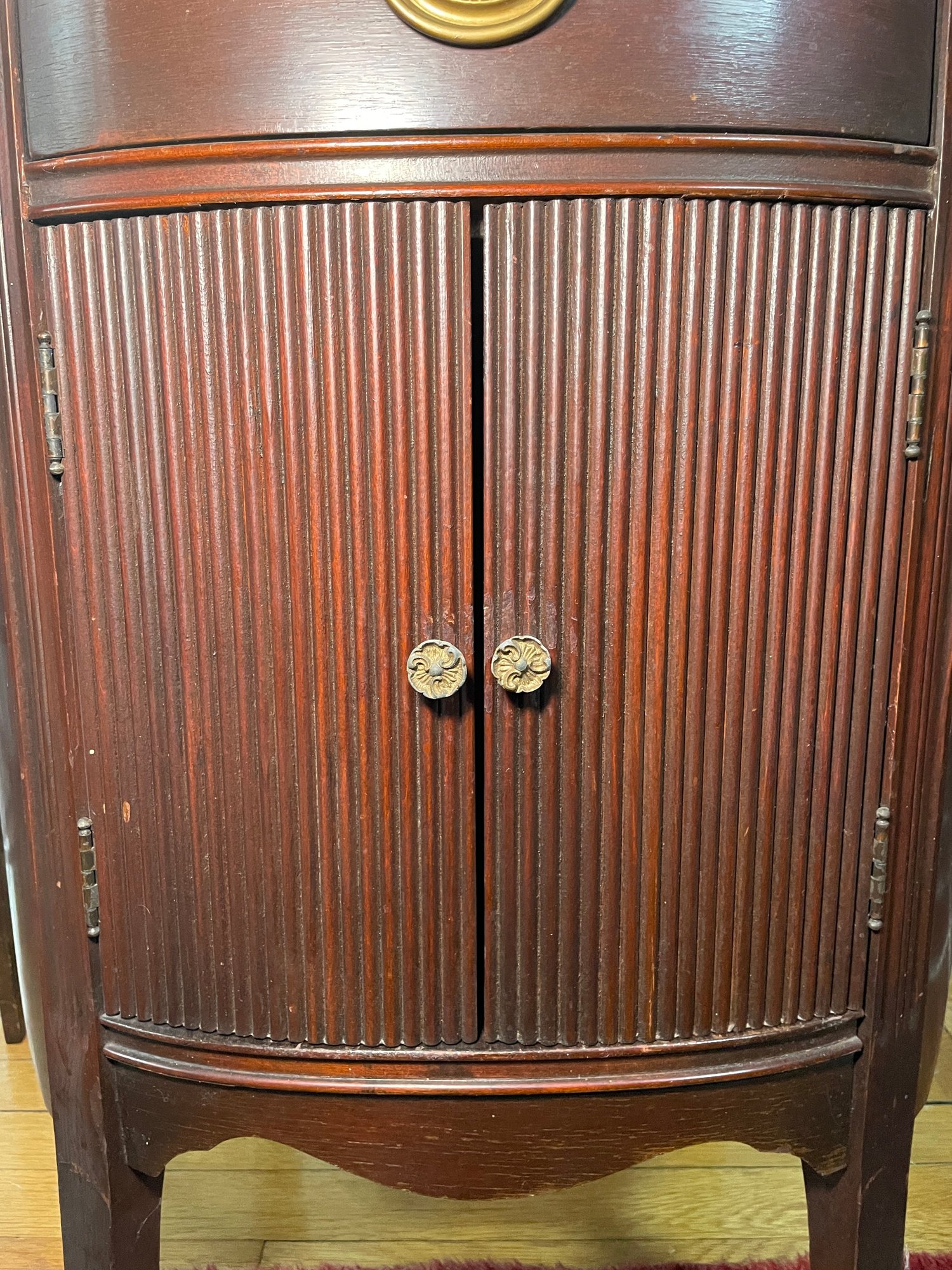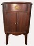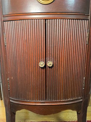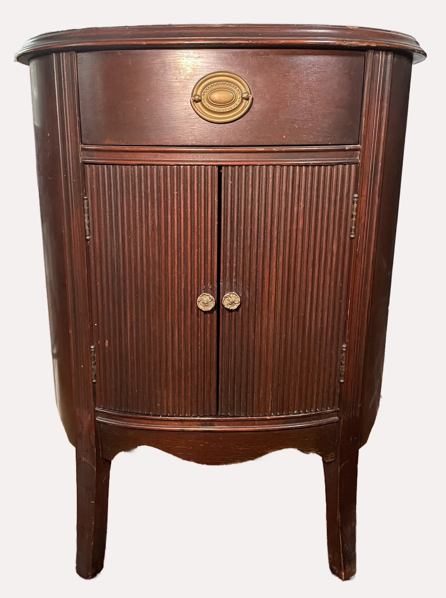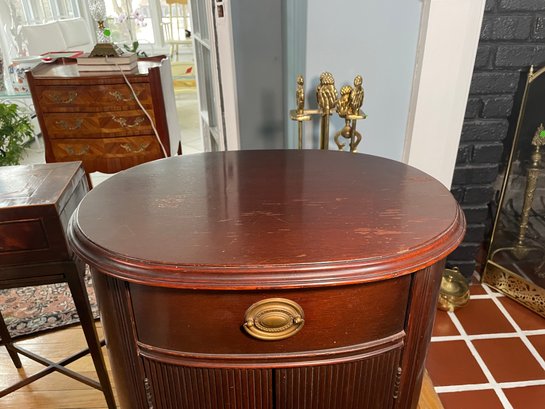 Antique Thomasville Mahogany oval cabinet/side table. The "Manufacturers of BED ROOM Furniture" label indicates it was likely part of an early 20th-century bedroom suite, as the company initially specialized in bedroom furniture before expanding their Line Style.Featuring a single top drawer with a central brass pull and a lower cabinet with dual tambour style doors characterized by distinct vertical reeding or ribbing.