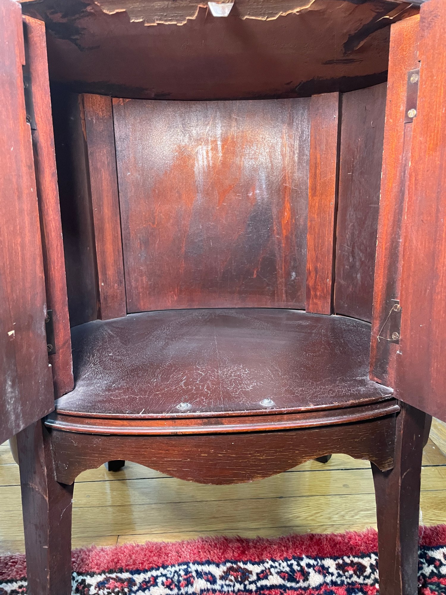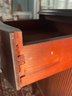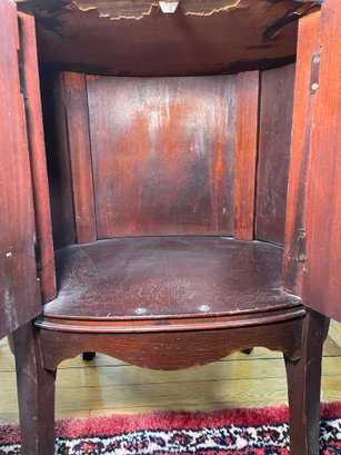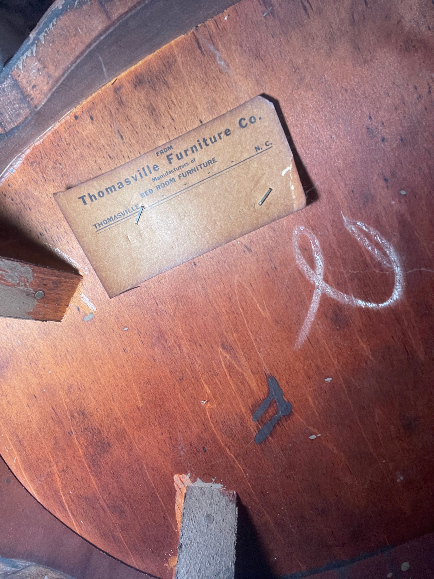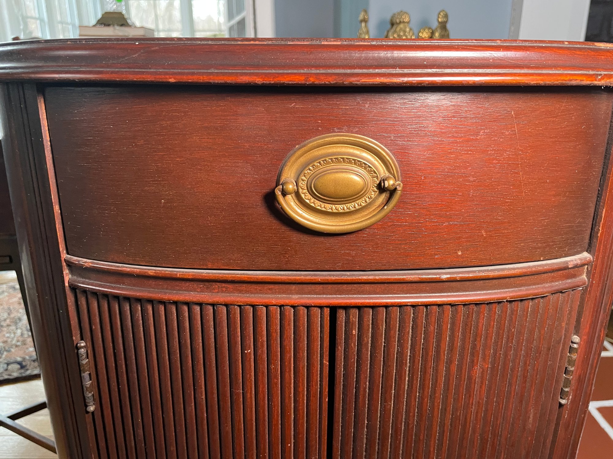 Antique Thomasville Mahogany oval cabinet/side table. The "Manufacturers of BED ROOM Furniture" label indicates it was likely part of an early 20th-century bedroom suite, as the company initially specialized in bedroom furniture before expanding their Line Style.Featuring a single top drawer with a central brass pull and a lower cabinet with dual tambour style doors characterized by distinct vertical reeding or ribbing.