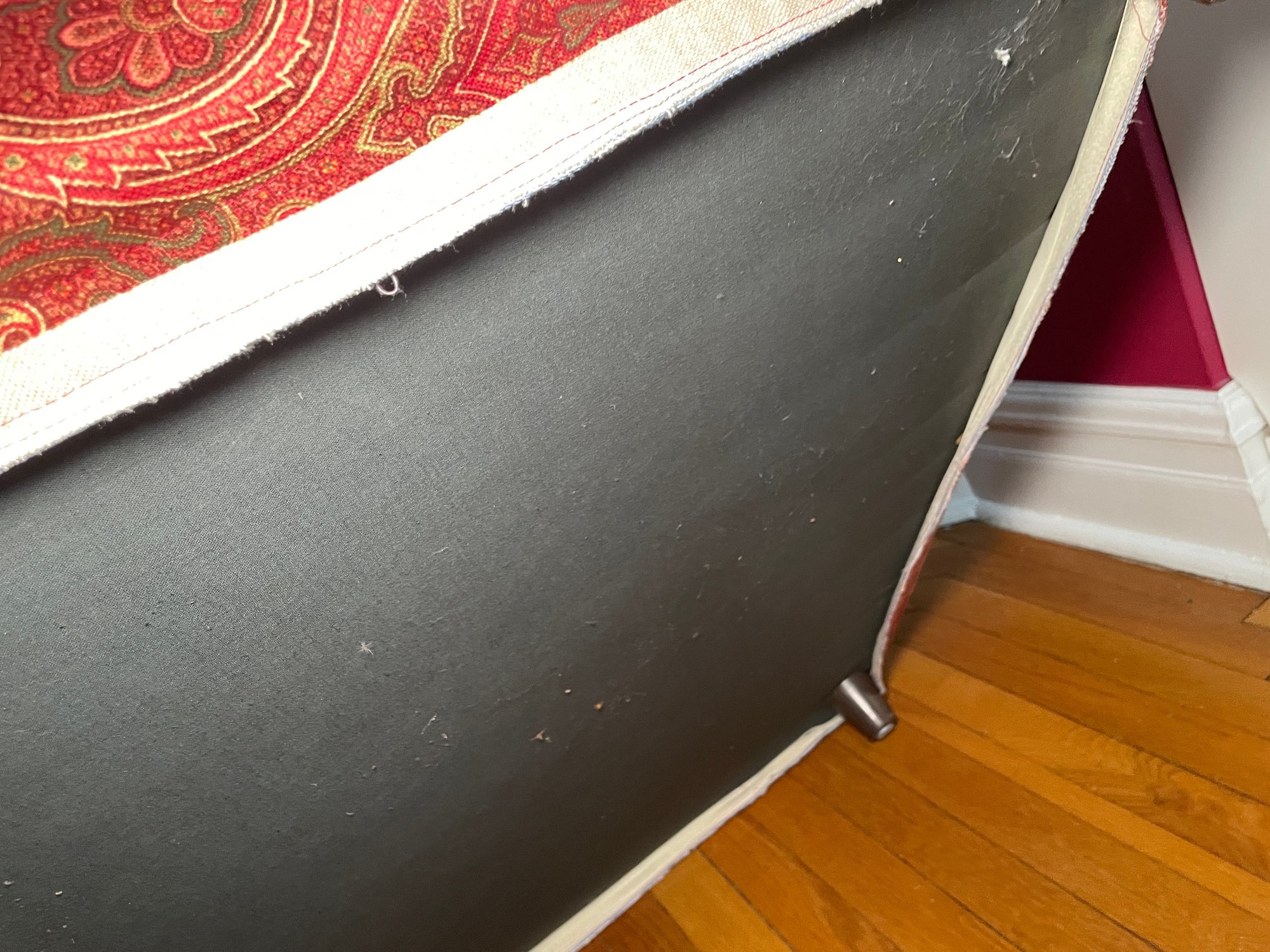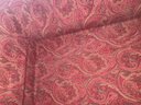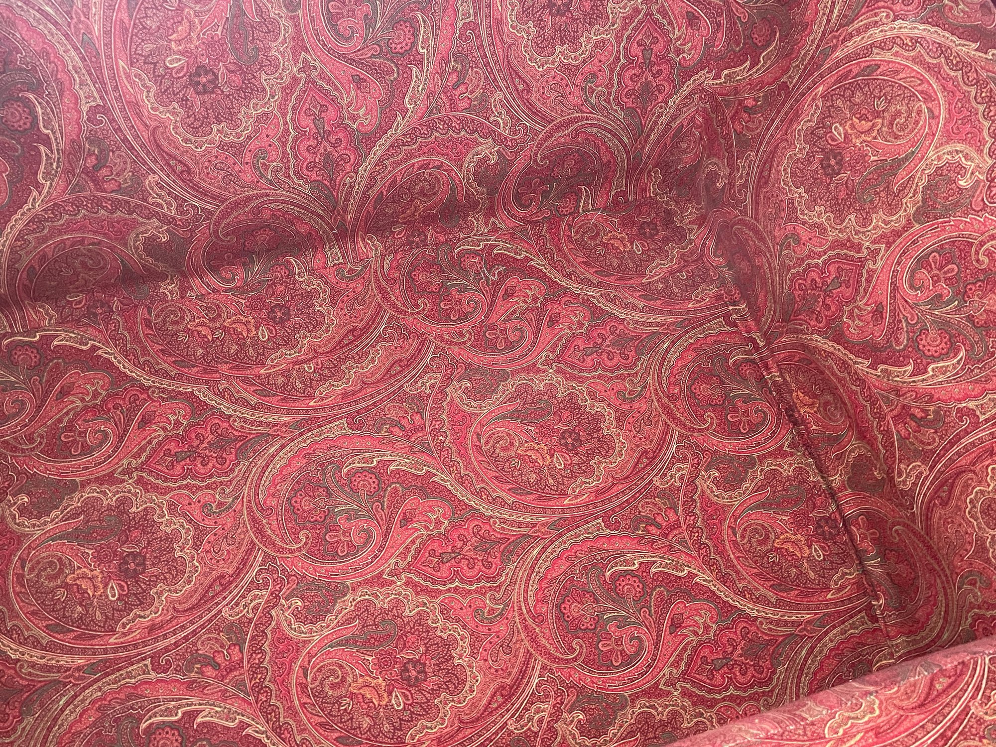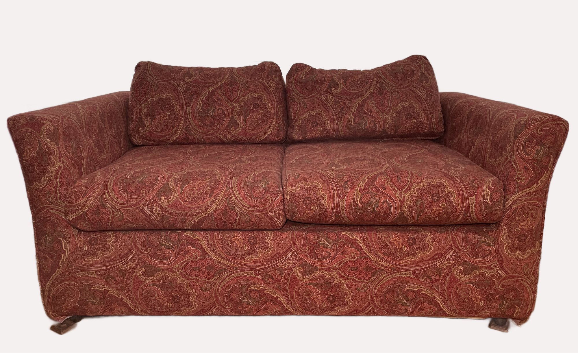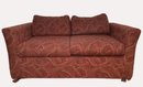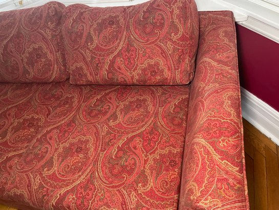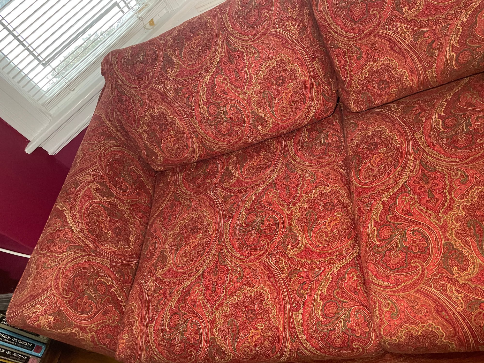 Contemporary Loveseat featuring red paisley upholstery, often identified as a product by Ethan Allen