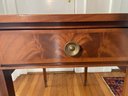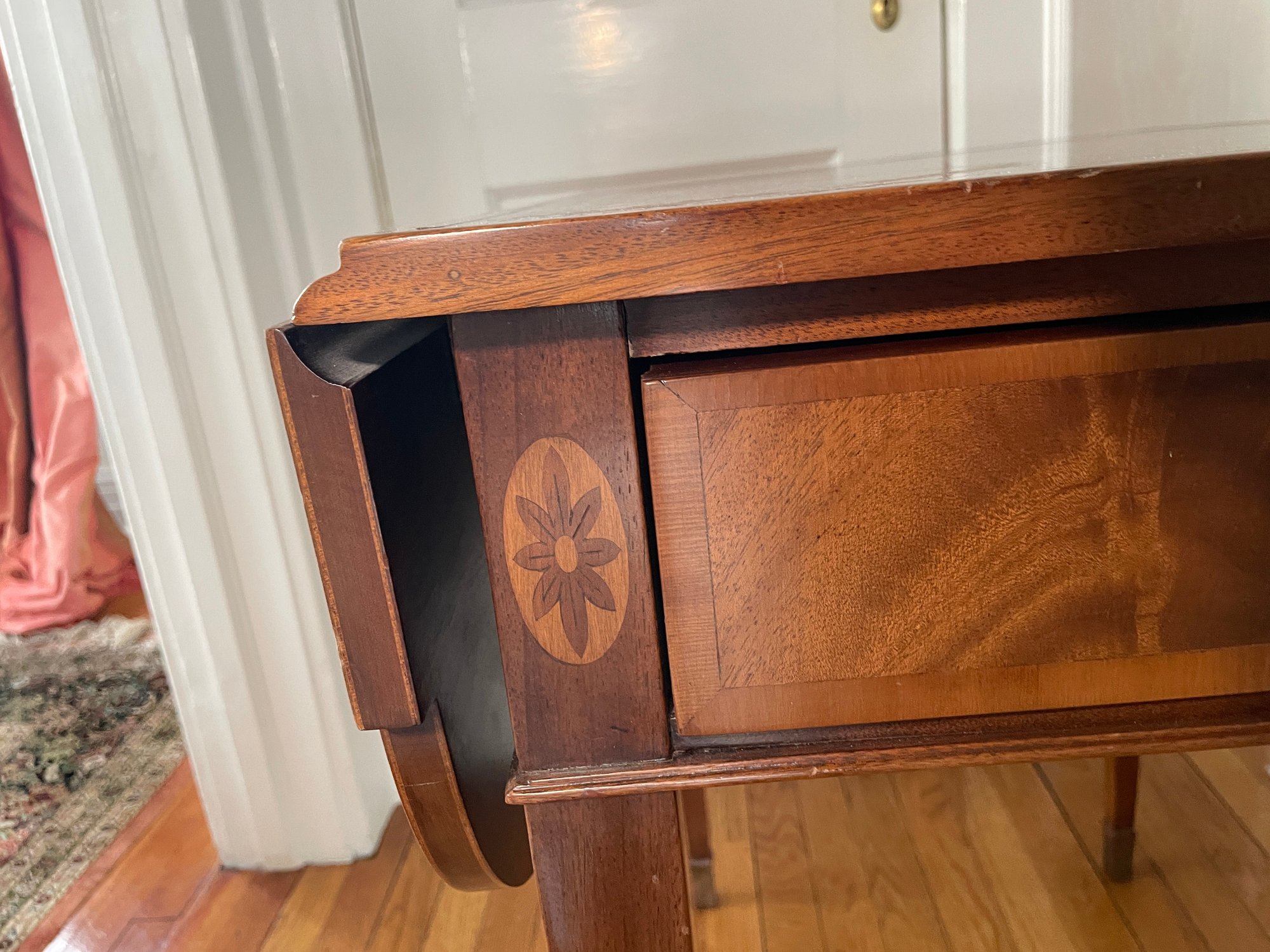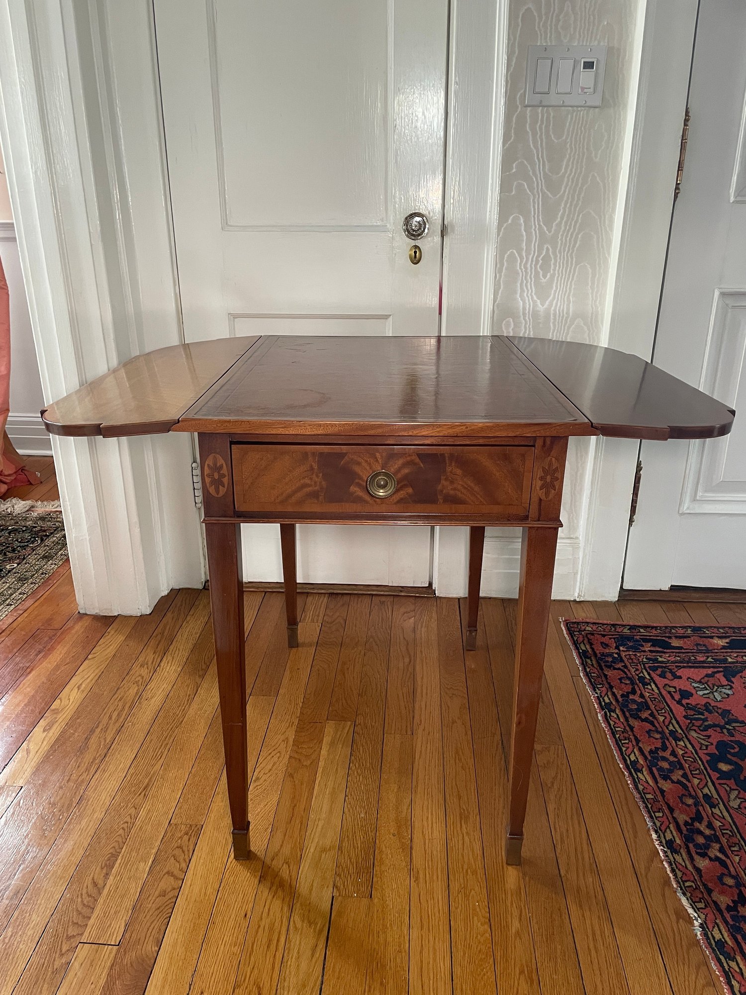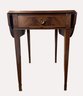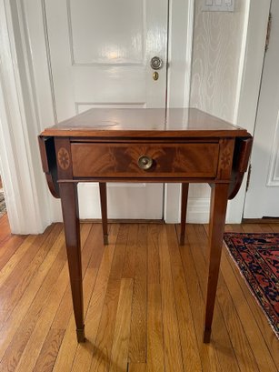 Federal Style Inlaid Mahogany Leather Top Pembroke Side Table. High Quality American Made Mahogany Drop Leaf Pembroke Side Table with Single Dovetailed Drawer and Bellflower Inlay.