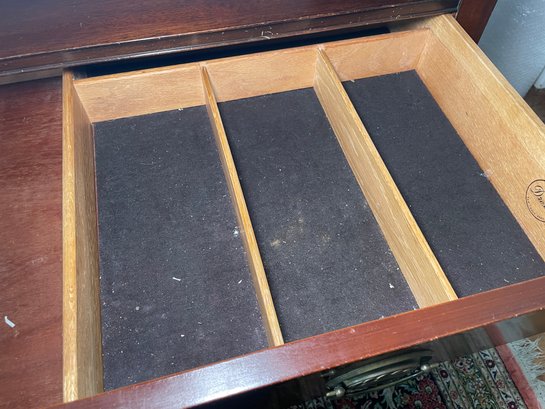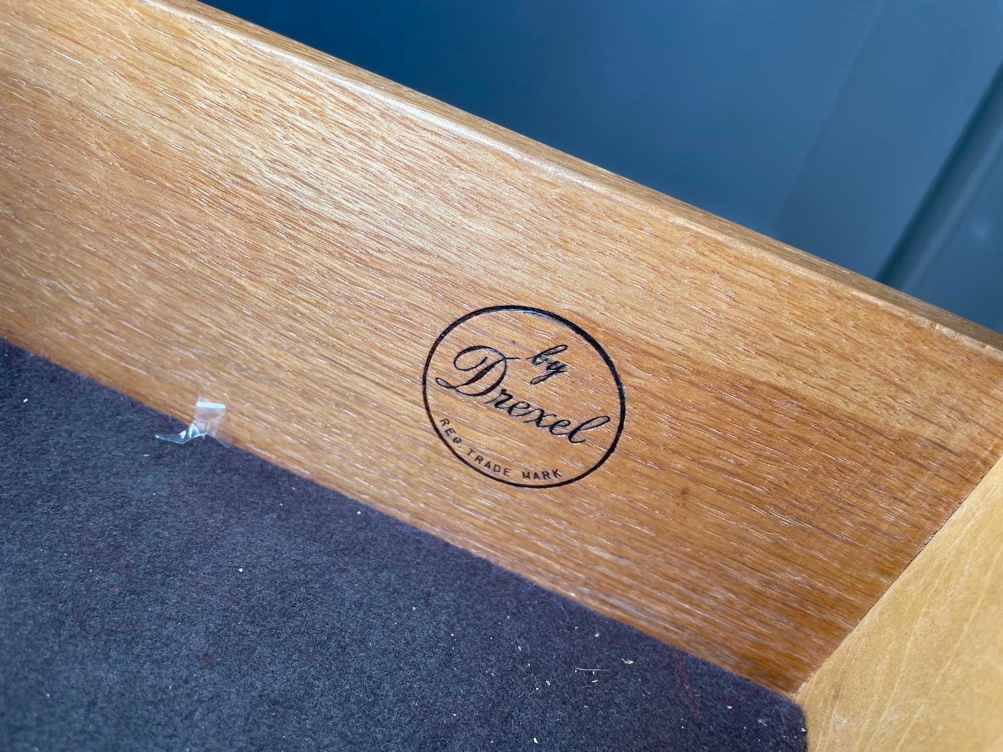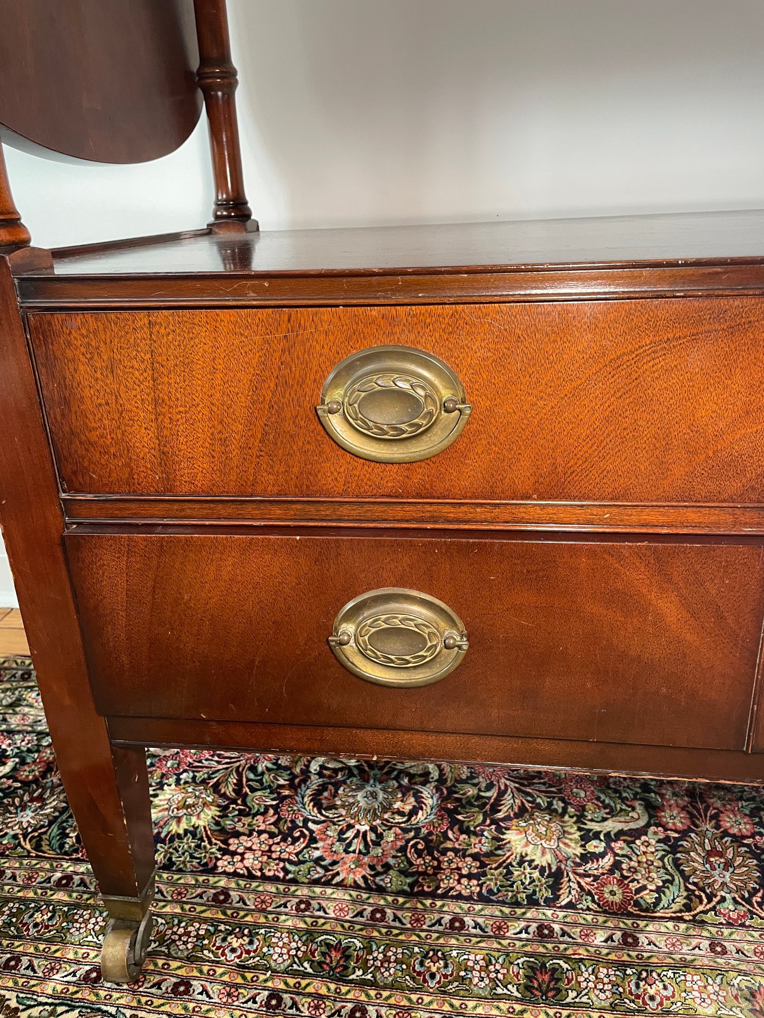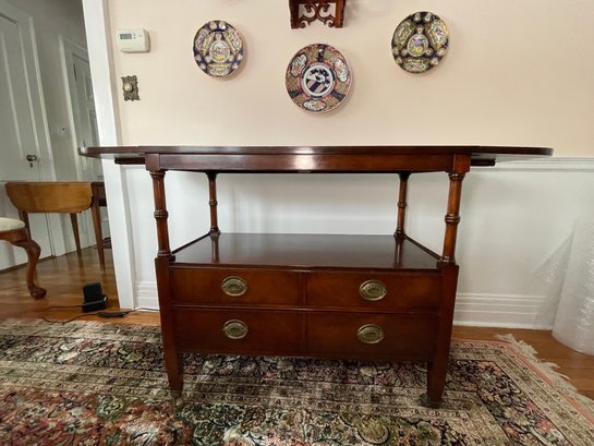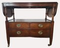 Drexel "New Travis Court Collection" Mahogany Drop-Leaf Serving Cart, mid-20th-century furniture item fabricated in Feb, 1949. Crafted in a Federal or Duncan Phyfe style, these servers are known for their high-quality mahogany construction, dovetail joinery, and brass hardware. Set on brass casters, making them easily moveable between rooms.