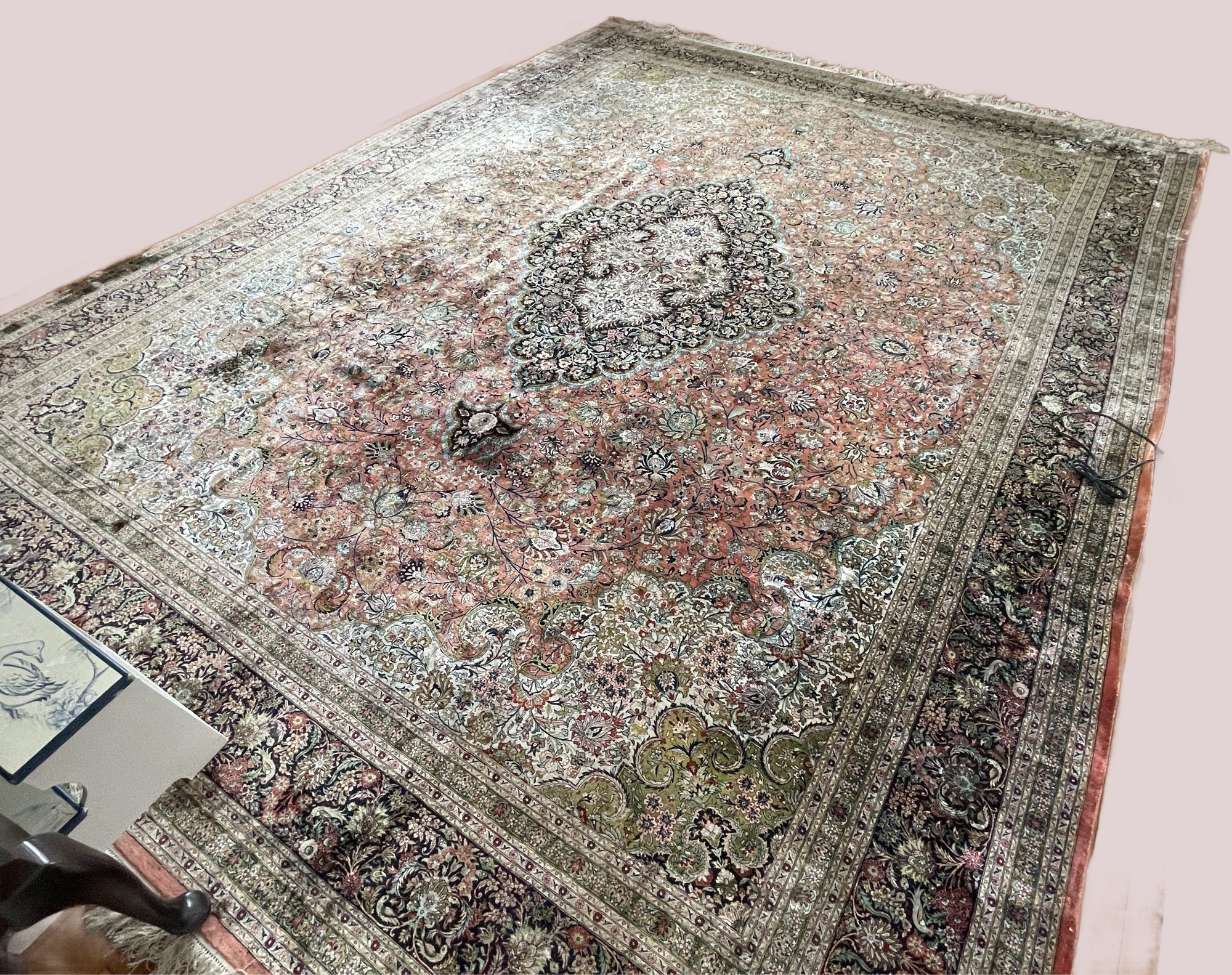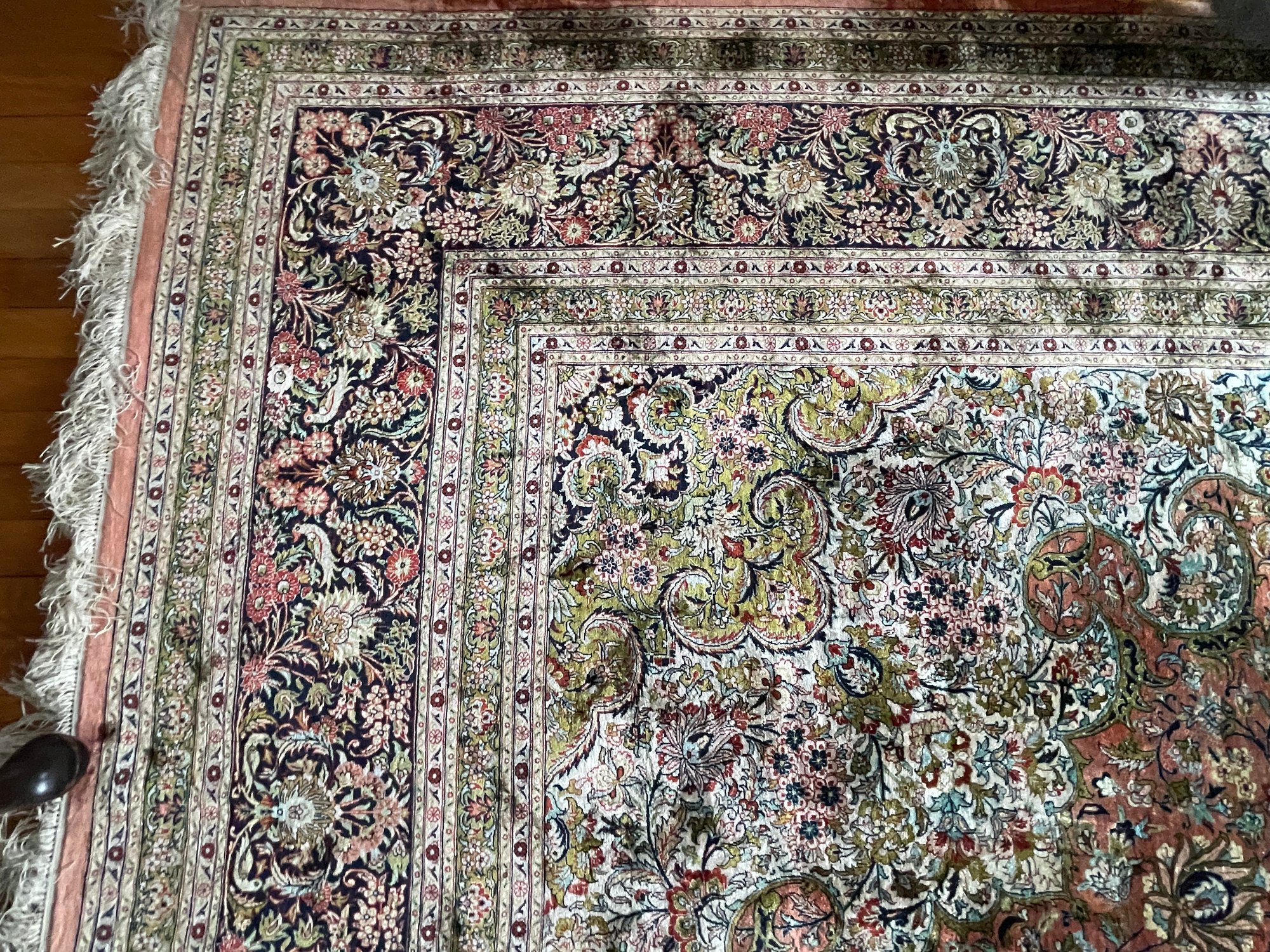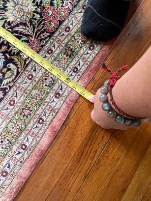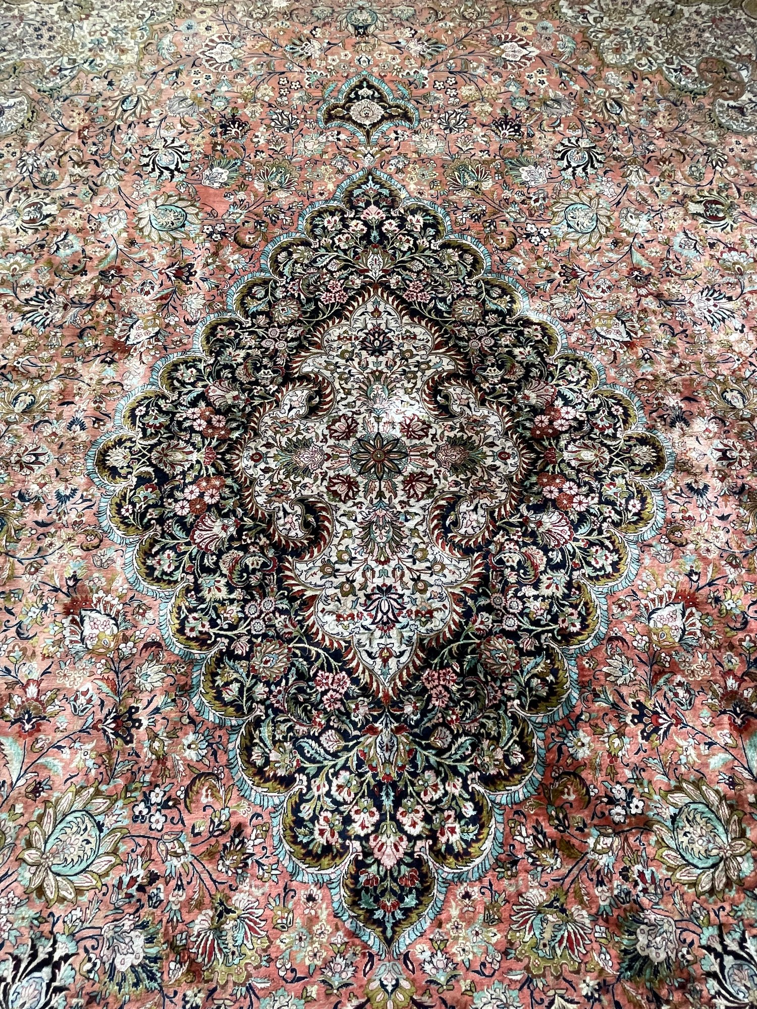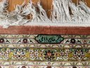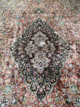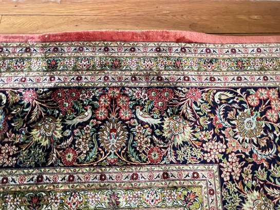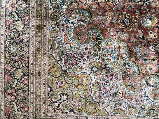 Vintage, hand-knotted, Silk, Persian-style rug, likely manufactured in Kashmir, India, featuring a central floral medallion design. These rugs are often composed of silk pile on a cotton foundation