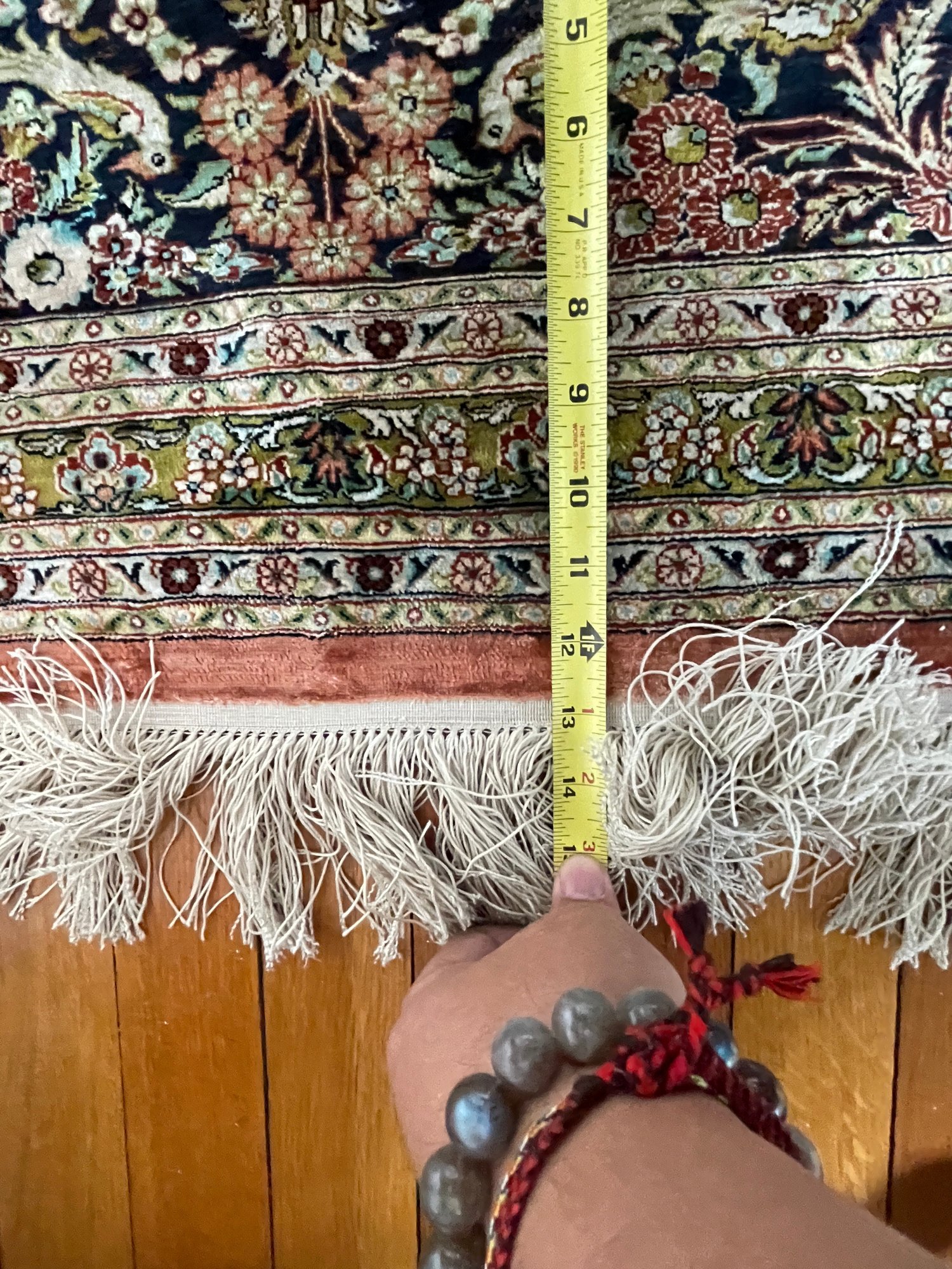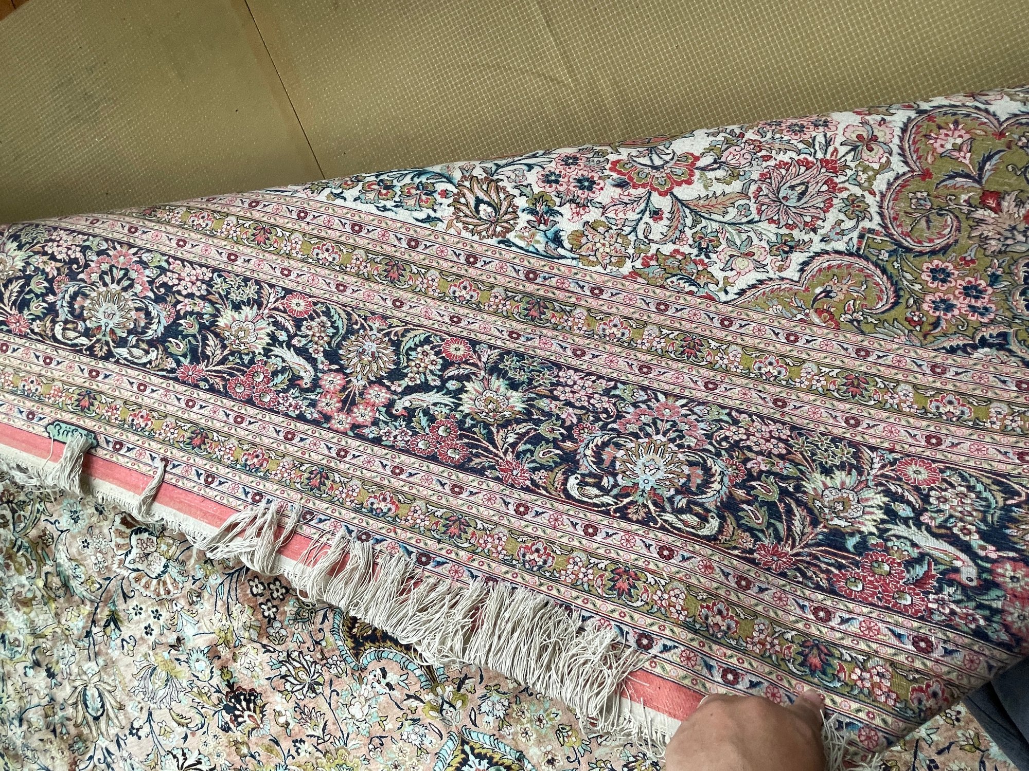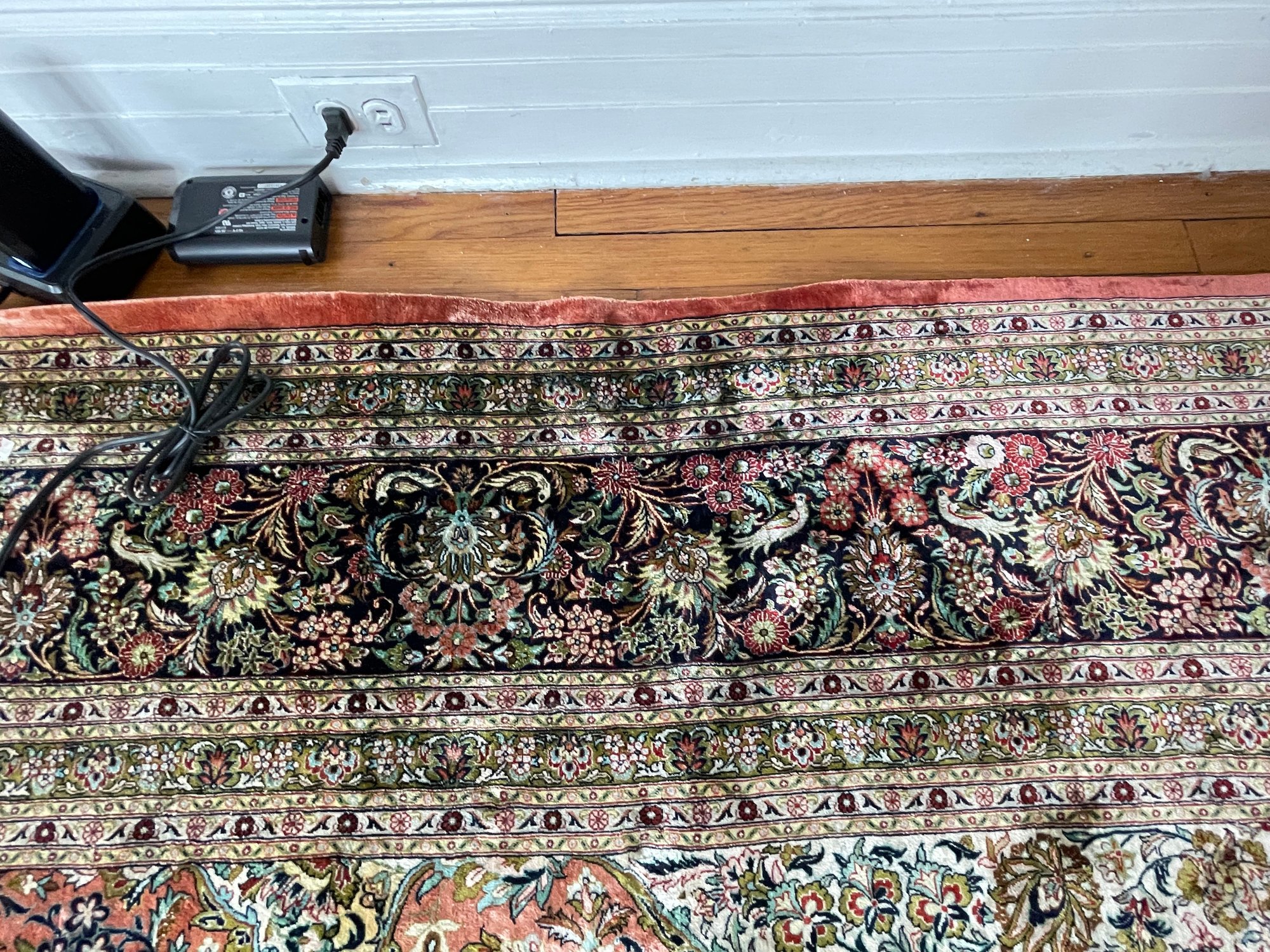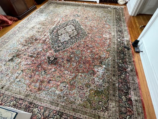 Vintage, hand-knotted, Silk, Persian-style rug, likely manufactured in Kashmir, India, featuring a central floral medallion design. These rugs are often composed of silk pile on a cotton foundation