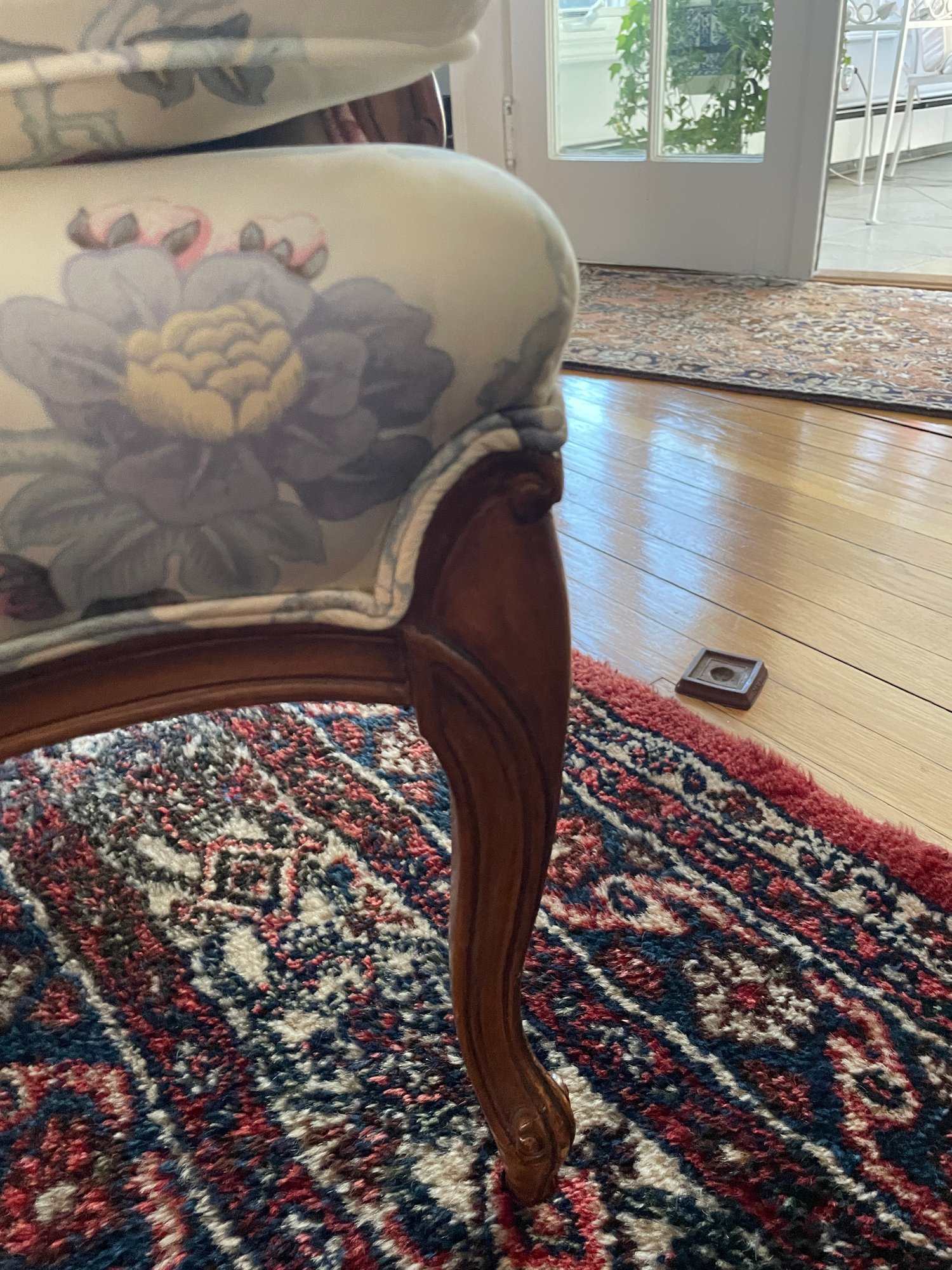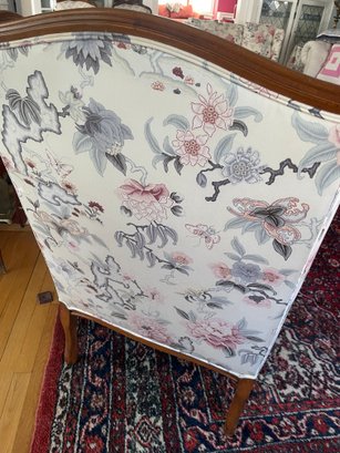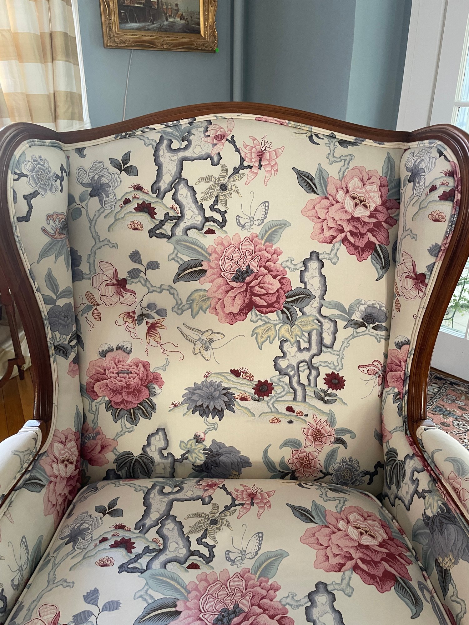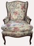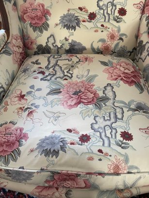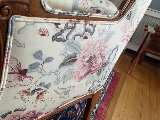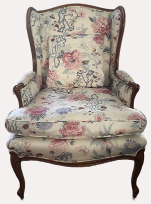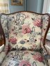 Vintage Queen Anne-style wingback chair features floral upholstery, cabriole legs, and a matching throw pillow, reminiscent of traditional 18th-century design