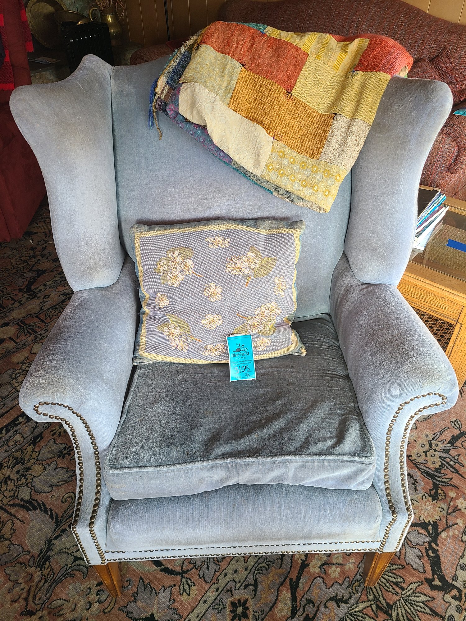 Accent chair measures 32in x 32in x 40in, with removable cushion. Some stains, pictured. Also includes a pillow and a quilt that measures 48in x 64in. Bring the appropriate vehicle to remove. Heavy bring help. Quilt is weathered, show in photos.
