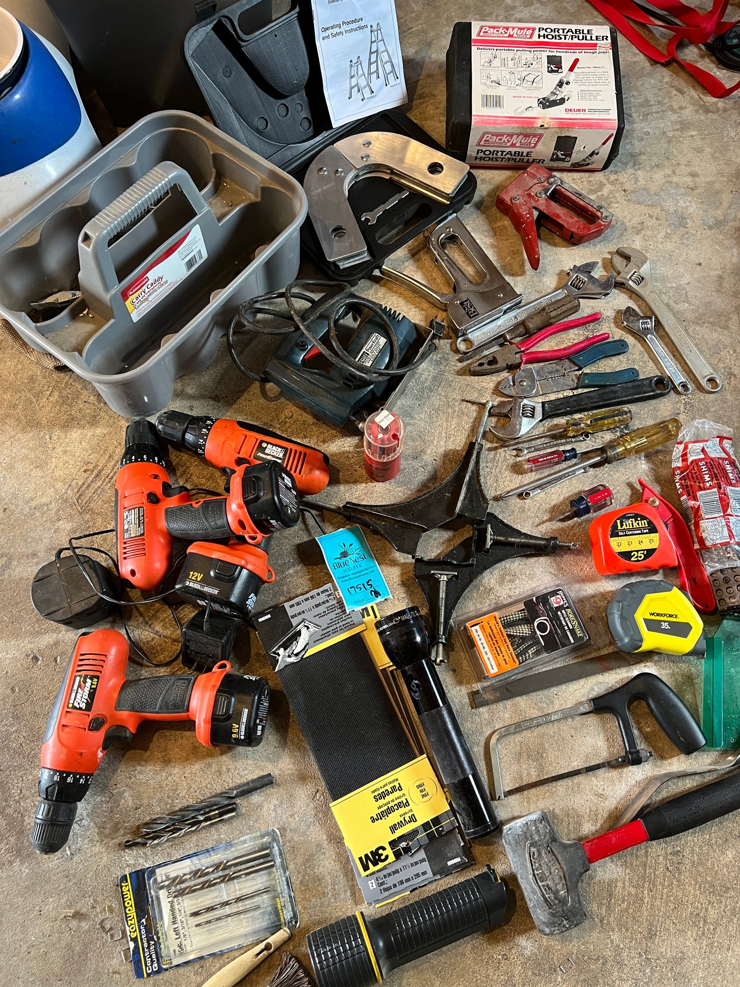 Pack Mule Hoist, Two Black And Decker 9.6volt Drills With Charger, one black and decker 12v drill, Maglite Flashlight, Ward Sabre Saw, crescent wrenches, tape measurers, drill bits, rubber mallet, shims, tool caddy. Please see pictures