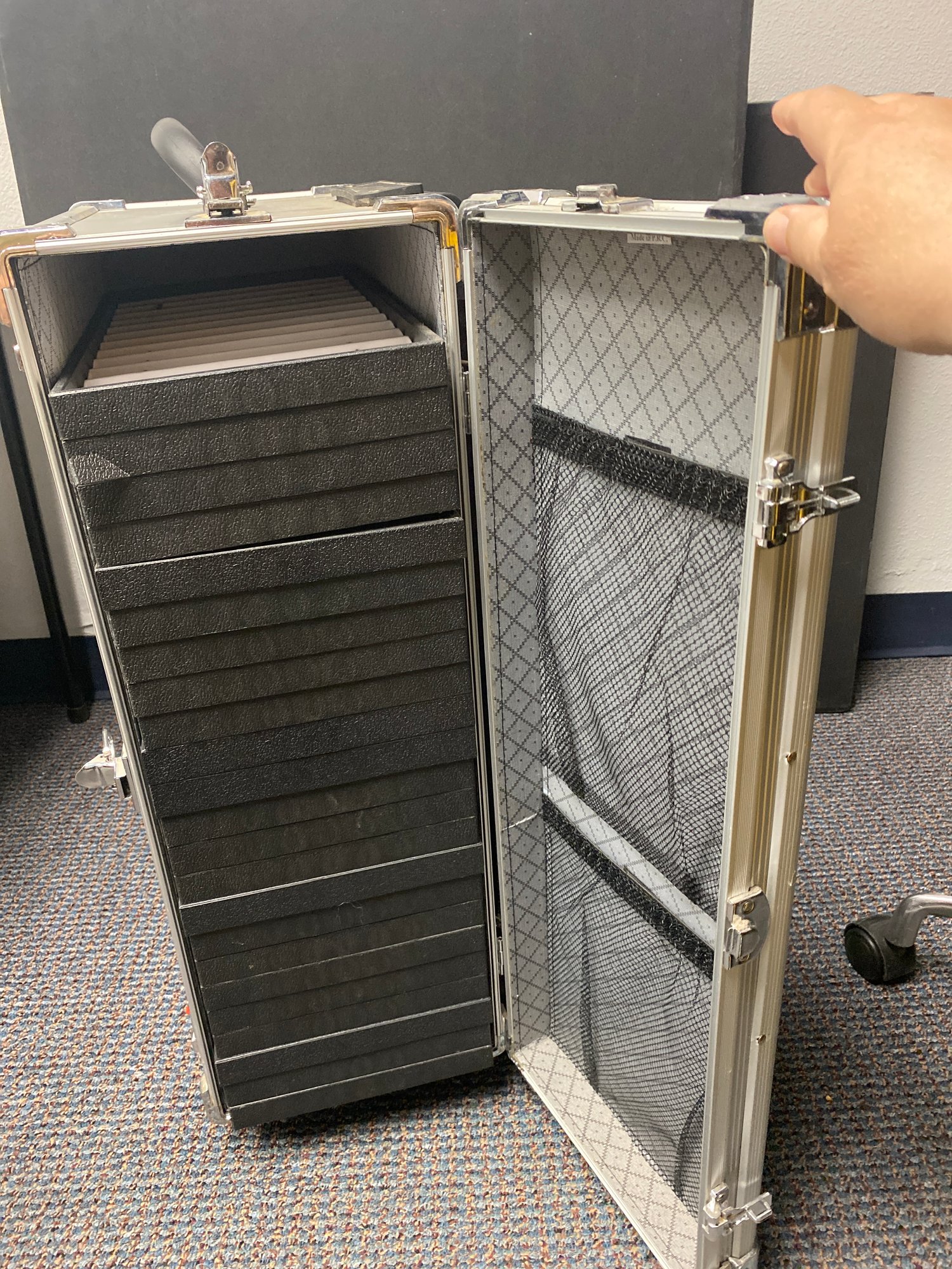 Silver wheeled locking chest with tray inserts. Measures 28 inches high x 17 inches wide x 11.5 inches deep.