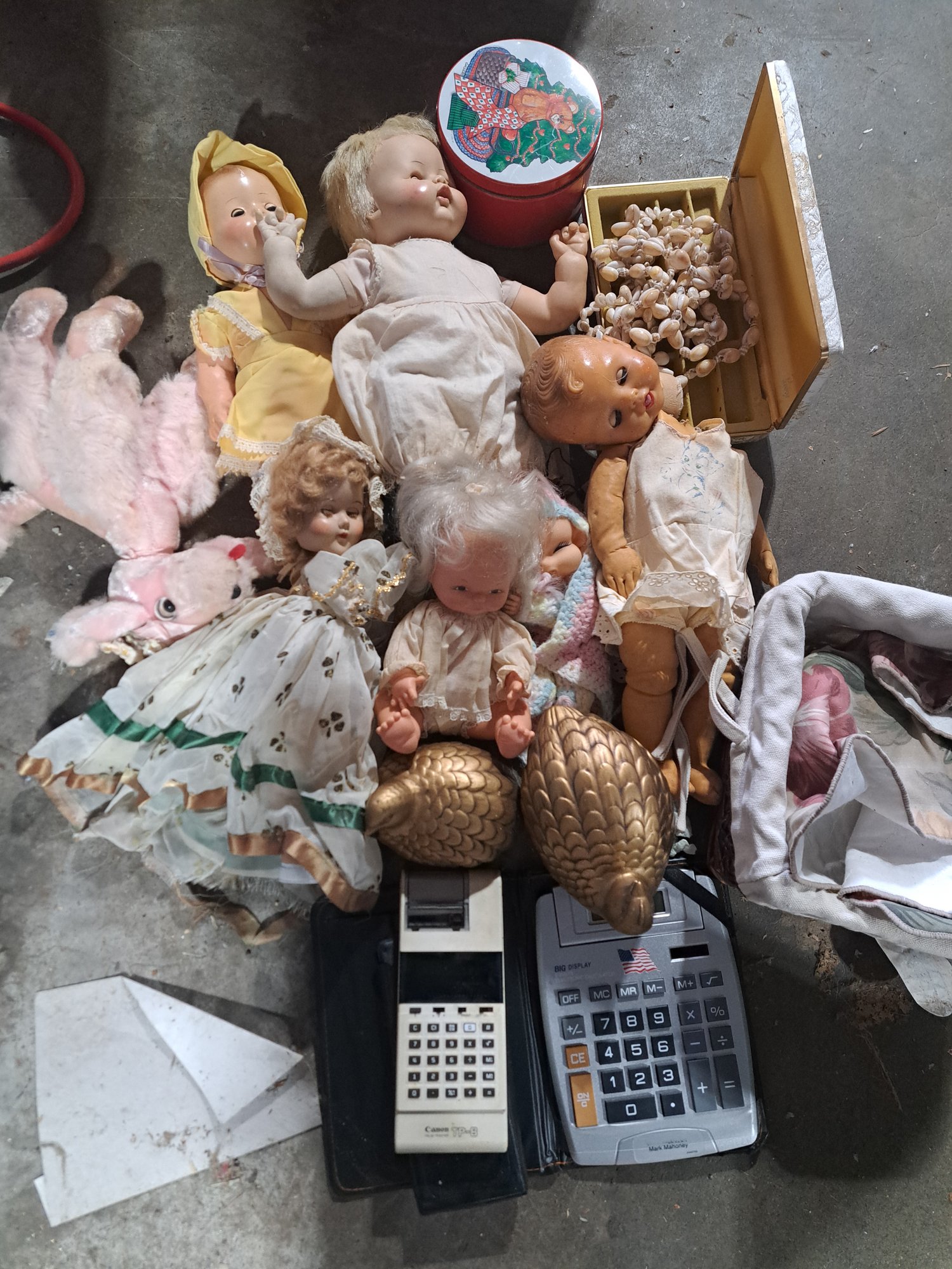 Antique Dolls, Calculators, Tin Can, Basket And Home Décor.