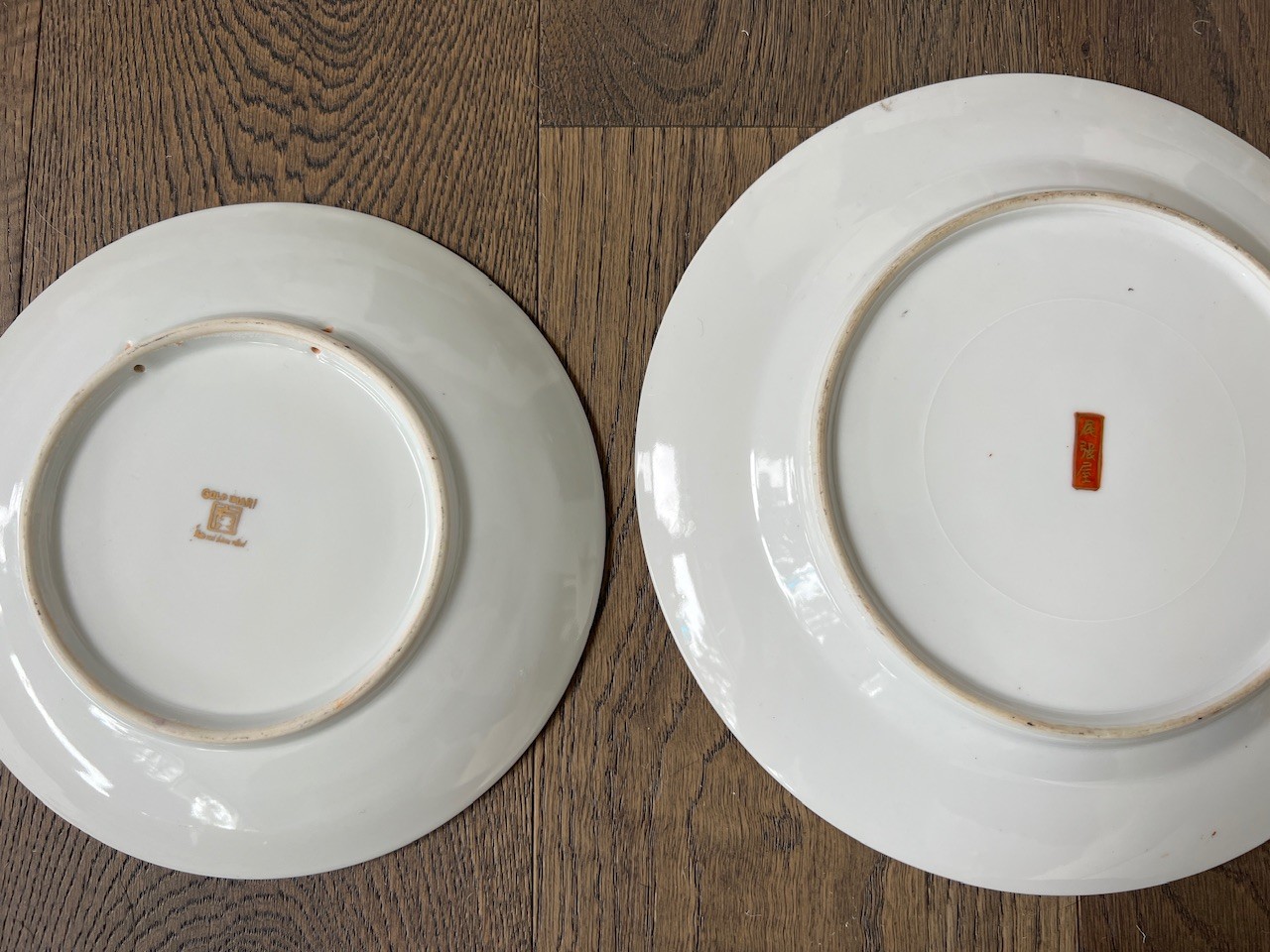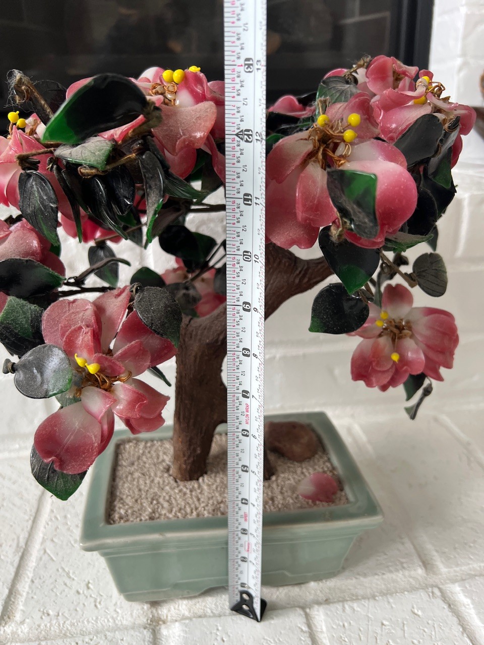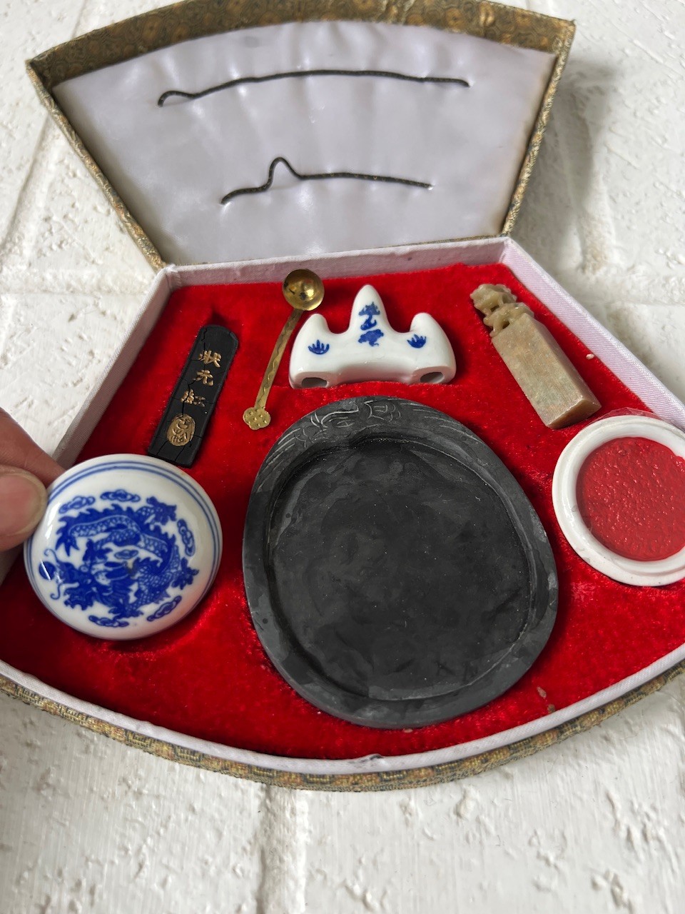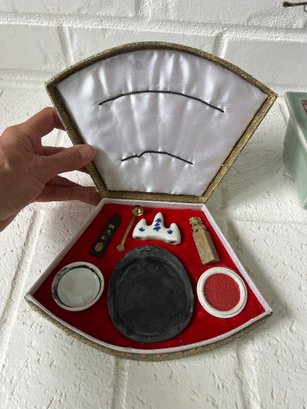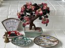 Asian Themed Decorations. Plates, Brass Bell, Jade Tree And Hand Stamp Kit