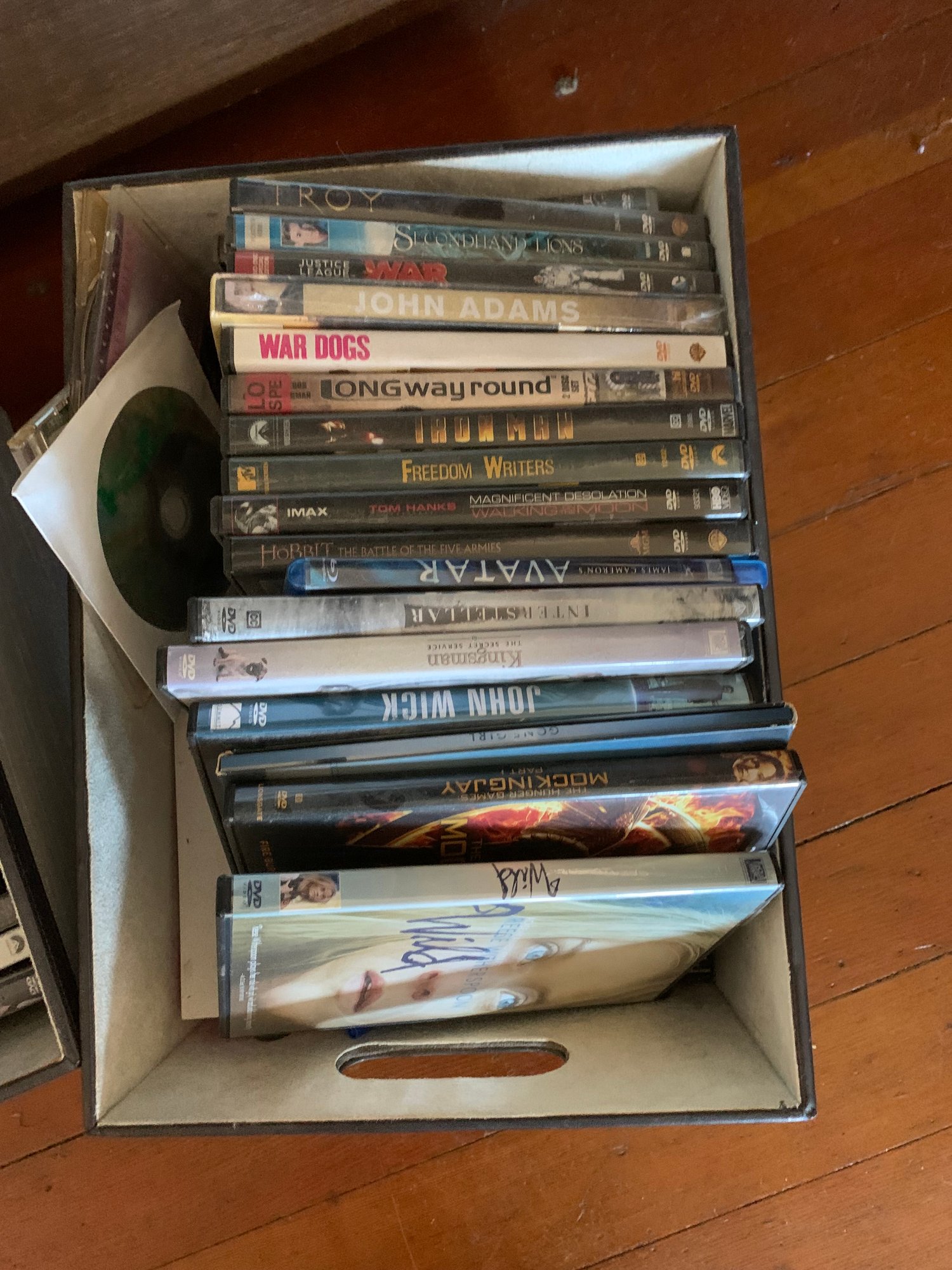 Assorted DVD’s, Assorted CD’s, 3 Storage Boxes, Toy Koala, Lamp, Clock