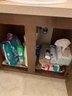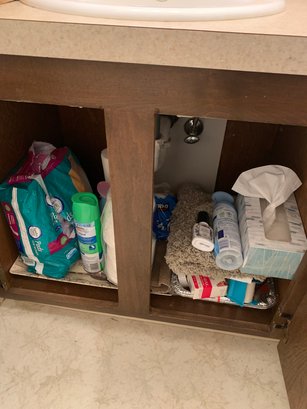 Bathroom/Laundry room Lot: Assorted Toiletries, Cleaning Supplies, Towel, Bathmat, Laundry hamper (top is broken), Crocs (size 9), Thinsulate Boots (size 7), women’s feminine pads, floral shower curtain with liner and rod, decorative signs, Swiffer with Swiffer cleaning supplies, packing paper