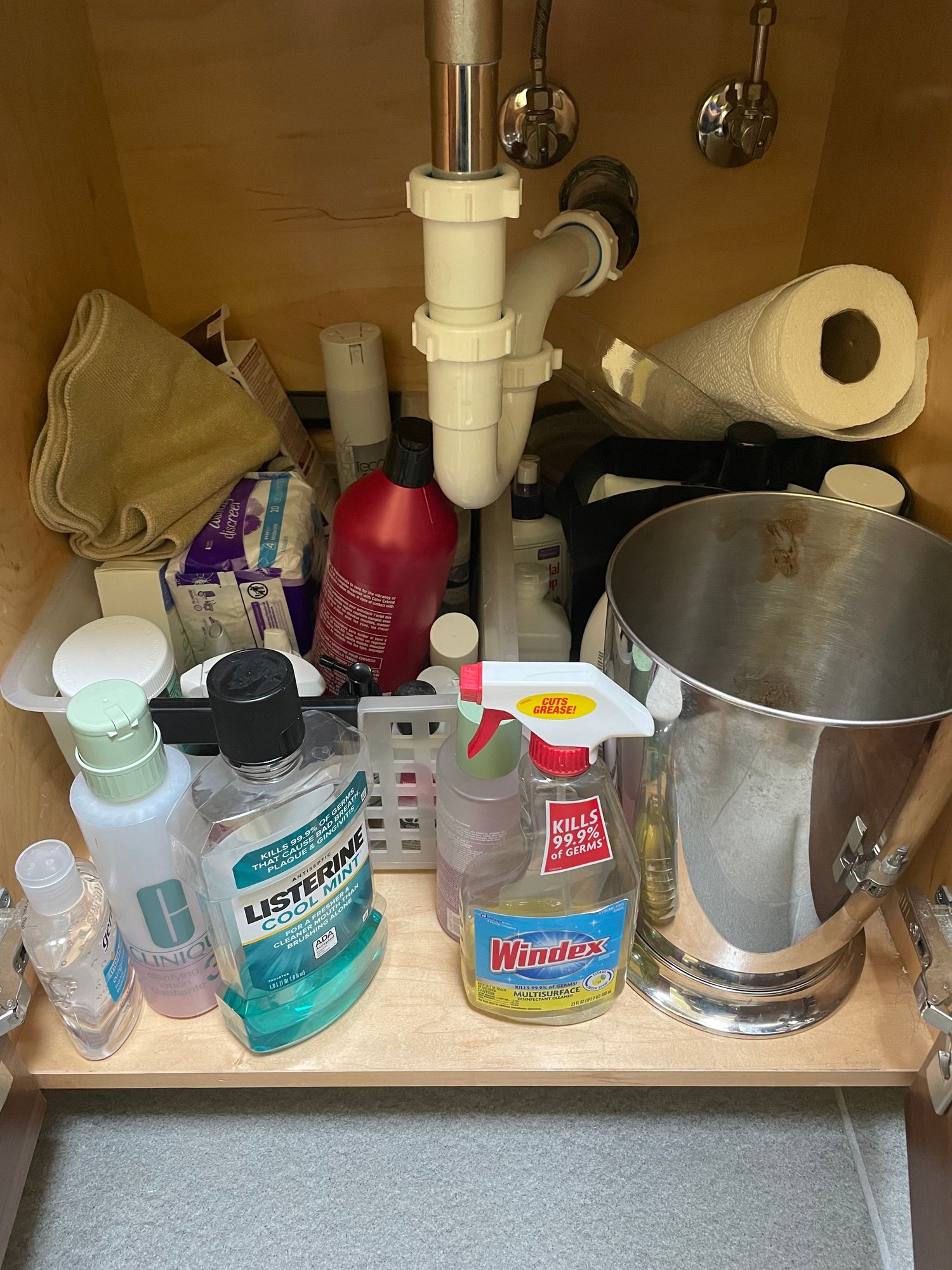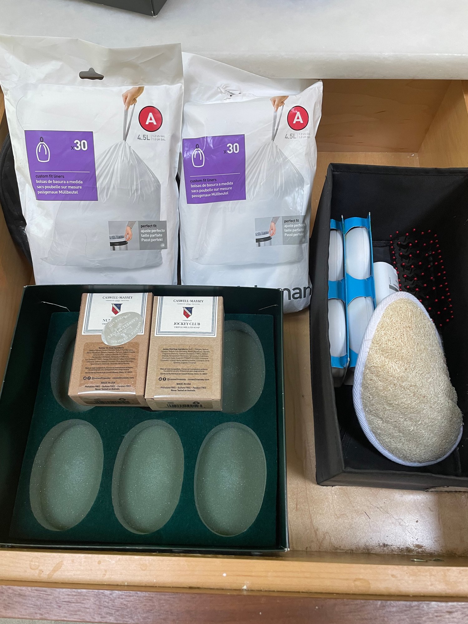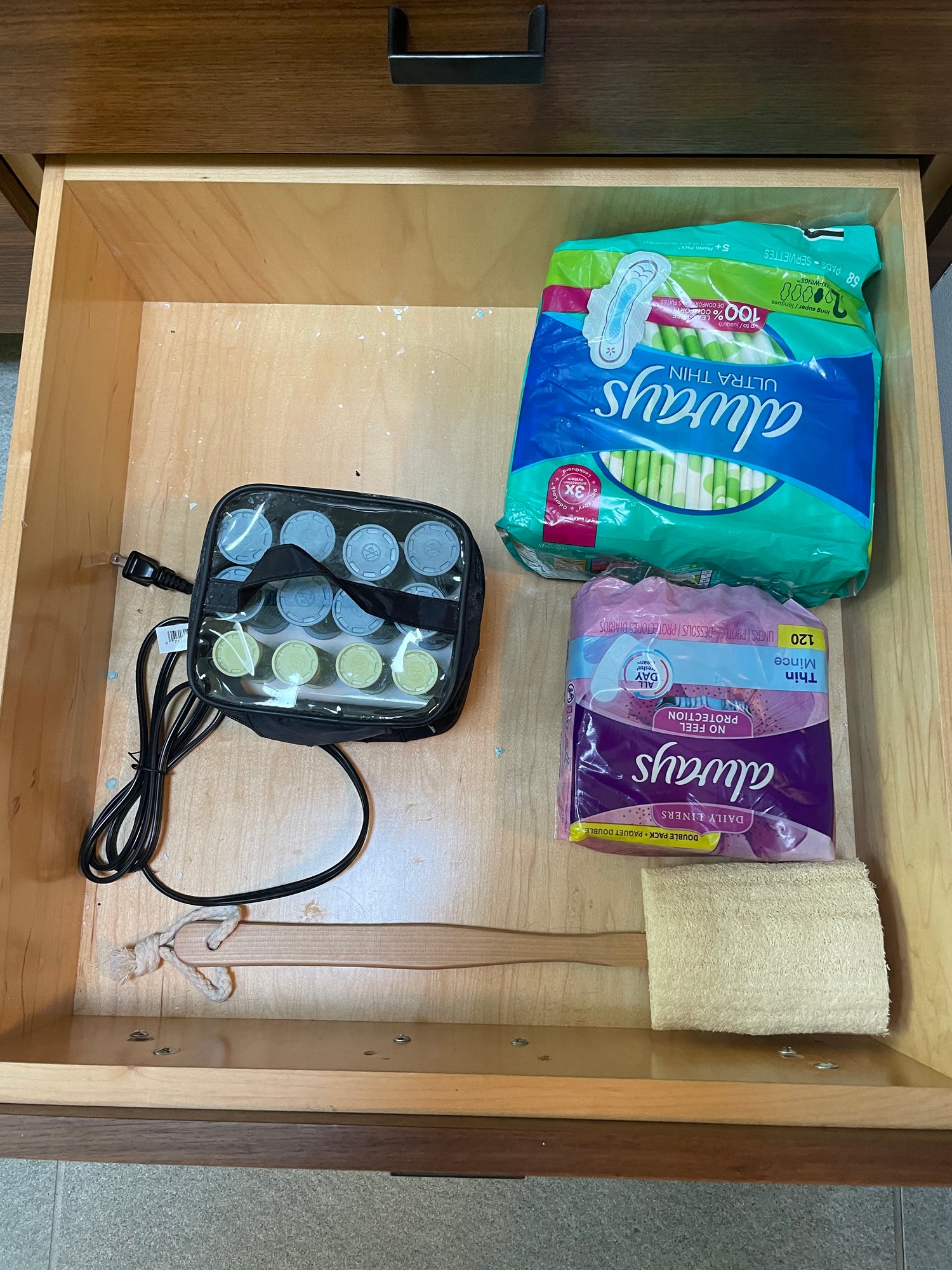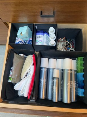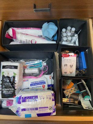 Bathroom Items To Include: Plastic Stools, Metal Waste Basket, And Assorted Hygiene Products and drawer organizers. Black stool measures 17 in x 12 in x 17 in. Gray stool measures 12 in x 17 in, round. See photos for full details of hygiene products and drawer organizers.