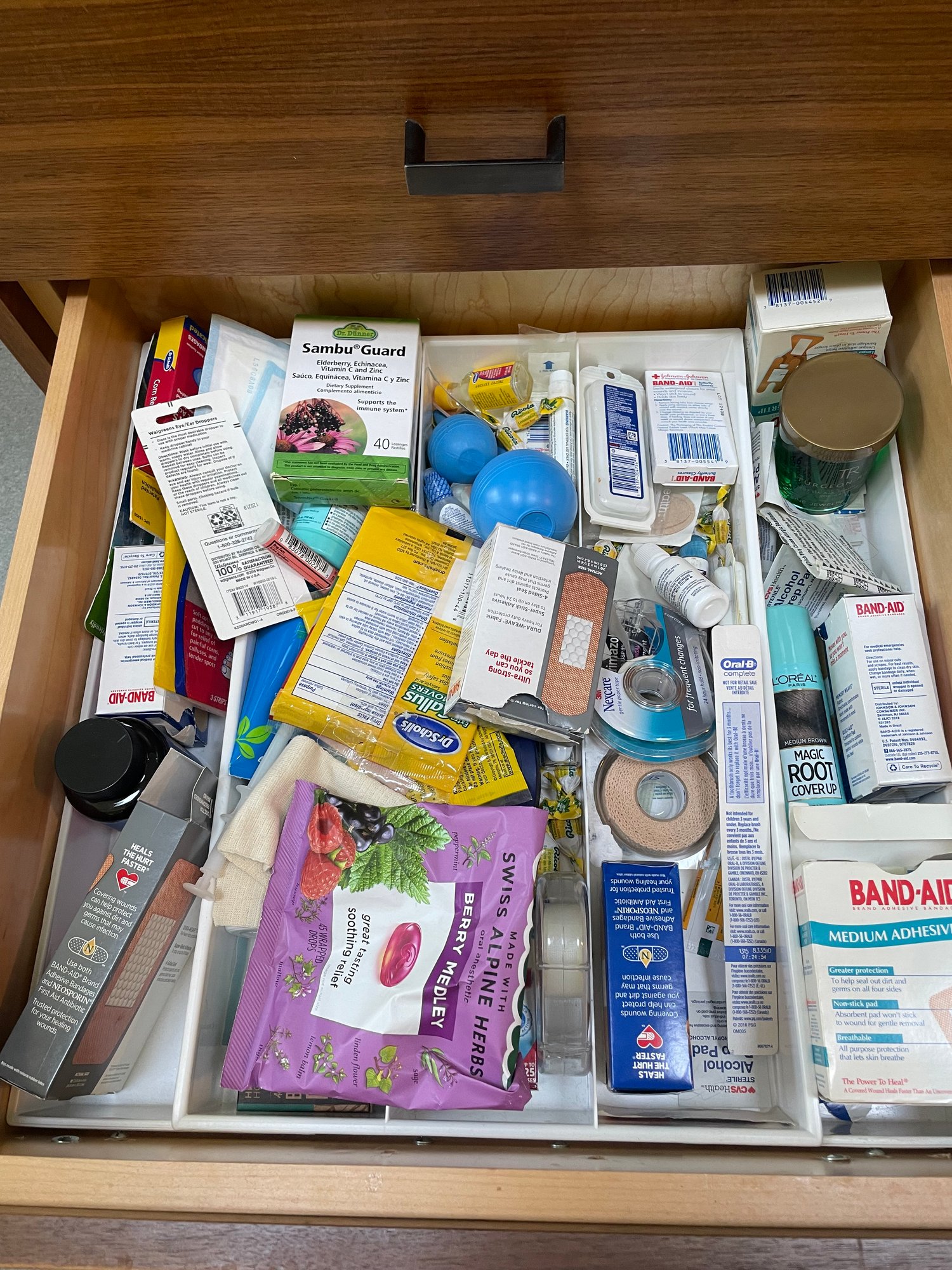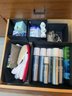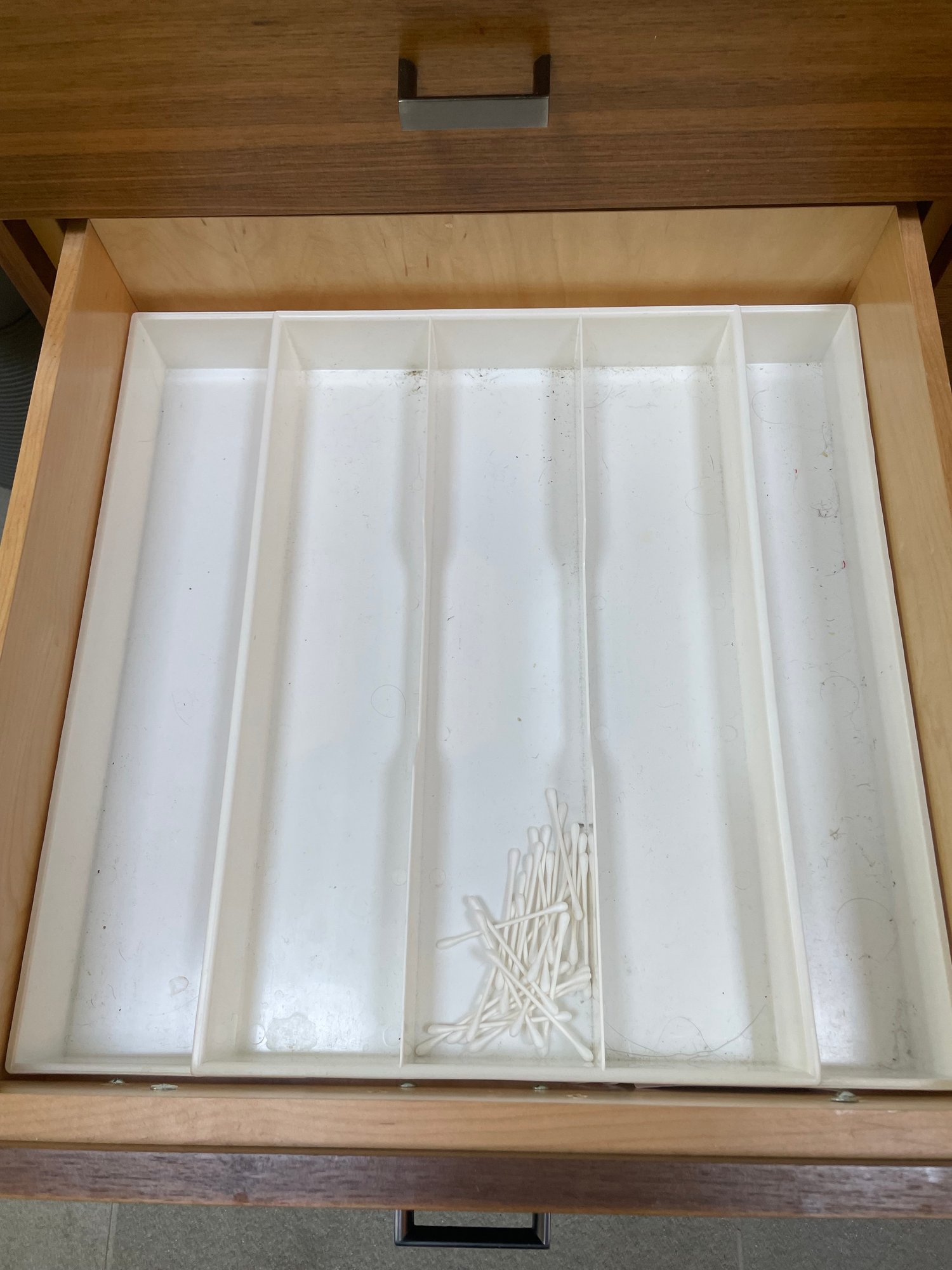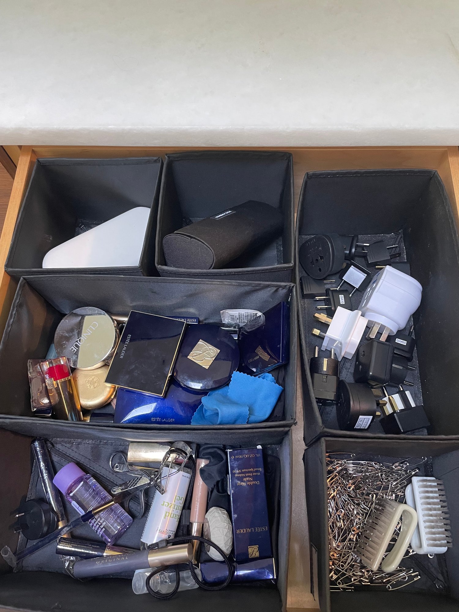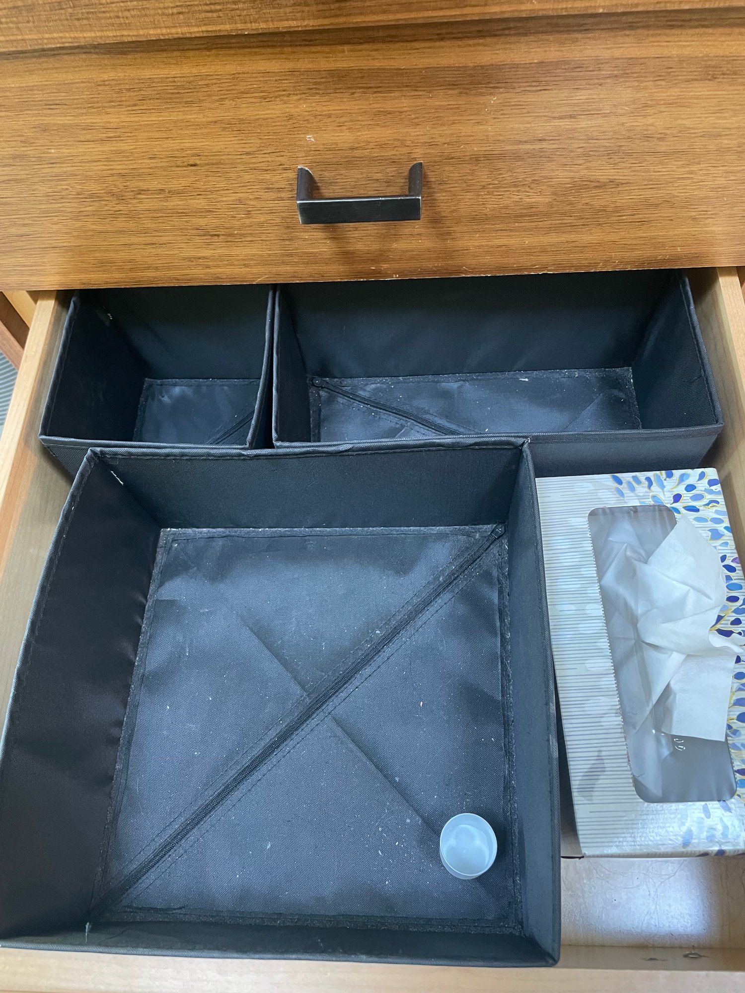 Bathroom Items To Include: Plastic Stools, Metal Waste Basket, And Assorted Hygiene Products and drawer organizers. Black stool measures 17 in x 12 in x 17 in. Gray stool measures 12 in x 17 in, round. See photos for full details of hygiene products and drawer organizers.