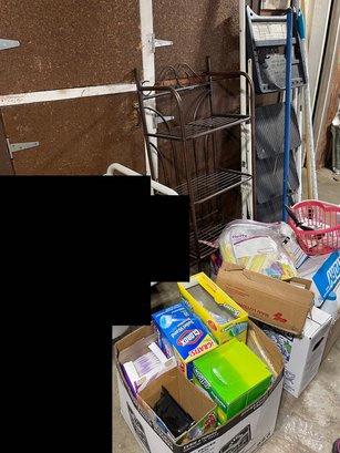 Bathroom Shelf, Bleach, Swiffer Dusters, Latex Gloves, Food Service Wiper, bathroom/cleaning supplies.