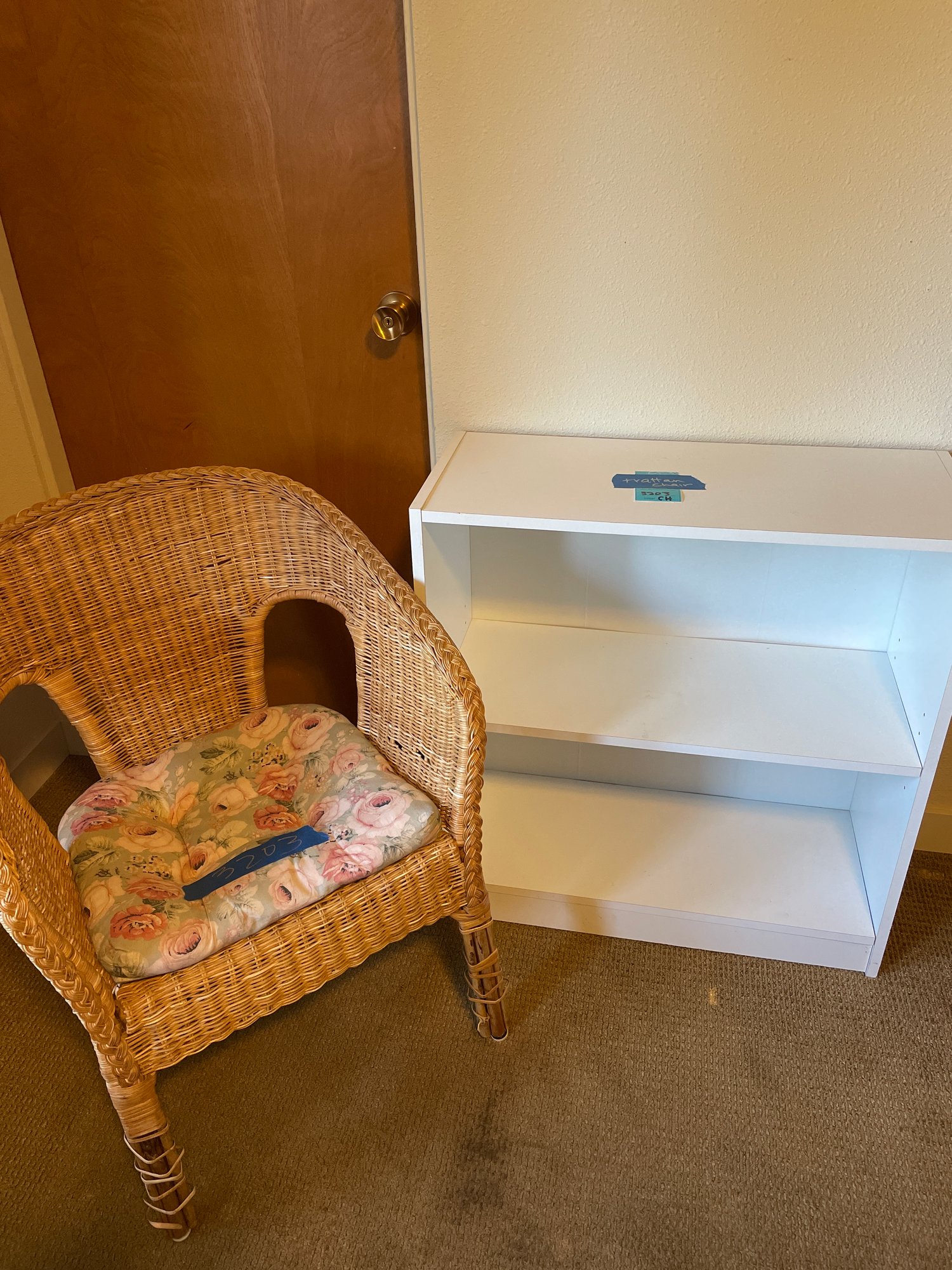 Bookcase measures 28in x 11in x 29.5in 2 . Rattan chair measures 23in x 18in x 29in. Heavy bring help.
