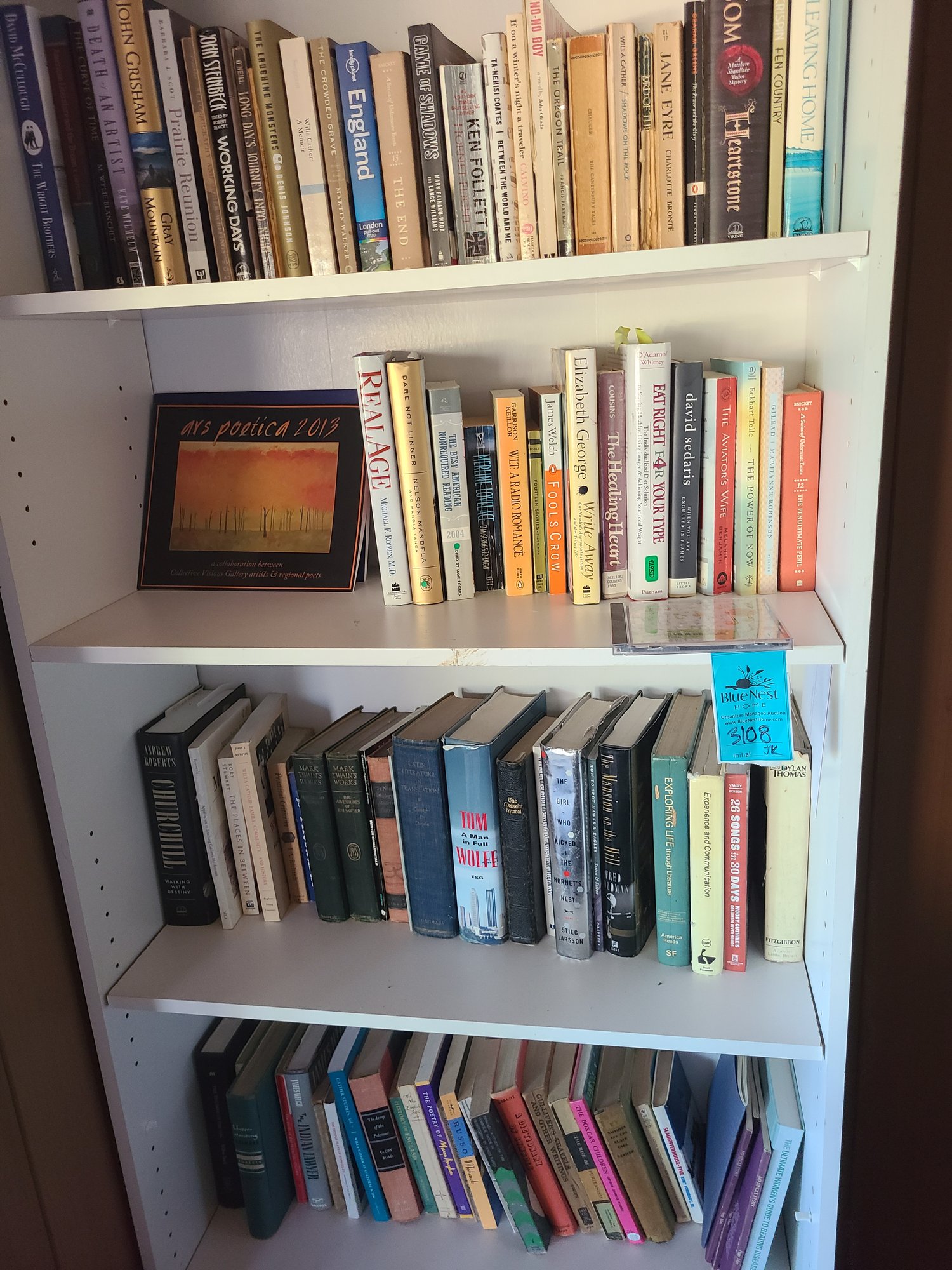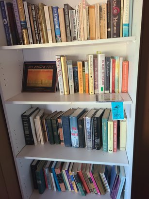 Wooden Book Shelf measures 30in x 12in x 72in and has some damage which is pictured. The lot also includes books of various authors, titles, and genres. Bring the appropriate vehicle to remove. Heavy bring help.
