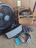 Bose Speaker, Lorell Fan, floor lamp that measures 69in (Broken lamp shades), Pelonis electric heater. Also includes headphones, remote, and Cords. Untested. Not Checked for completeness. Bring packing material.