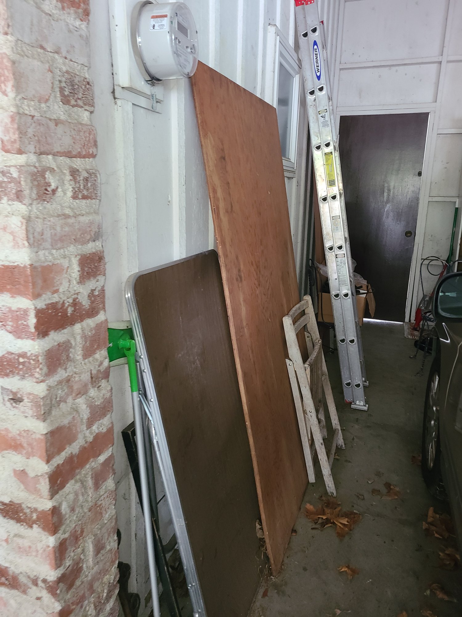 Buyer's Pick take what you want and leave the rest. Buyer Pick Includes gardening cans, 16ft ladder, wood, chairs, lamps, baskets, gardening tools, shelving units. TRASH CANS NOT INCLUDED. Bring appropriate vehicle to remove. Heavy Bring help to. Untested. Not checked for completeness.