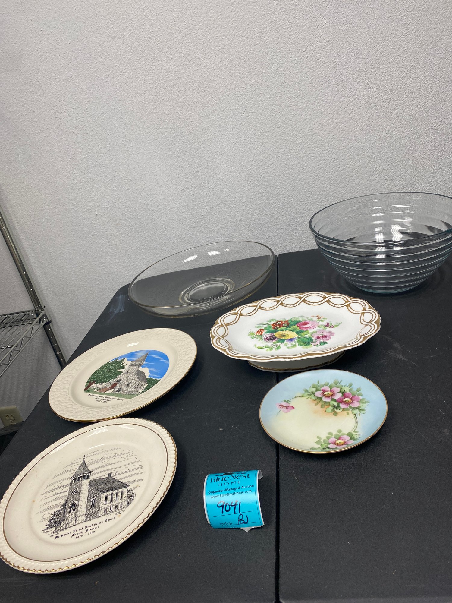 Footed oval porcelain platter 2 inches high x 11 inches wide x 8.5 inches deep. Some ware on gold paint. Nippon hand painted cherry blossom plate 6.5 inches diameter. Two commemorative Missouri church plates 9.5 and 10.5 inches diameter. Large glass shallow bowl 13 inches diameter. Large beehive glass bowl 11 inches diameter.