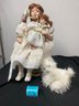 21 inches large doll. Doll has permanent bent legs, is a sitting doll. 10 inch small doll. Cat 10 inches long. Chair 16 inches tall. Dolls appear to be handmade.