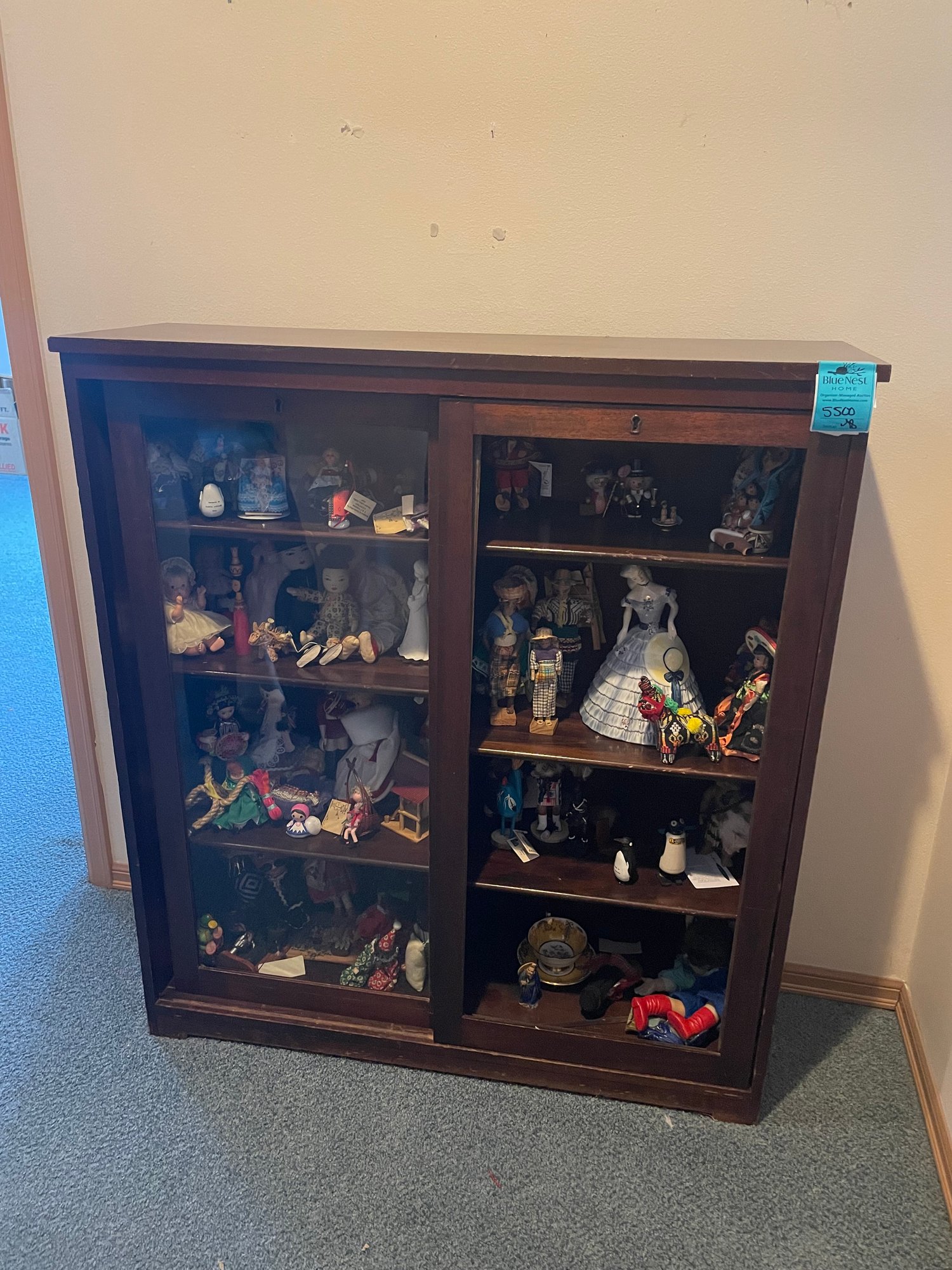 Mid century modern wooden curious cabinet. Contents NOT included. Two sliding doors, one with glass front, one without. Each side has three adjustable shelves. Measures 40 in x 12 in x 44 in. Located upstairs.