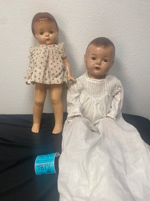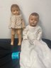 24 inch Dionne Quintuplet Alexander baby doll wearing antique christening gown. 19 inch Patsy Ann Effanbee doll. Crazing is present. Antique condition.