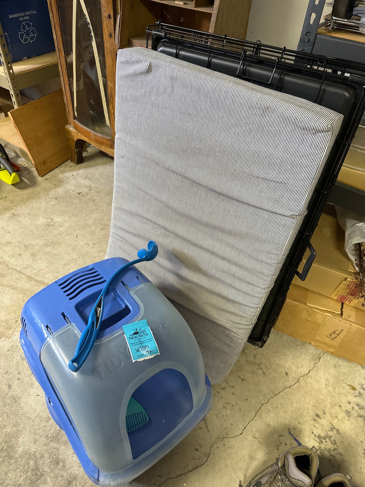 Dog Crate measures 36in x 22in x 26in, Kitty Litter Box measures 17in x 20in x 17in, And Chuck It Toy. Not checked for safety standards. Not checked for completeness.
