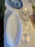 Fish Platter, 2 Small Pyrex Bowls With Lids, Delfts Decorative Platter, Glass Decorative Tray. Located in room 3. Fish platter measures 17 in x 8 in.